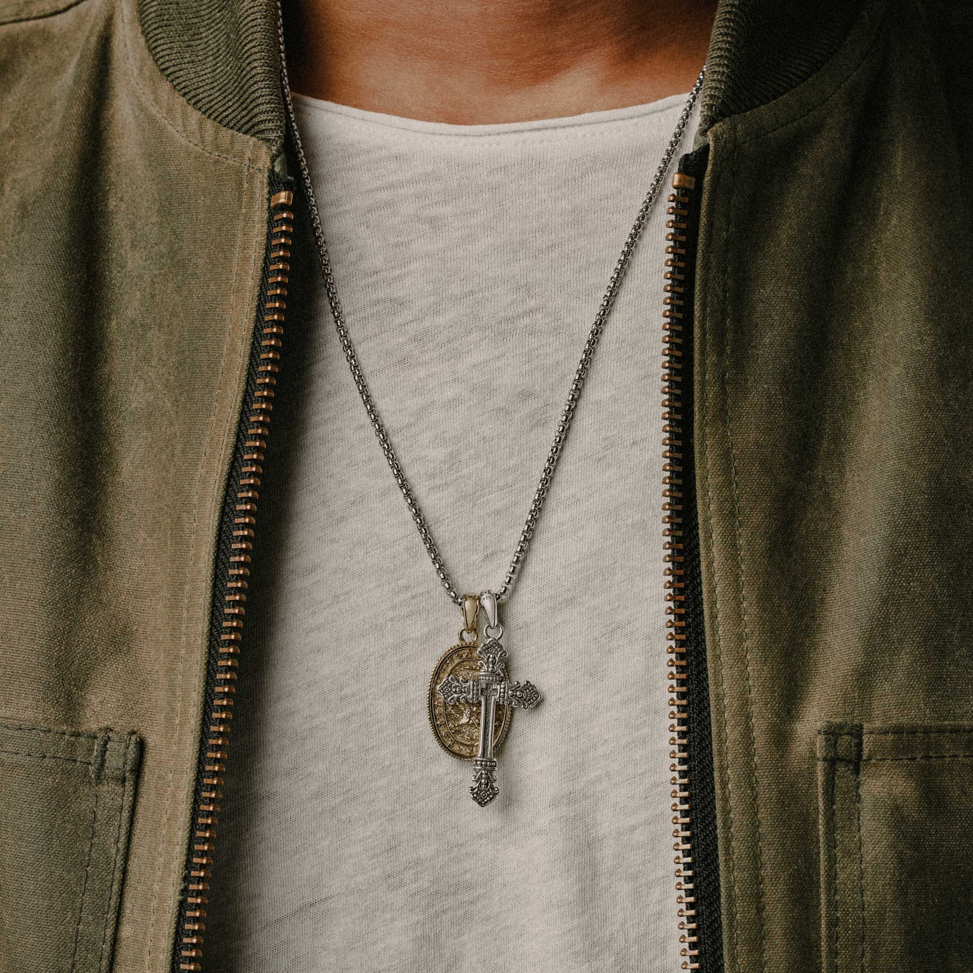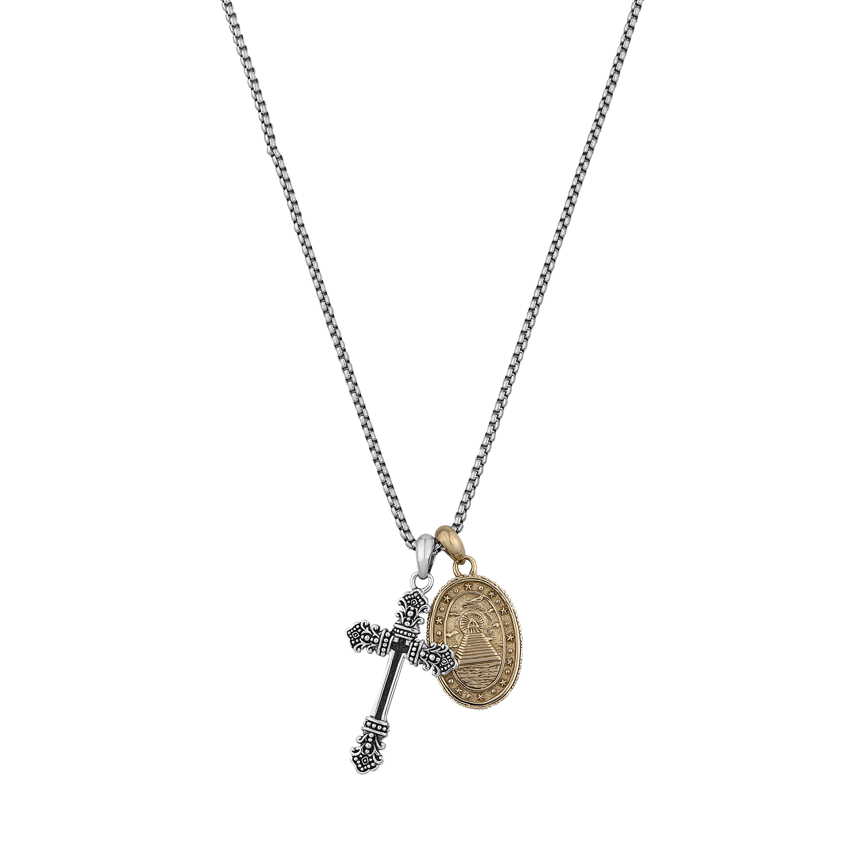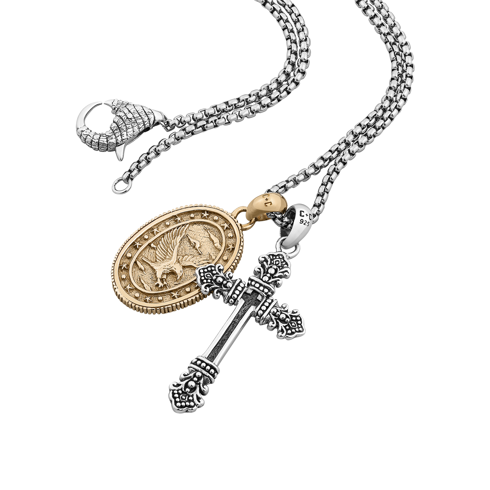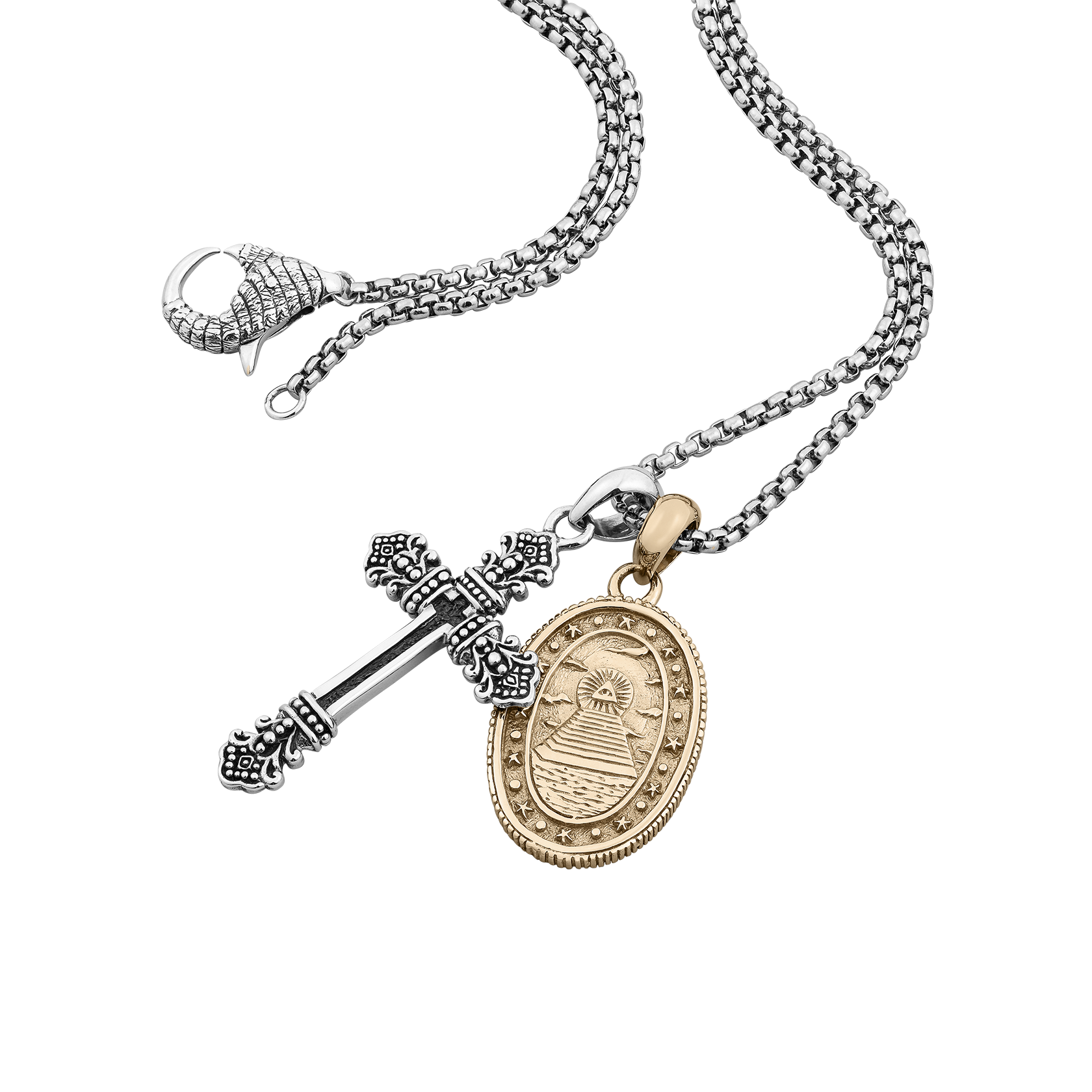 Handcrafted Sterling Silver and Brass pendants. Comes on a 65cm x 2.4mm stainless steel rounded box chain with custom silver eagle talon clasp. Pendants can be removed and worn individually.