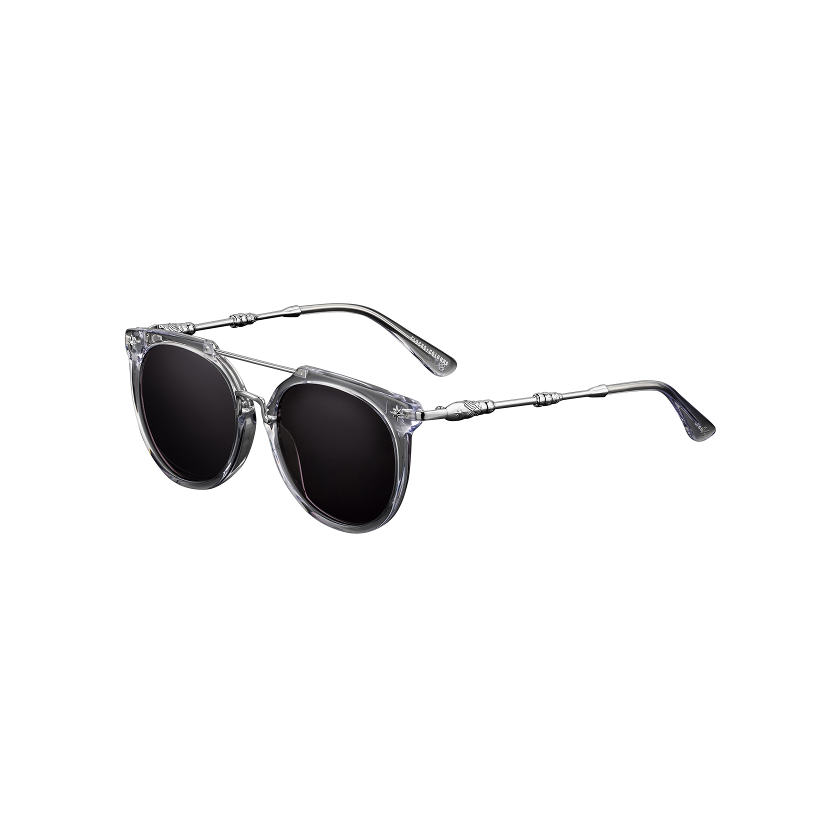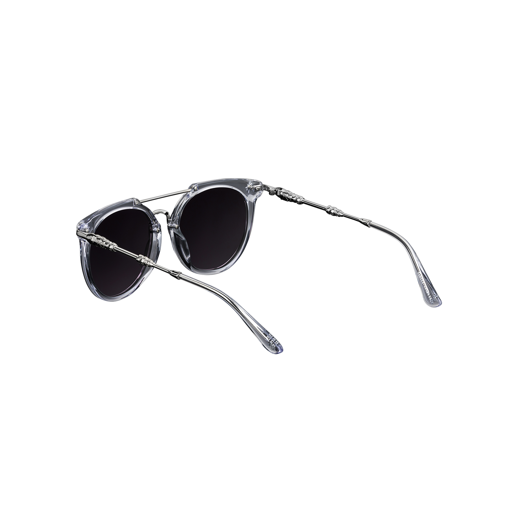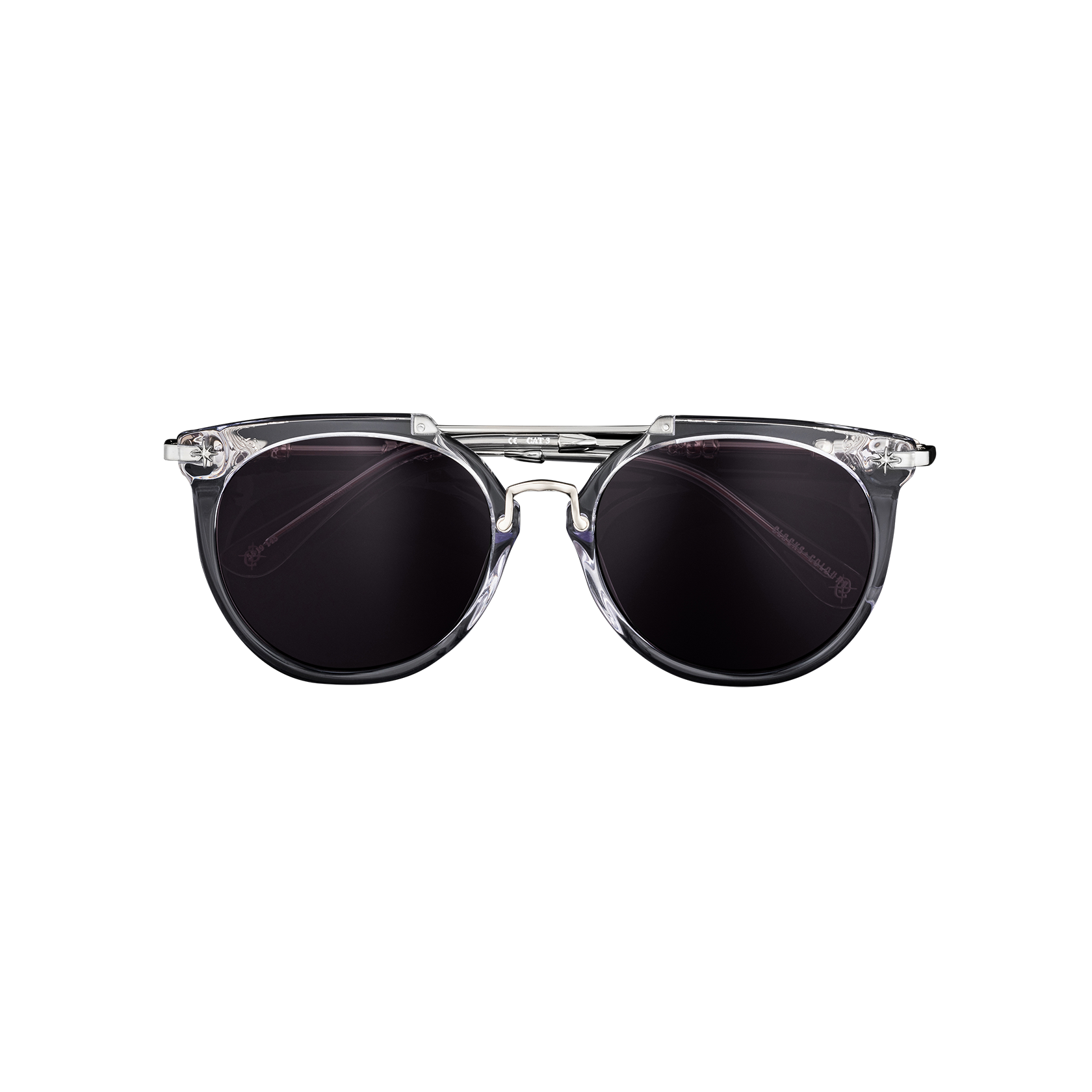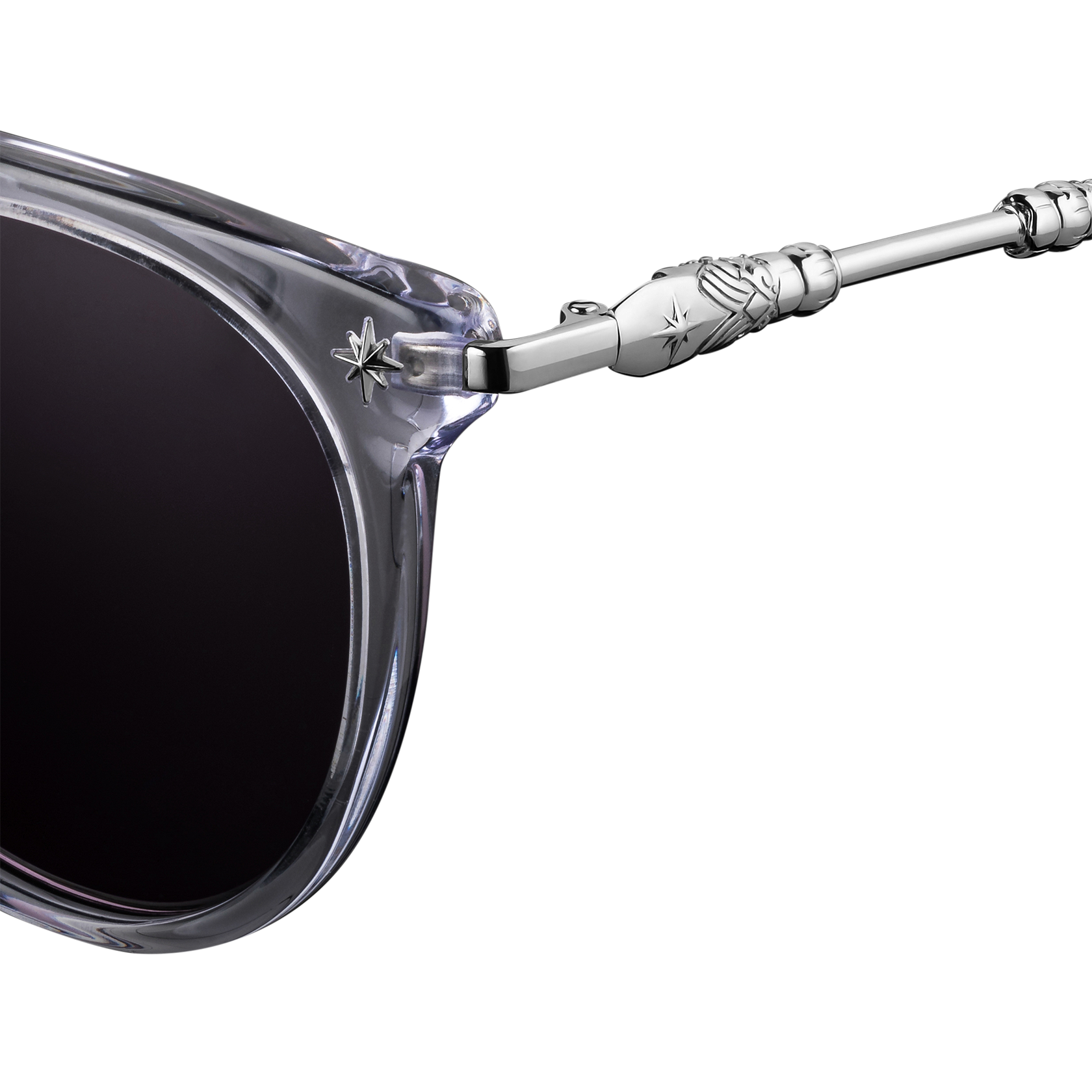 Clear acetate frame with deep purple tinted lenses and polished stainless steel details.