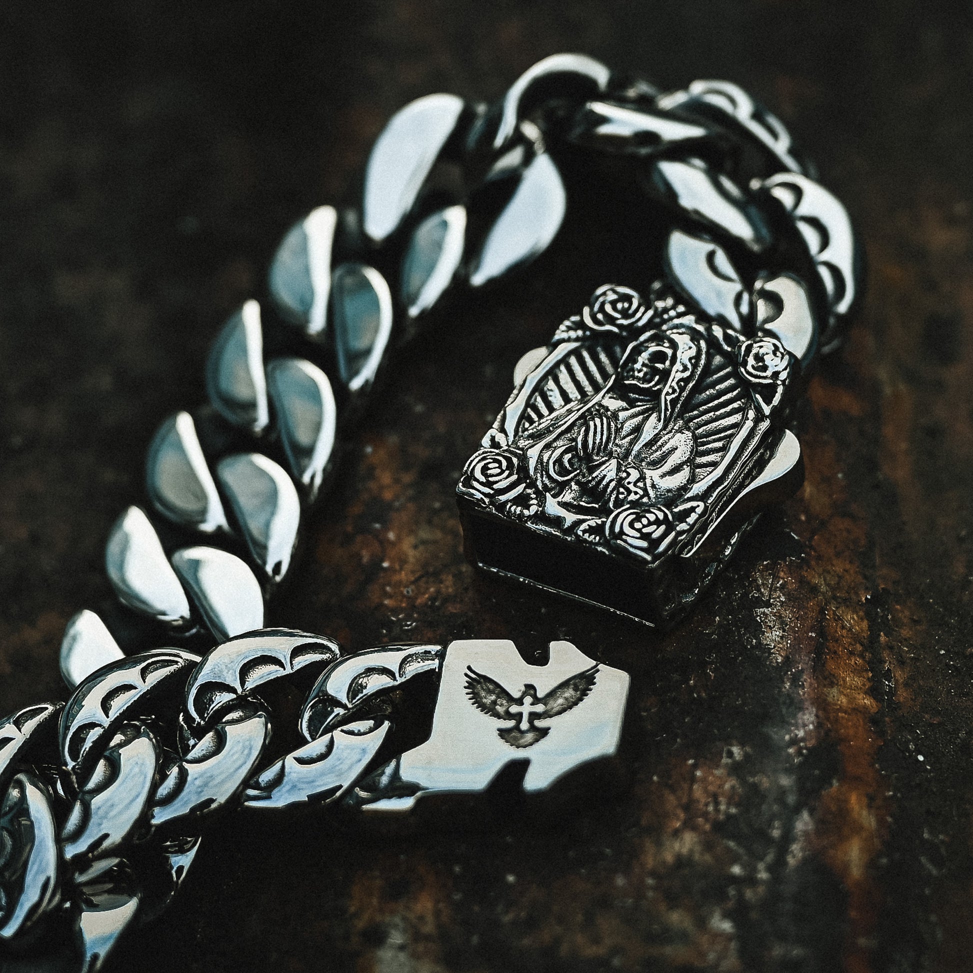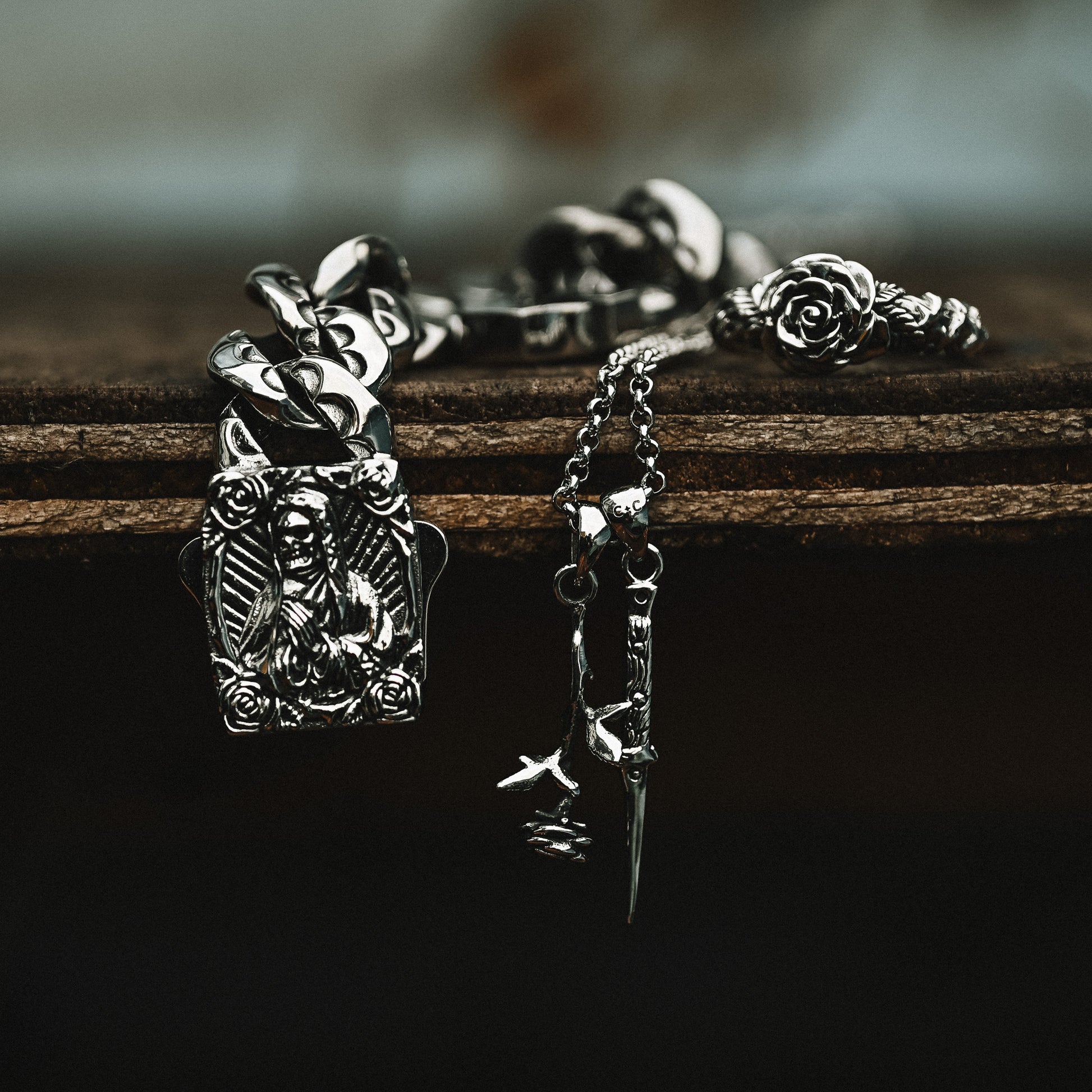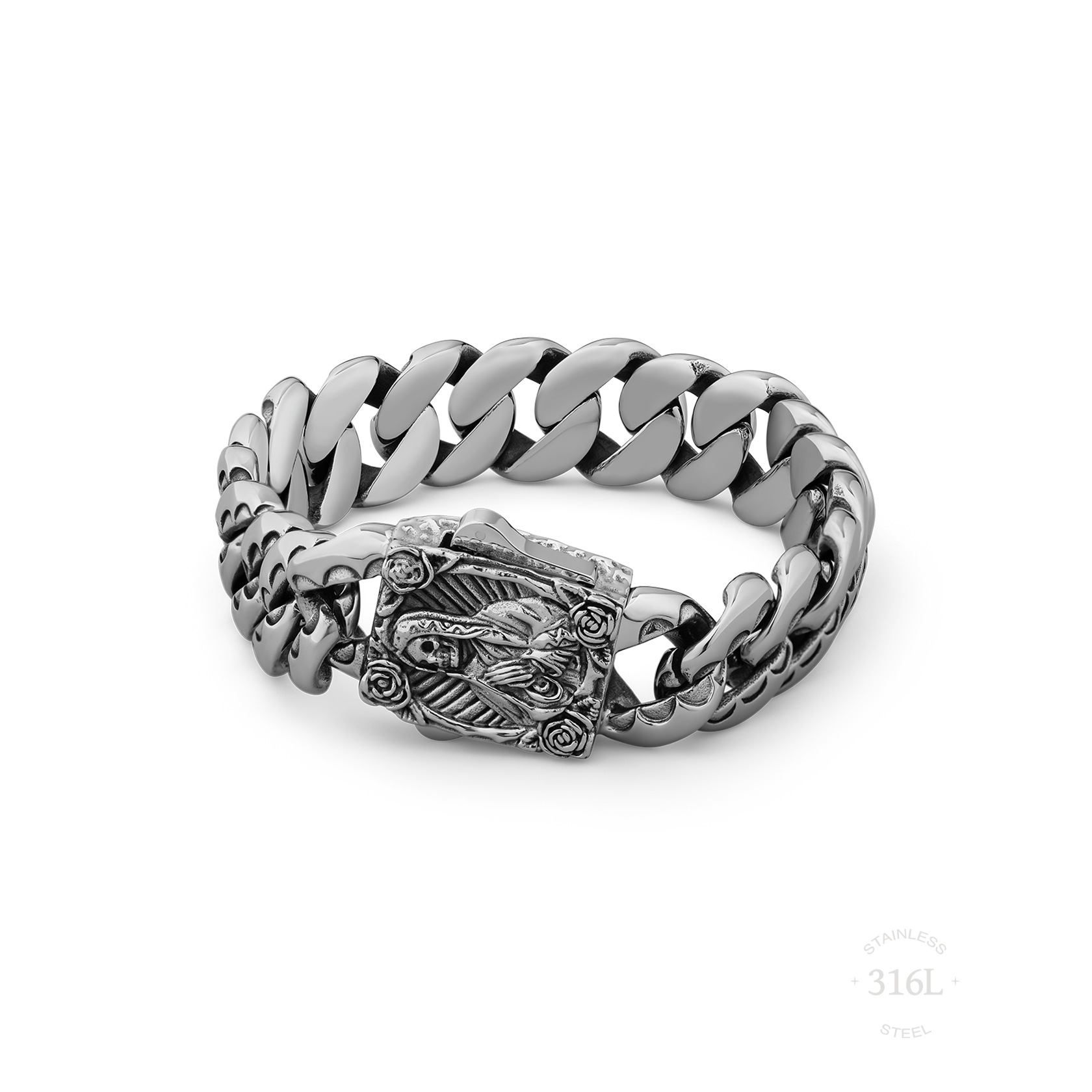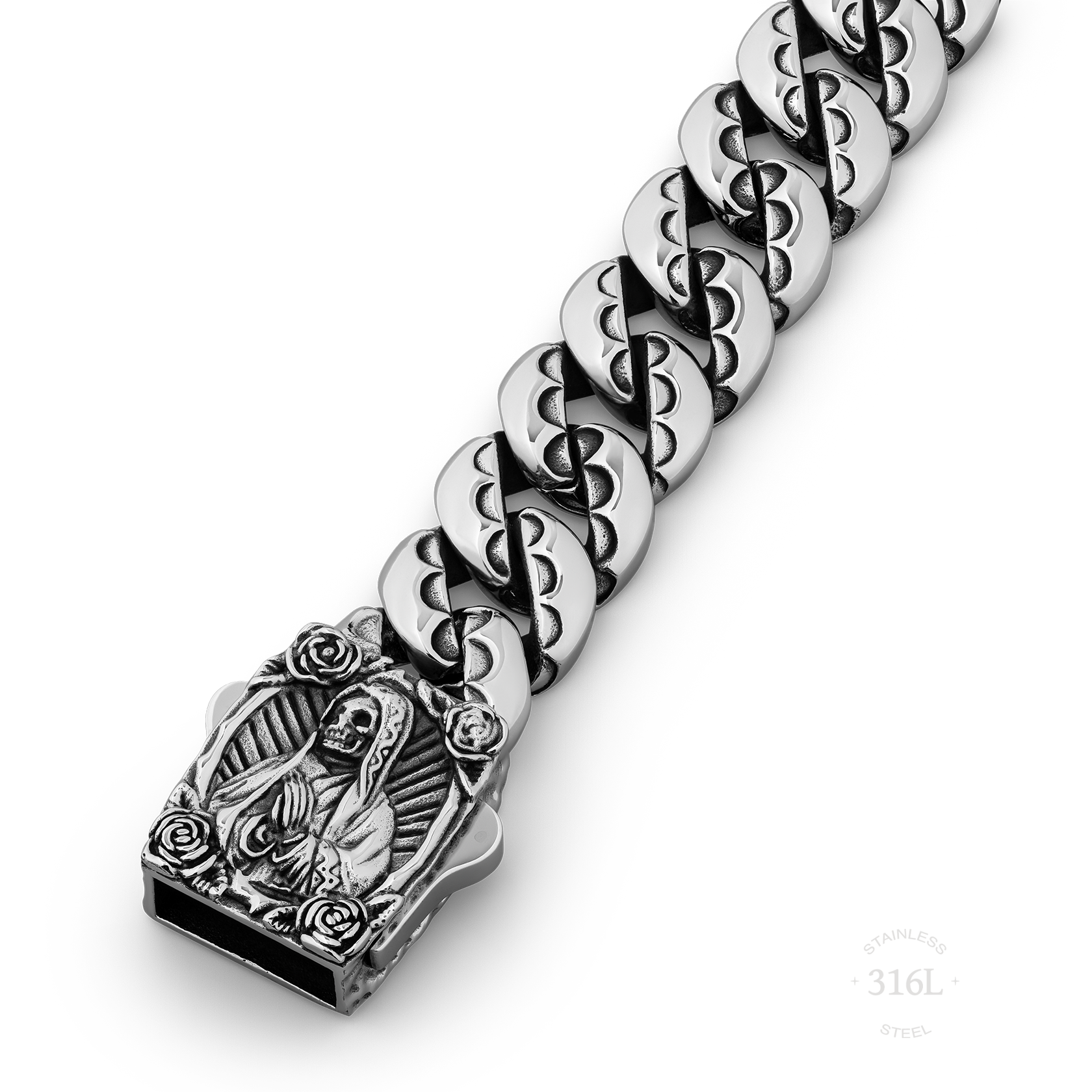 The Apparition bracelet is a symbol of devotion to the shadowy guide of the afterlife, Santa Muerte. With each link bearing intricate designs, this piece locks in place as if binding one’s spirit to her protection. For those who walk unafraid of the mysteries beyond, this bracelet is both shield and symbol, a pact with the unseen.