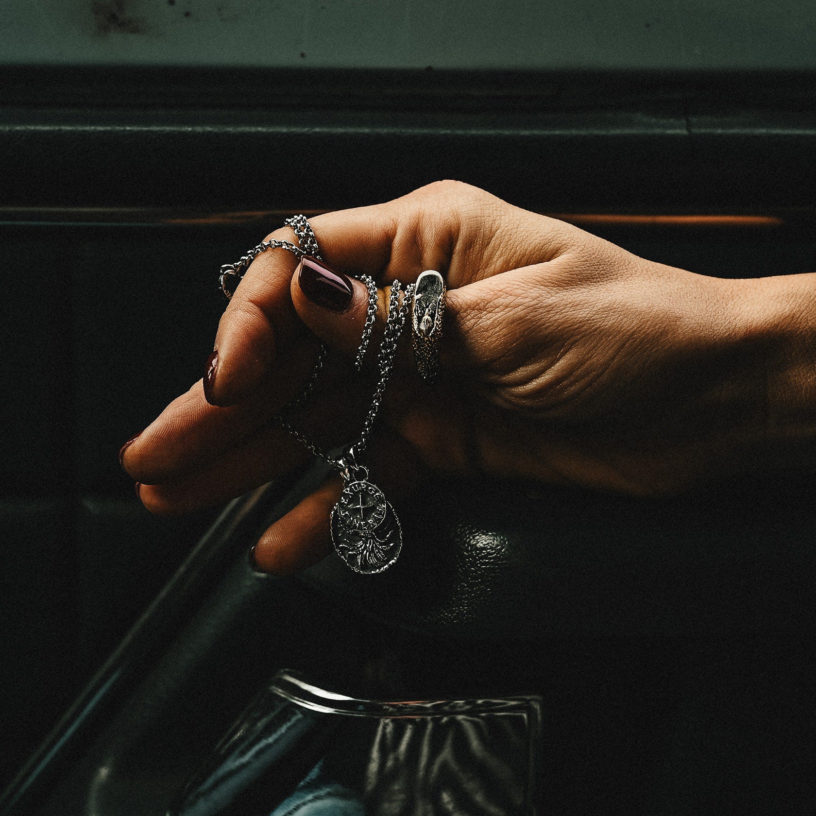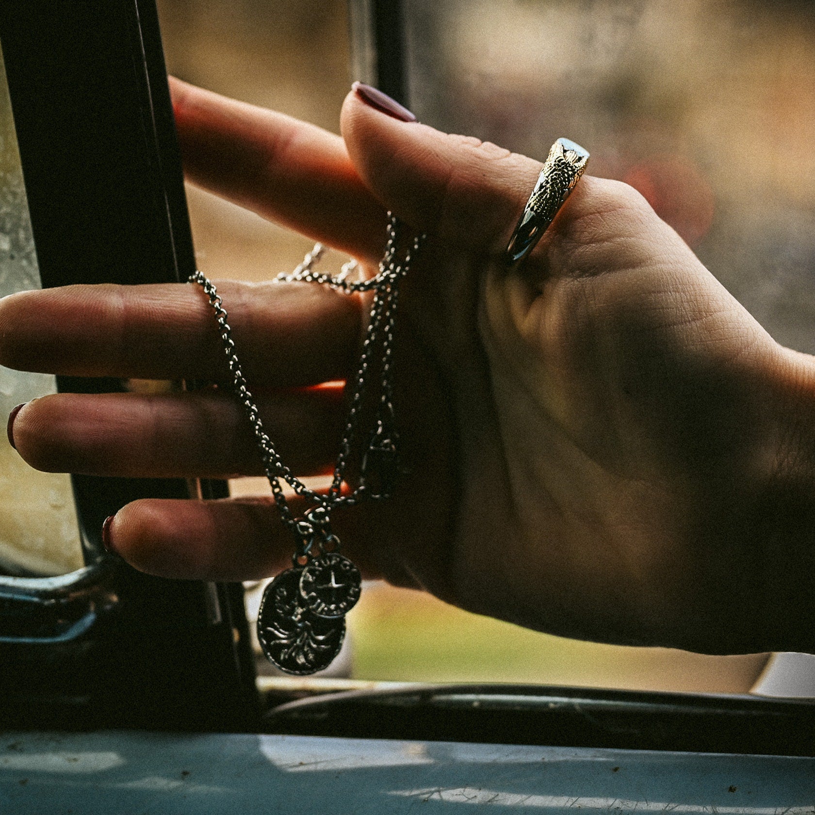 Our jewelry is cast from .925 sterling silver and surgical-grade stainless steel, rigorously tested for purity, strength, and longevity. We source real, ethically mined stones for their texture and natural character, setting each one by hand to lock in both beauty and durability.
