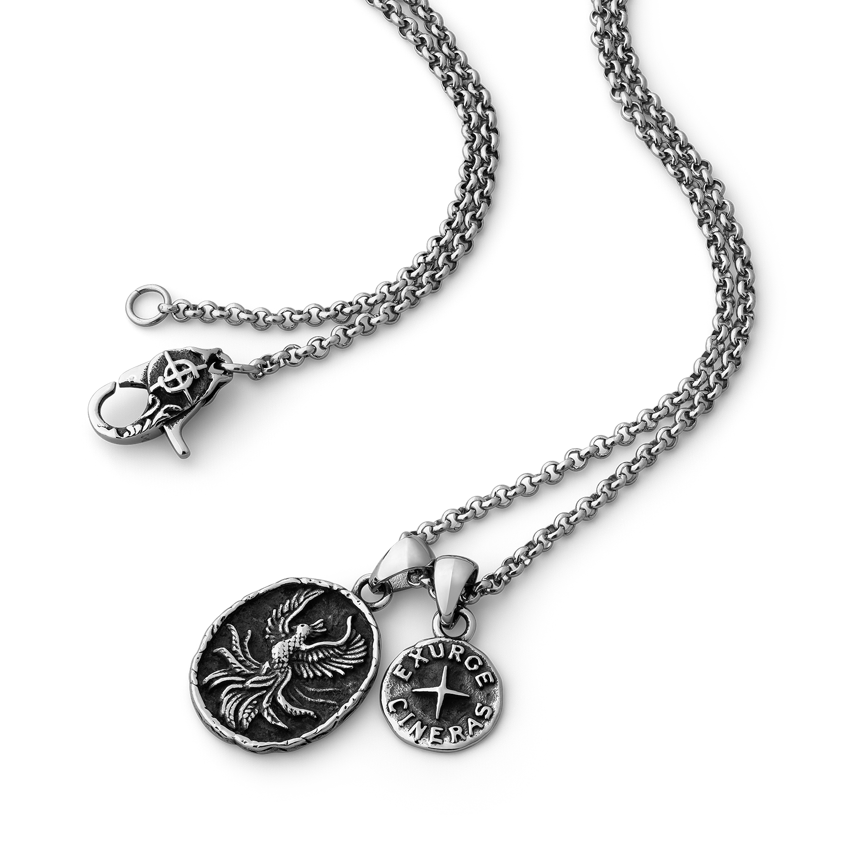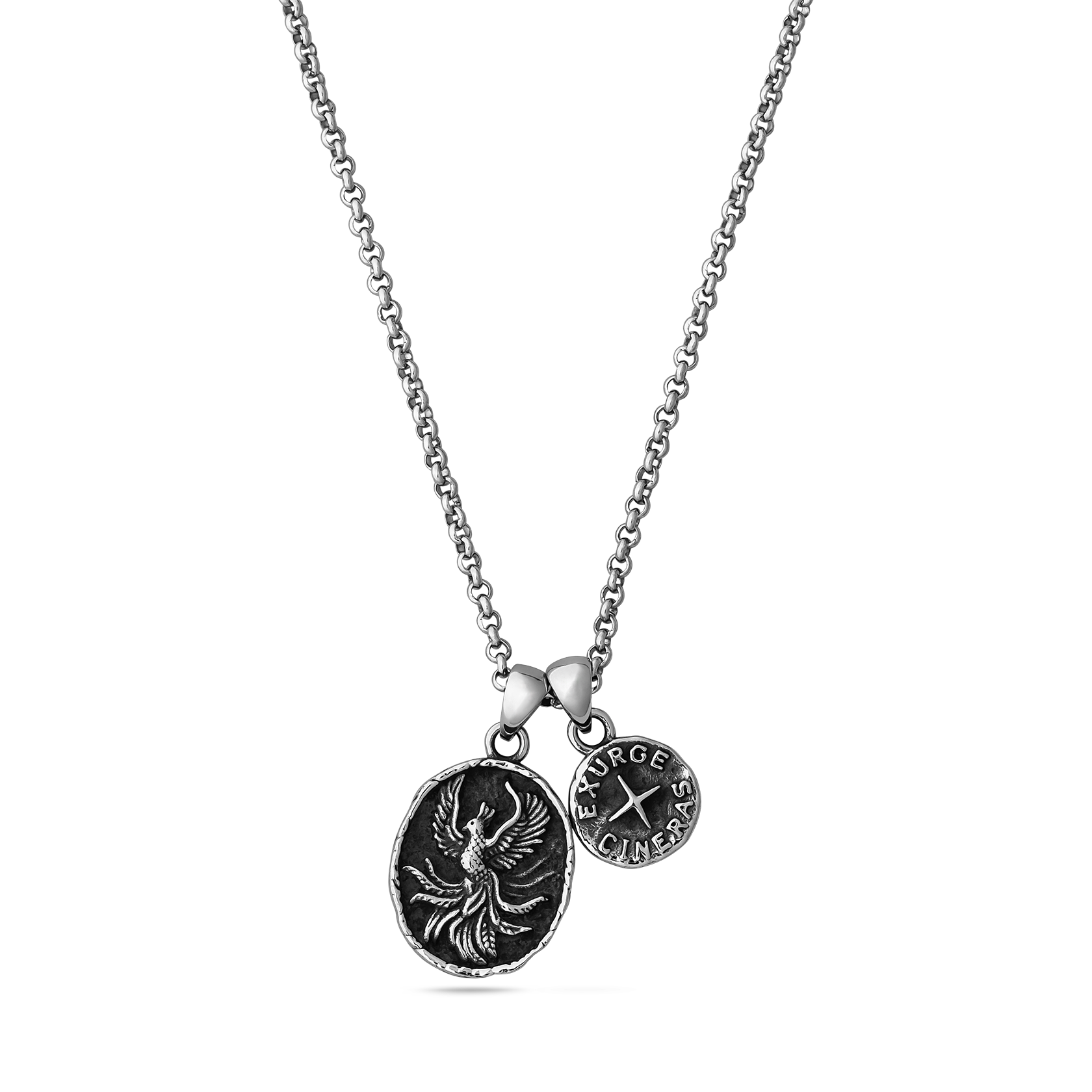 The Rise pendant captures the myth of the phoenix, a symbol of rebirth and resilience. Bearing the Latin phrase “Exurge Cineras” (Rise from the ashes), it’s a call to those who embrace life’s challenges and emerge stronger. This piece is a testament to the fires we endure and the strength we gain. Will you rise or succumb in the ashes?