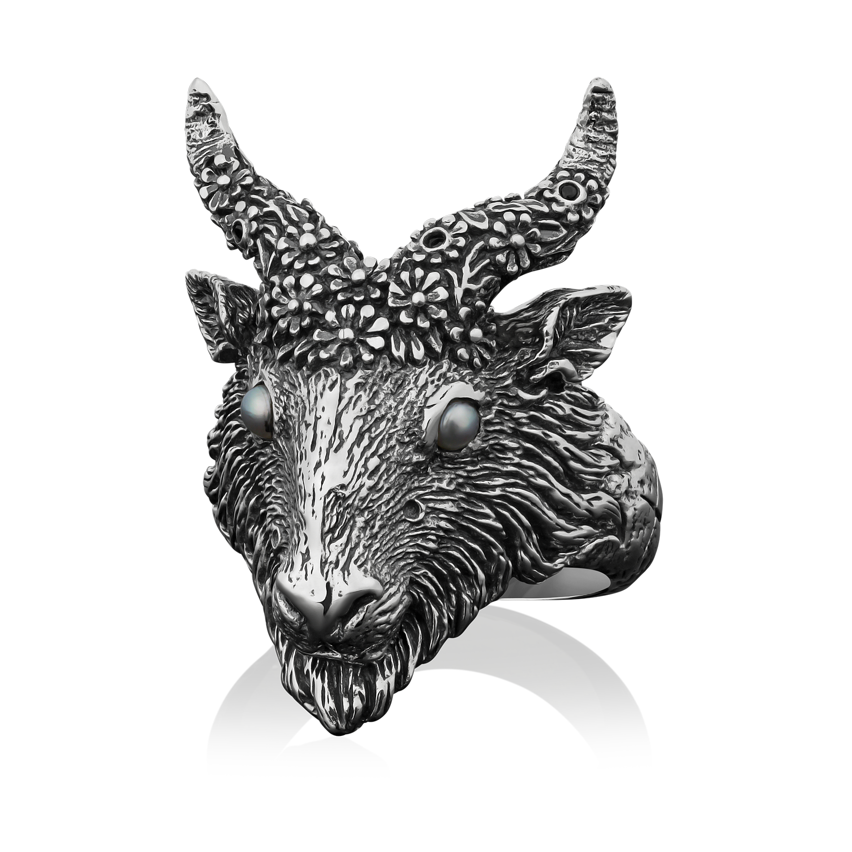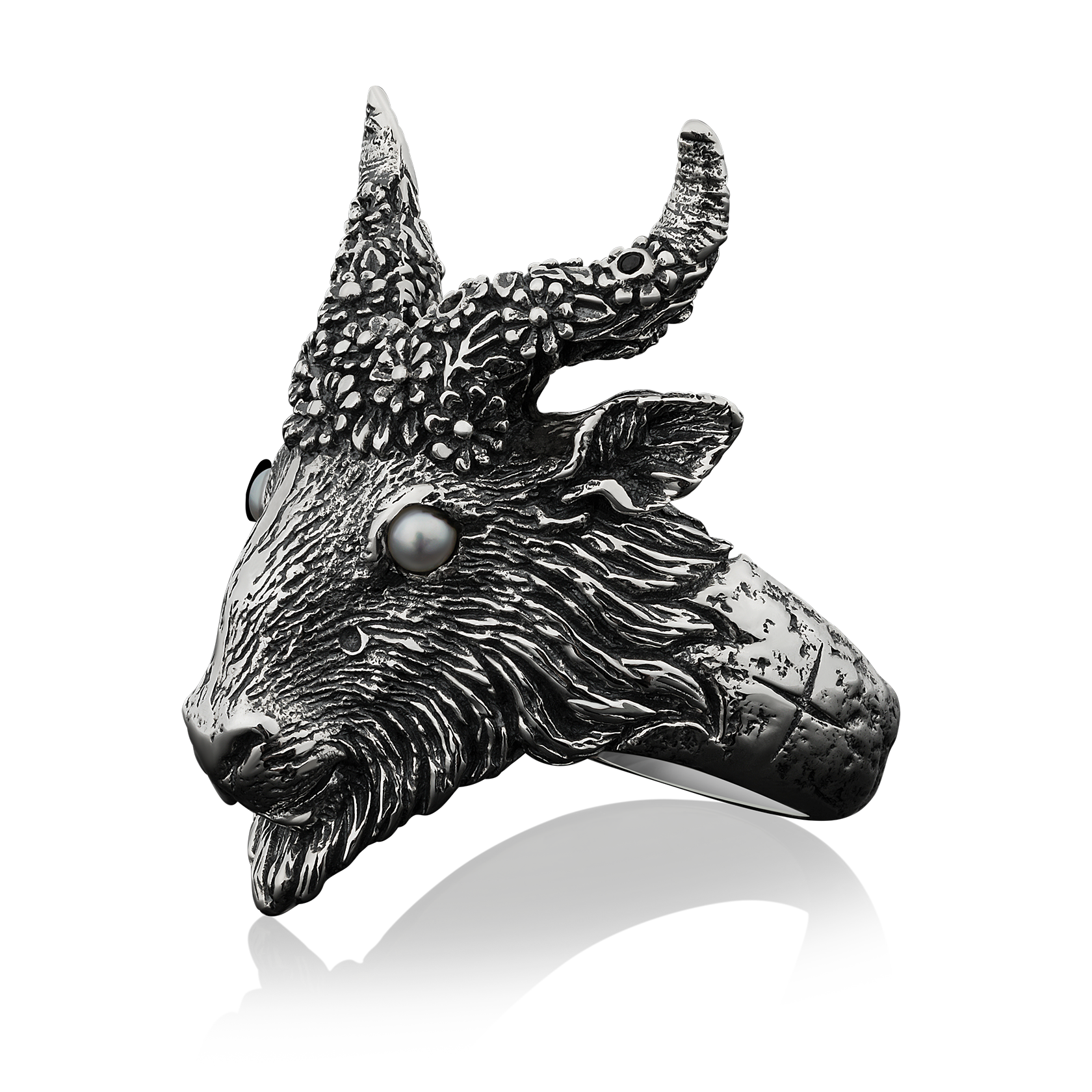 Designed in collaboration with Davey Havok, the legendary vocalist of AFI, Blaqk Audio, XTRMST and Dreamcar, this ring takes its name from the 19th century anarchist slogan “Nie Dieu Ni Maitre,” which translates to “No gods, no masters.” Featuring the head of a goat, a figure that is often associated with determination, independence, and strength, this ring packs all the punch necessary to fight the power.