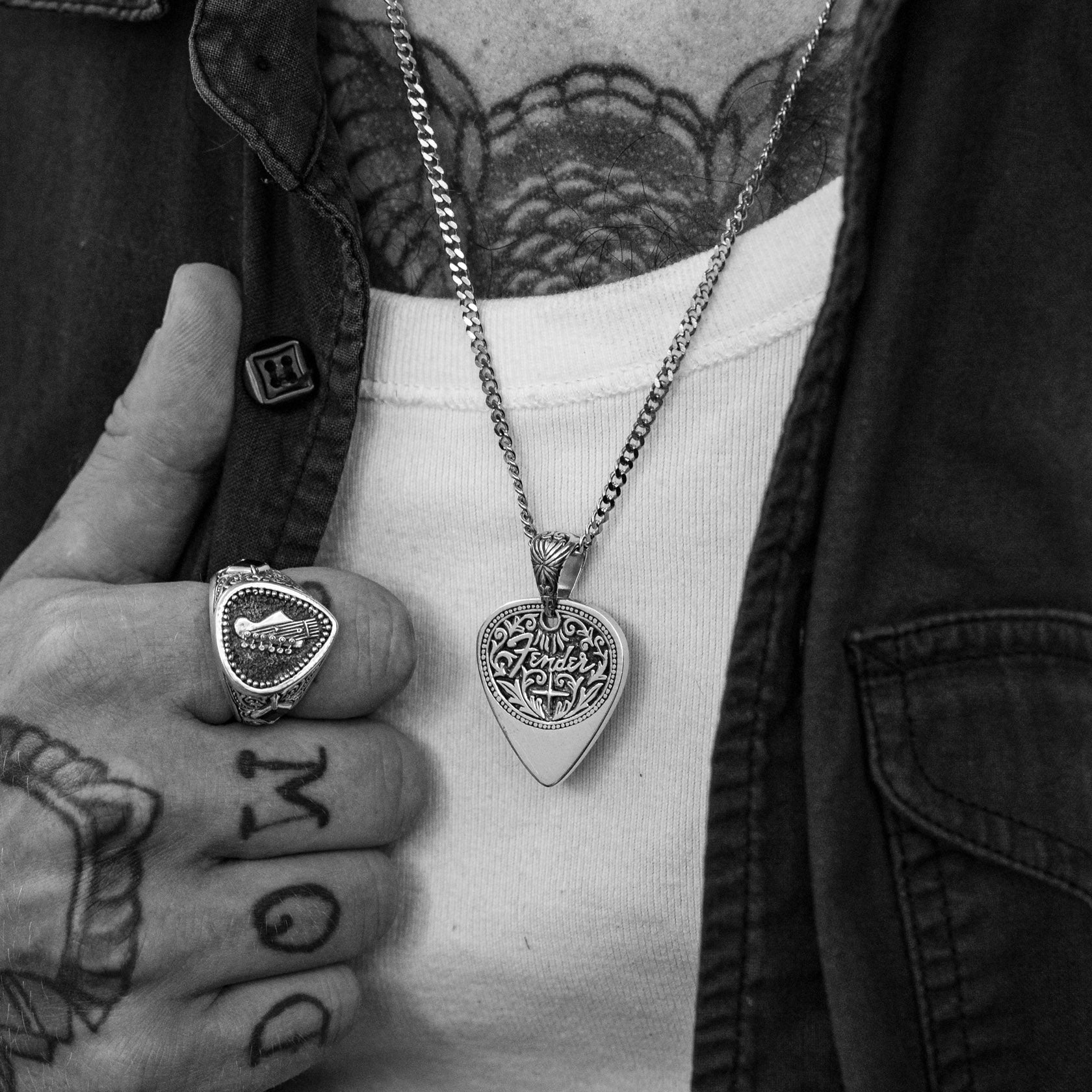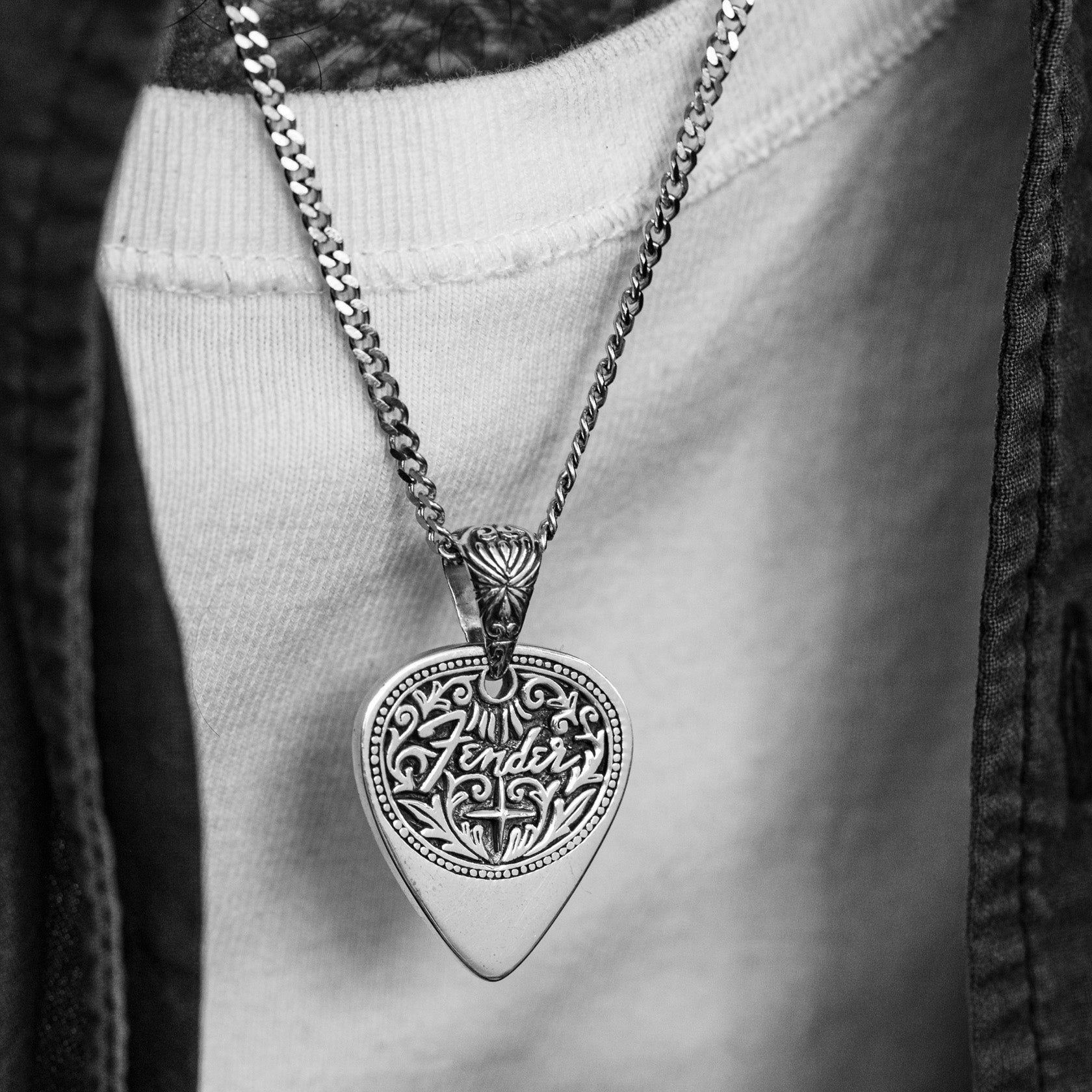 Designed in collaboration with revolutionary guitar makers Fender. The Plectrum pendant serves as a symbol of the passion poured into a musician’s craft over countless hours of slapping the strings. A token of the triumphs and sacrifices made on the road to perfection