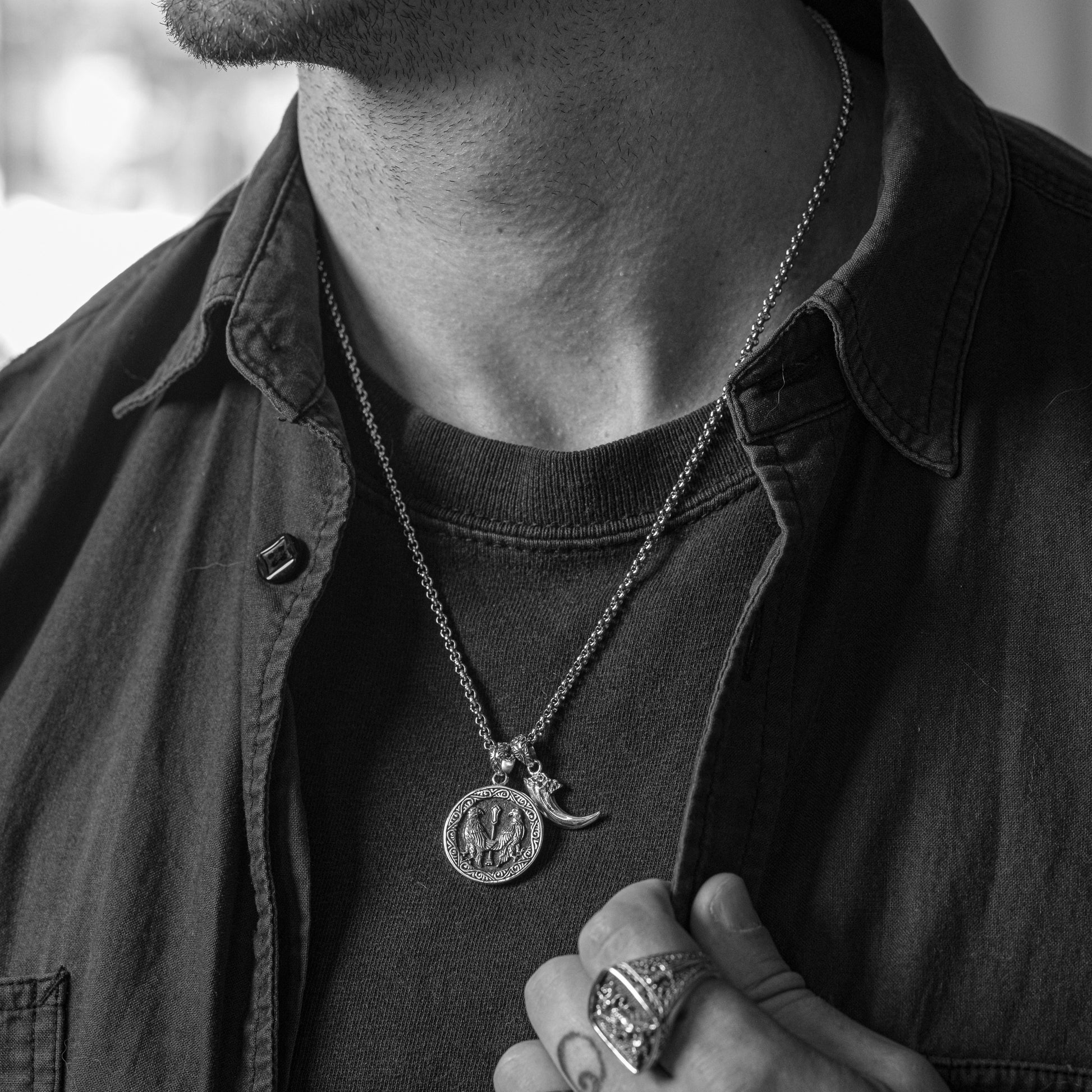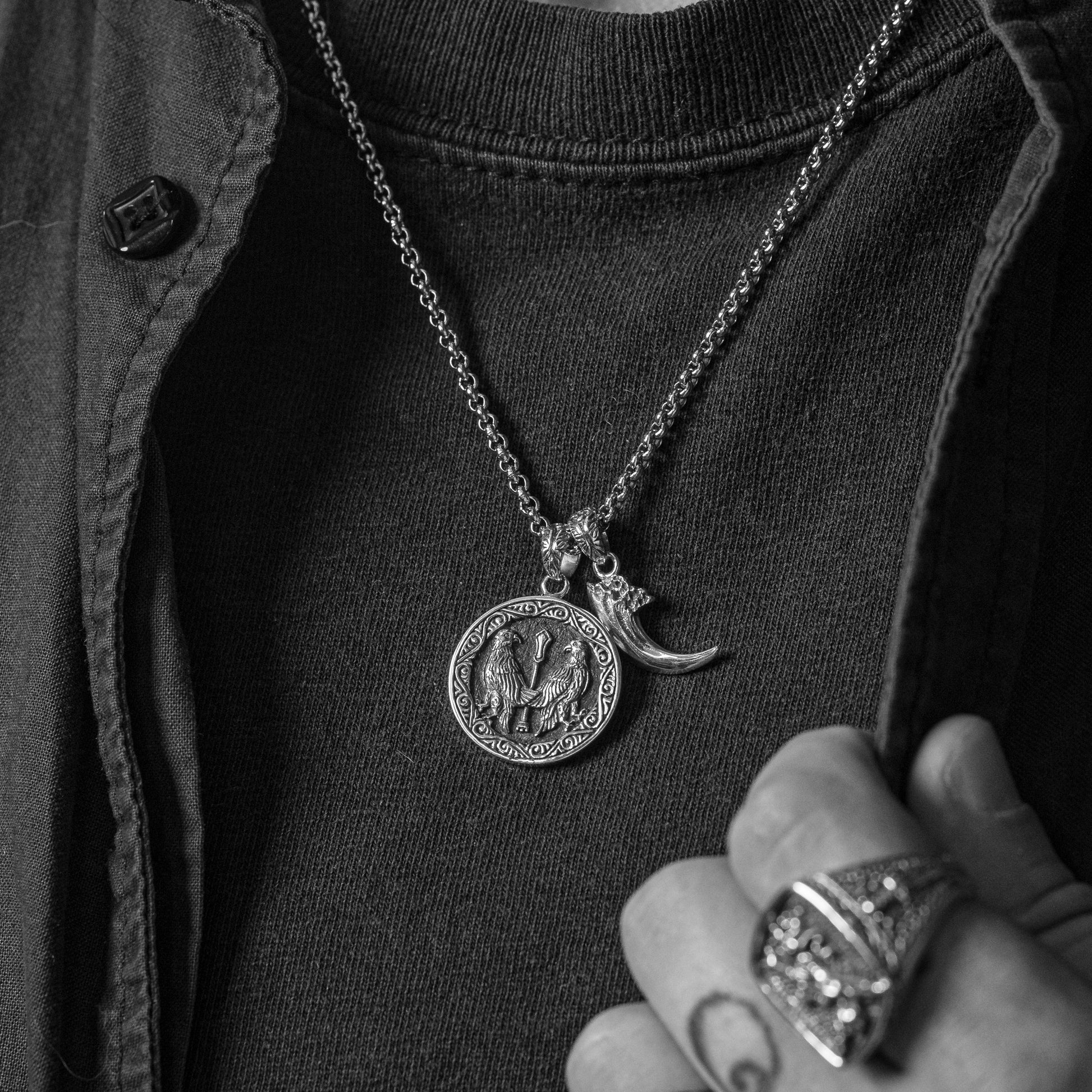 The ancient art of falconry was not only a form of hunting in Medieval culture, but also a symbol of discipline and mastery. As an ode to this cherished tradition, the Falconer pendant features imagery of two noble falcons and a handcrafted talon charm.