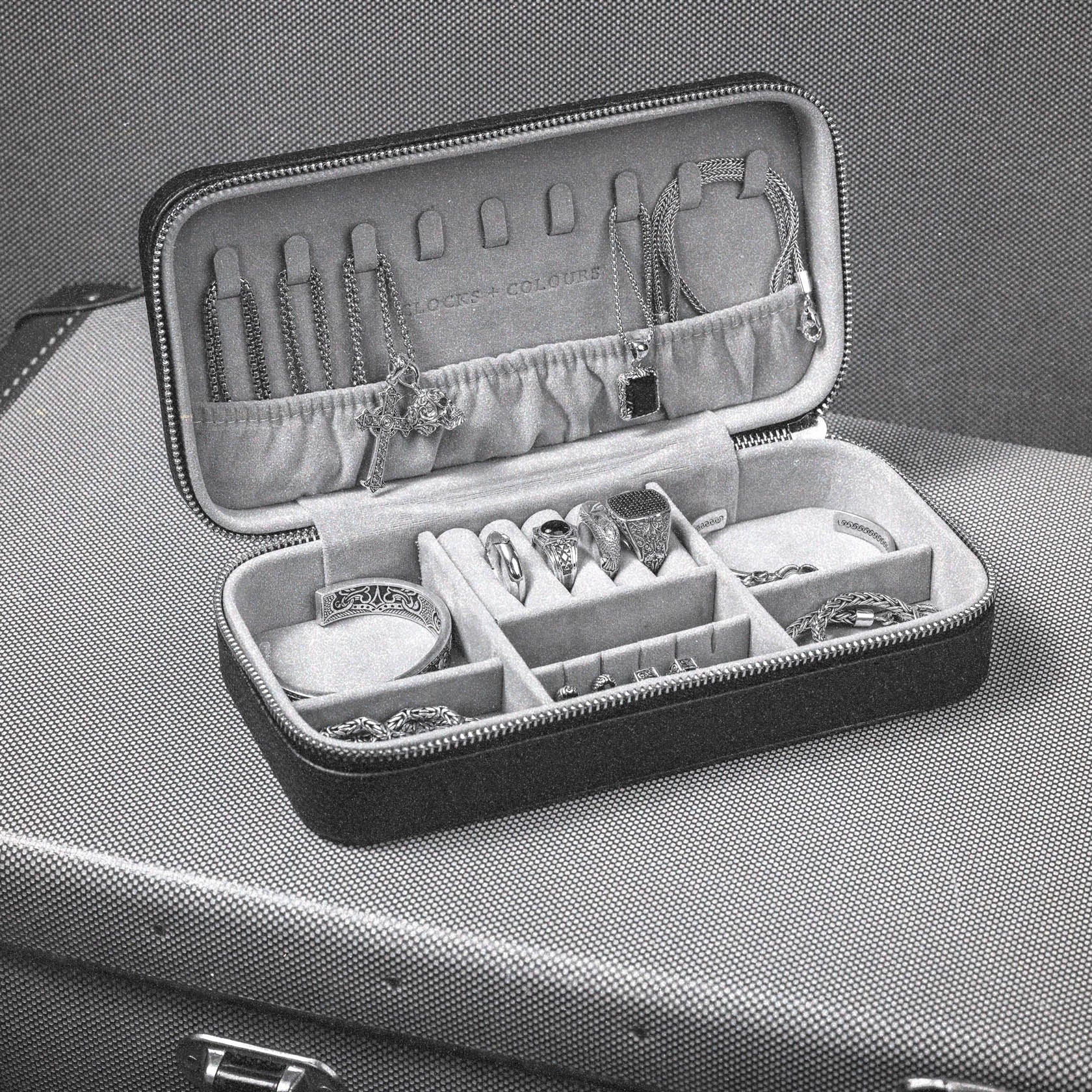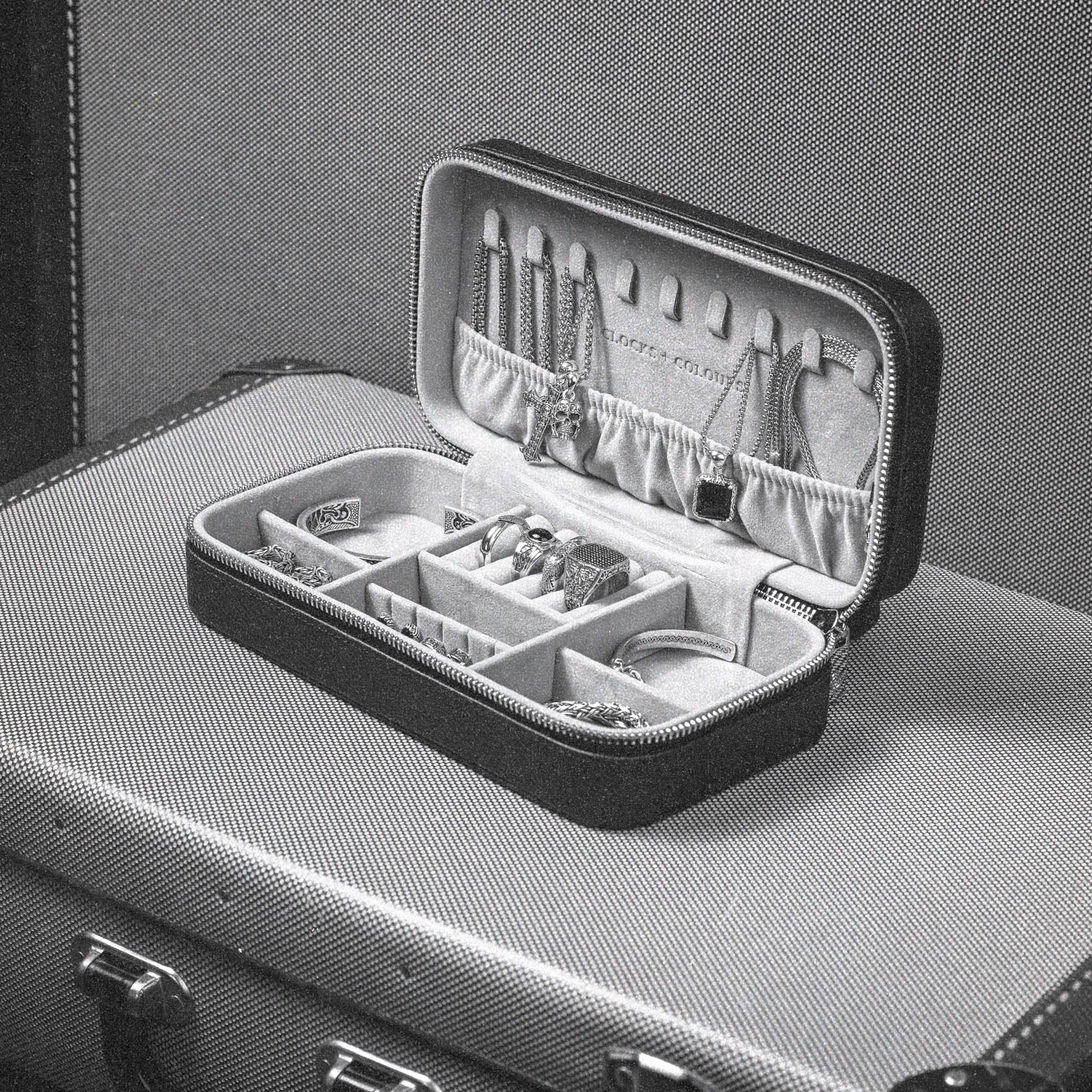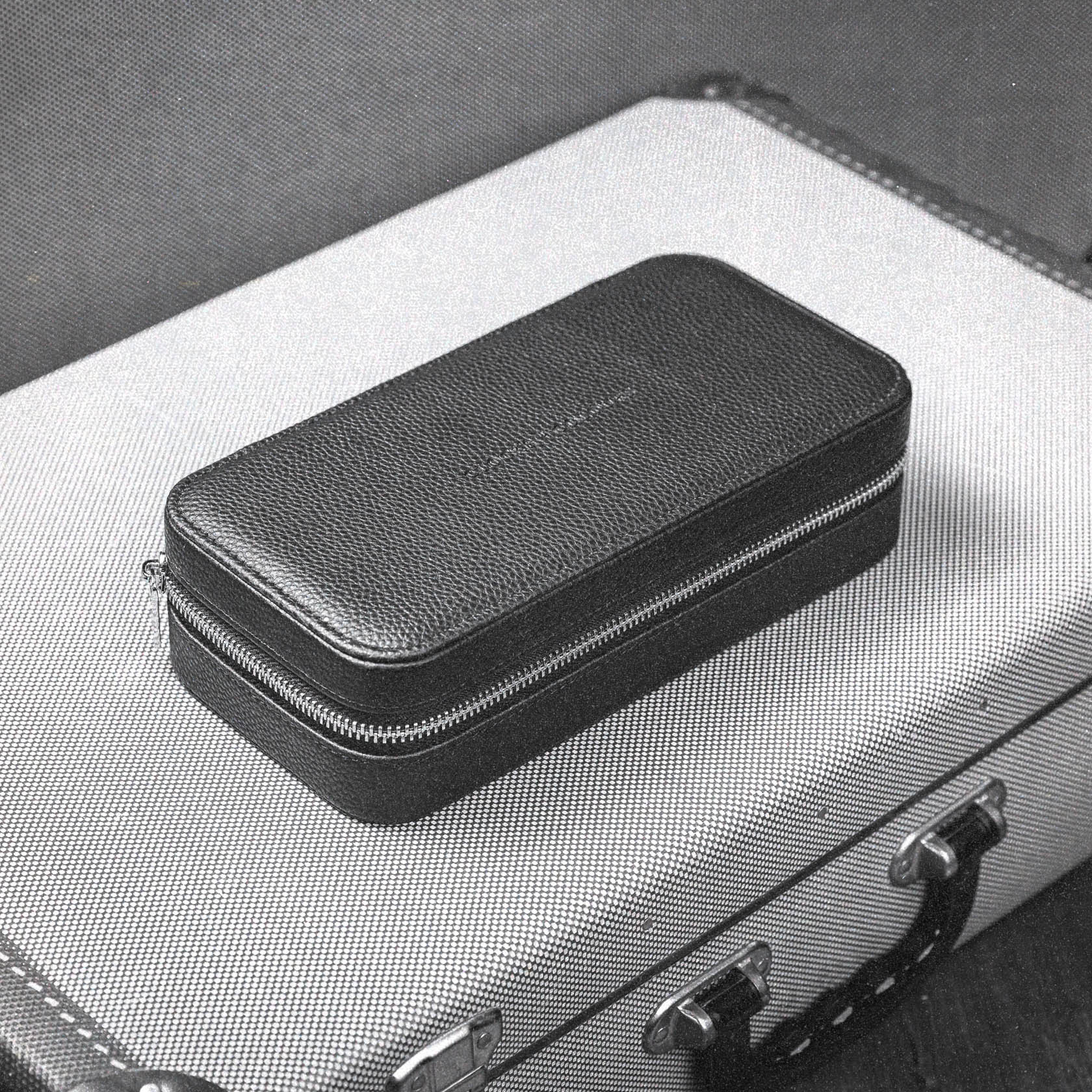 Crafted for the road, the Journey Case keeps your favourite pieces secure and protected. Made with black leather and a felt-lined interior, it's designed to withstand the rigors of travel. Tough, compact, and ready for your next story.
