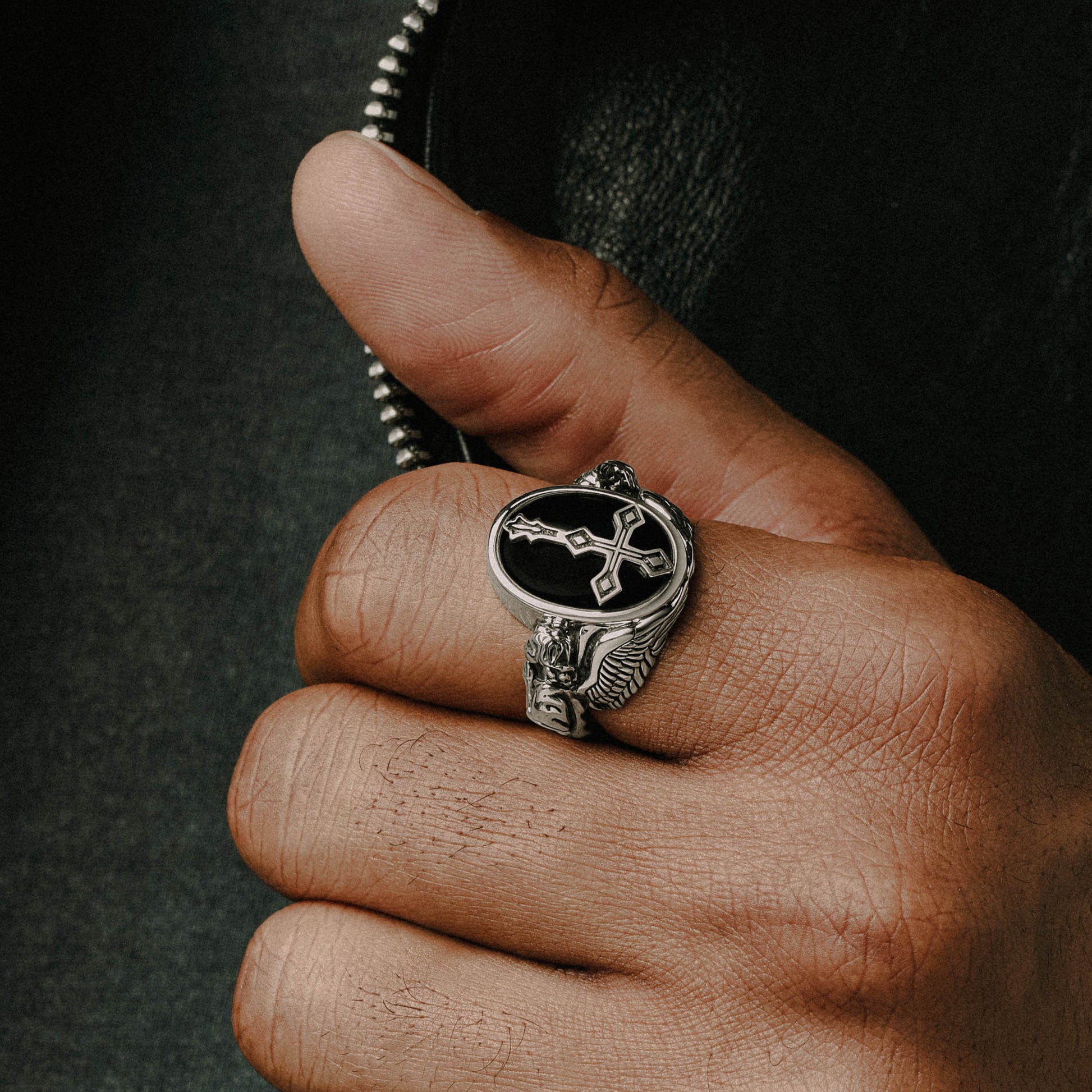 This ring really sticks out. The artist who designed this did a perfect job in coming up with a unique design not only for the cross symbol, but also the artwork surrounding it. I love it!