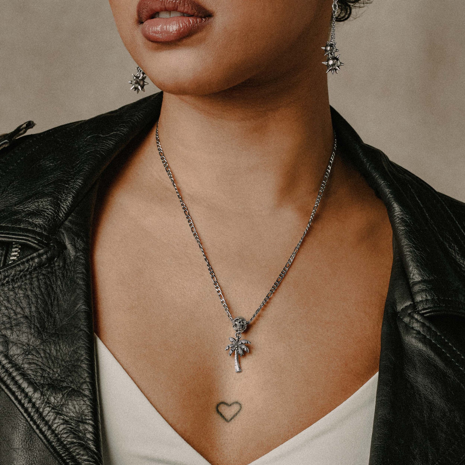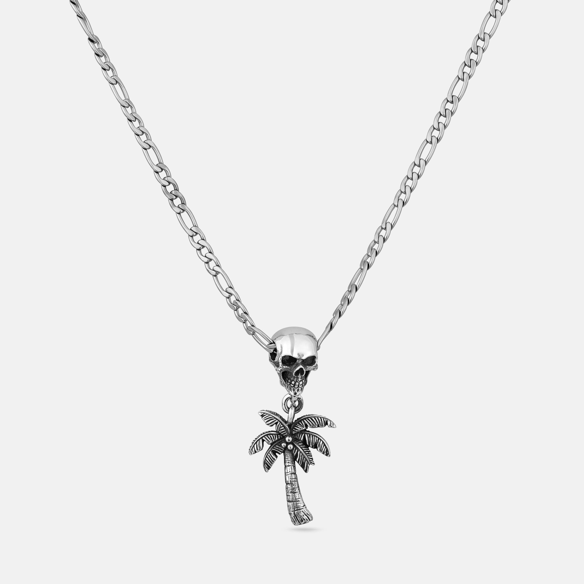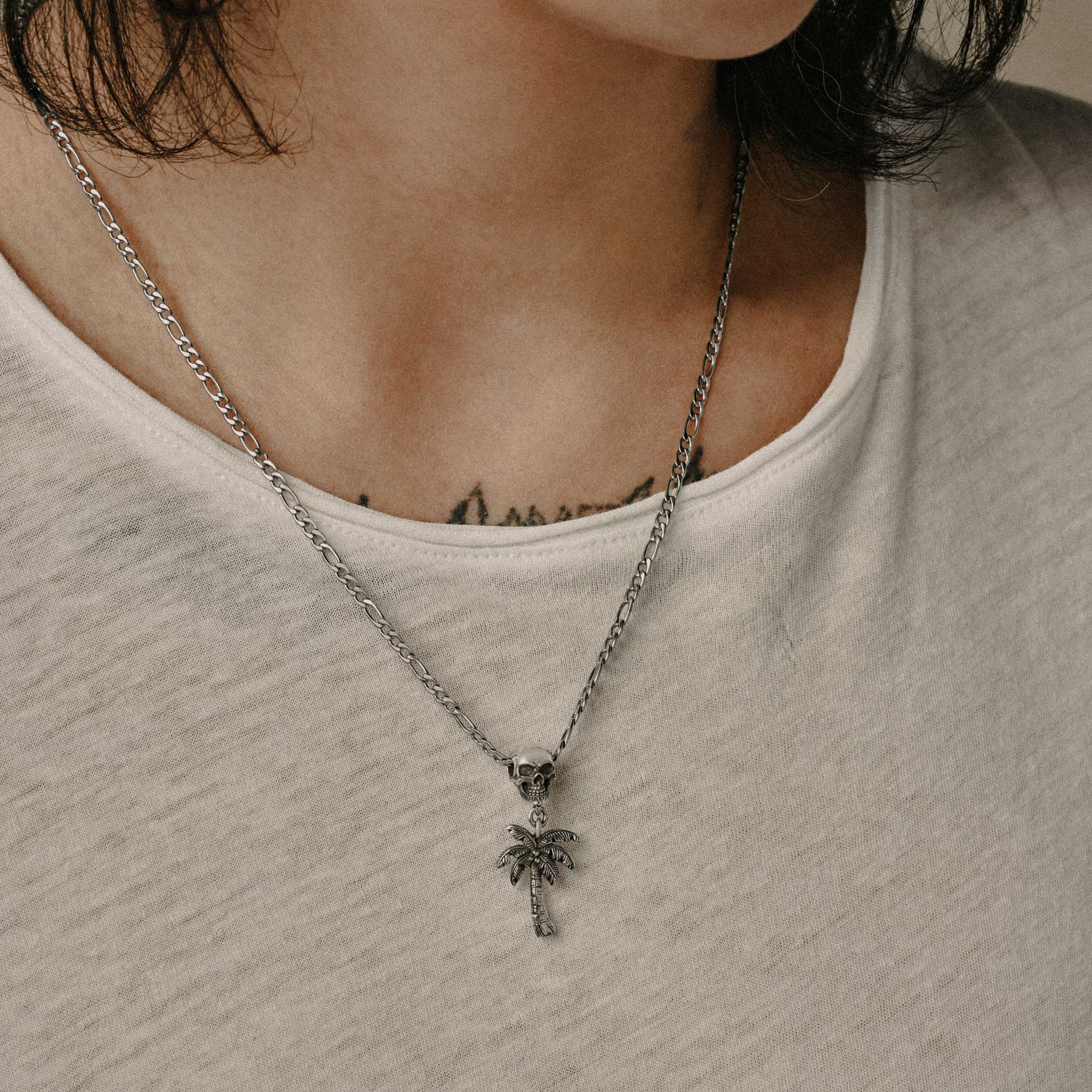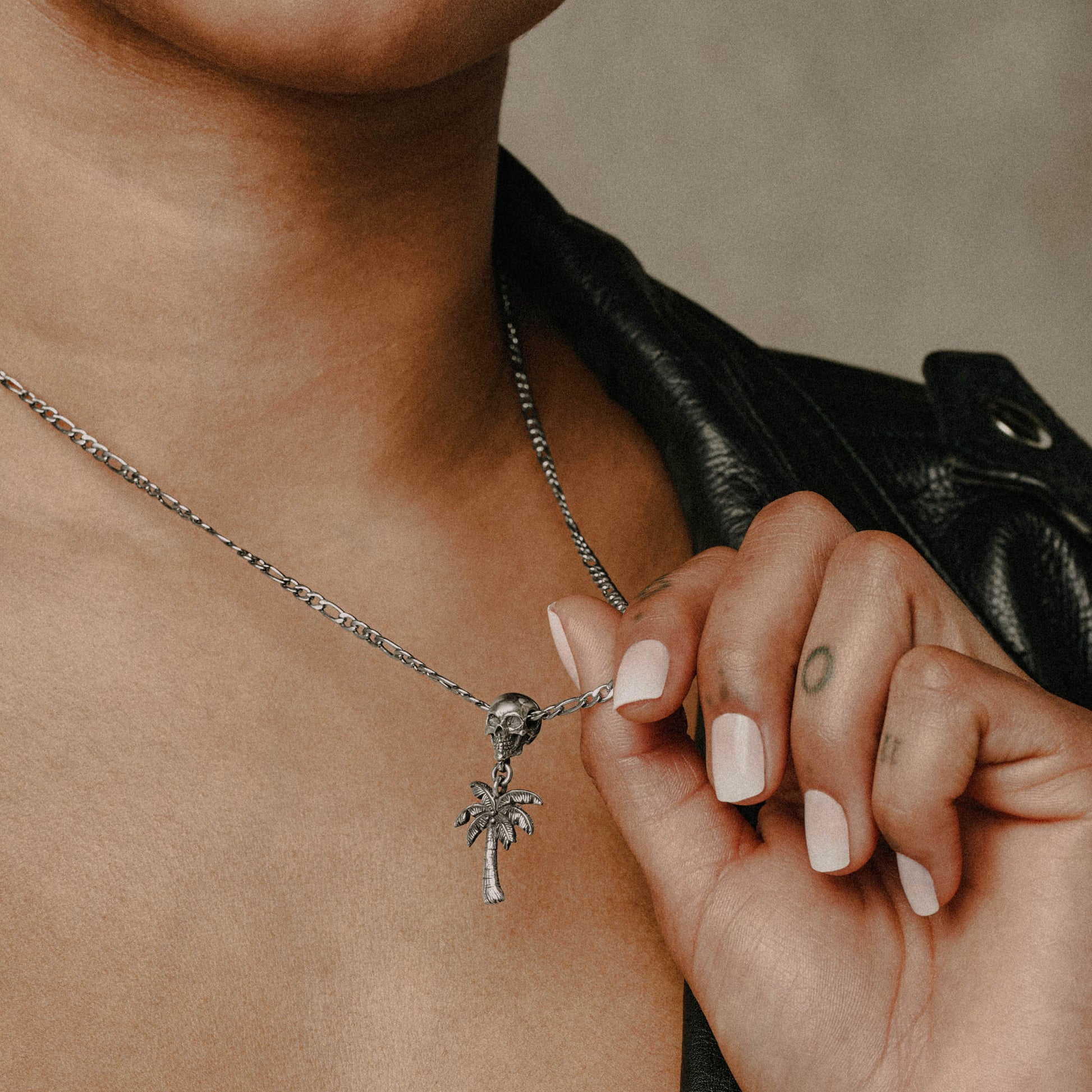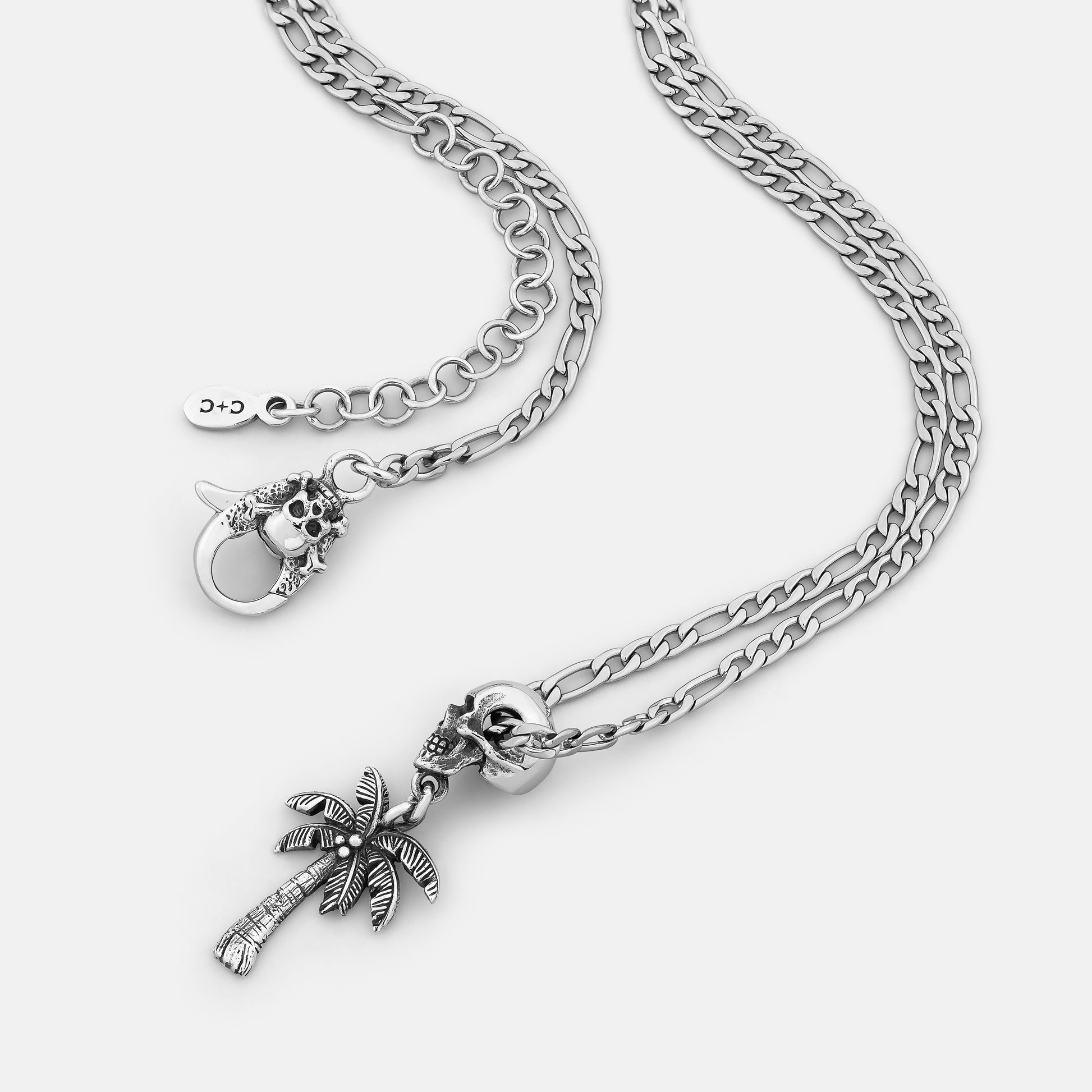 Featuring a handcrafted palm tree charm dangling from a menacing skull and finished off with a timeless Figaro link chain. The Shark Bait is for those who seek adventure, even when danger lurks around the corner.