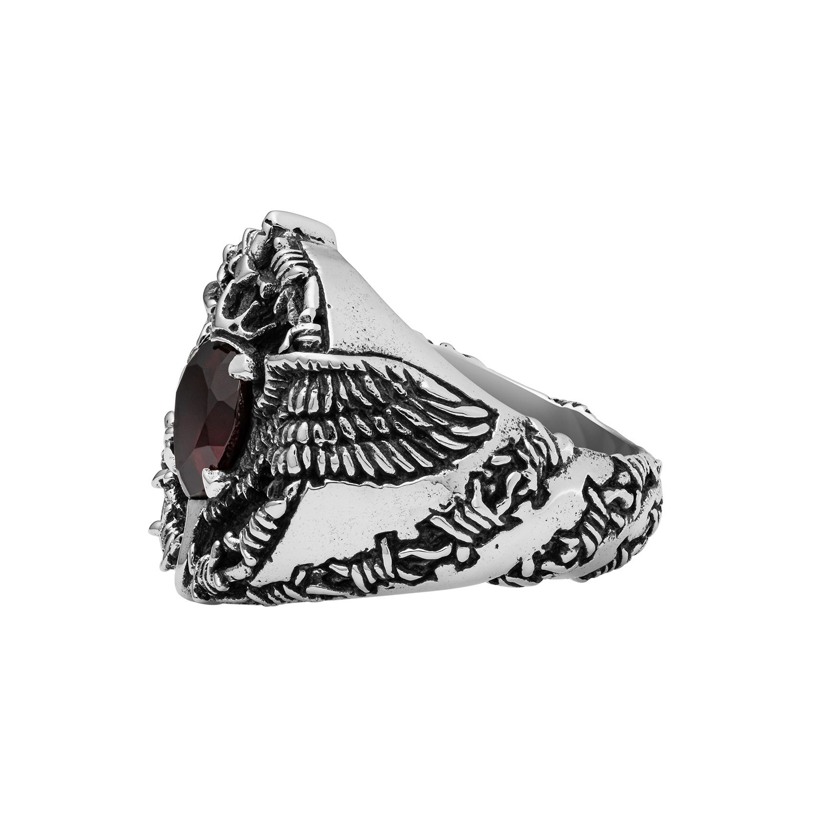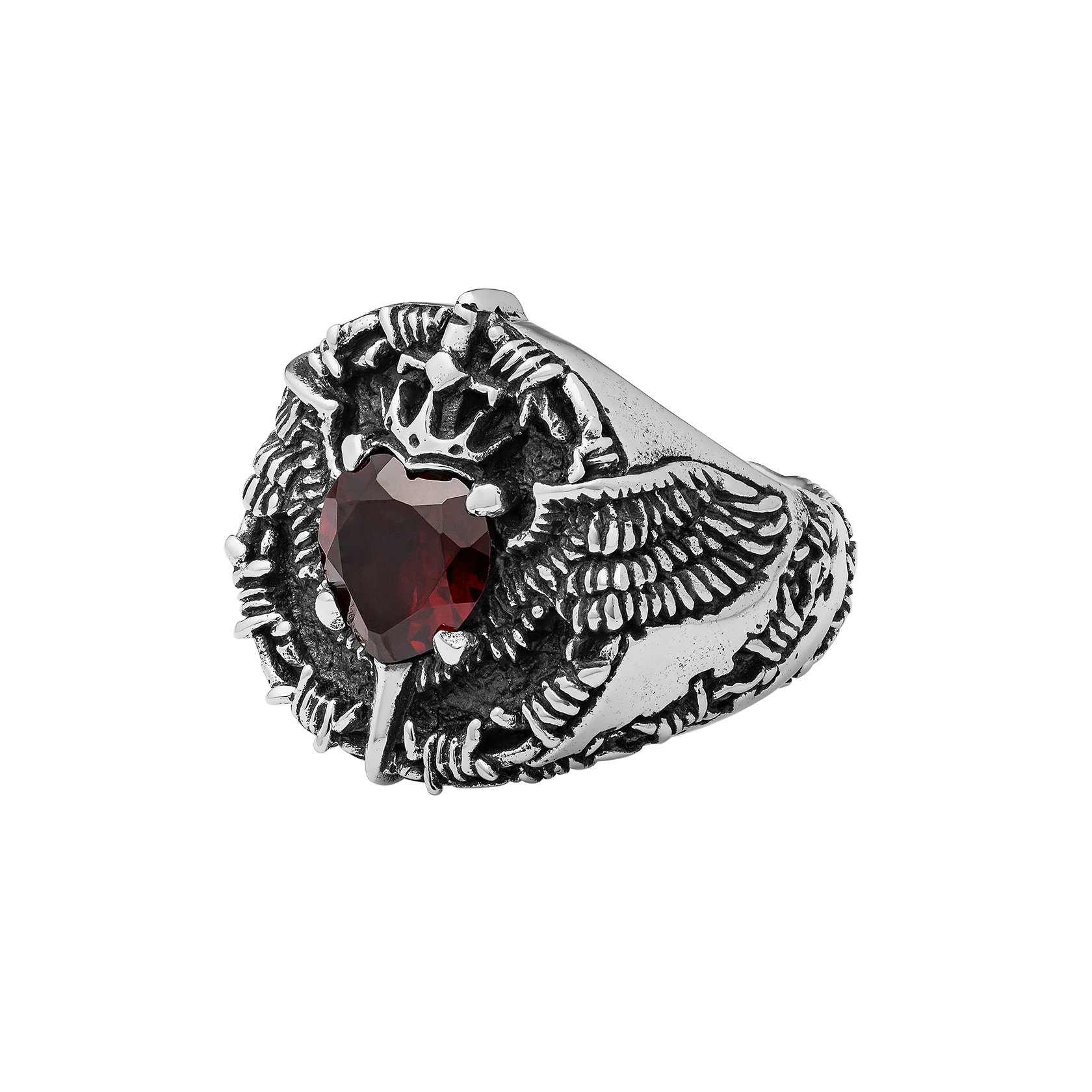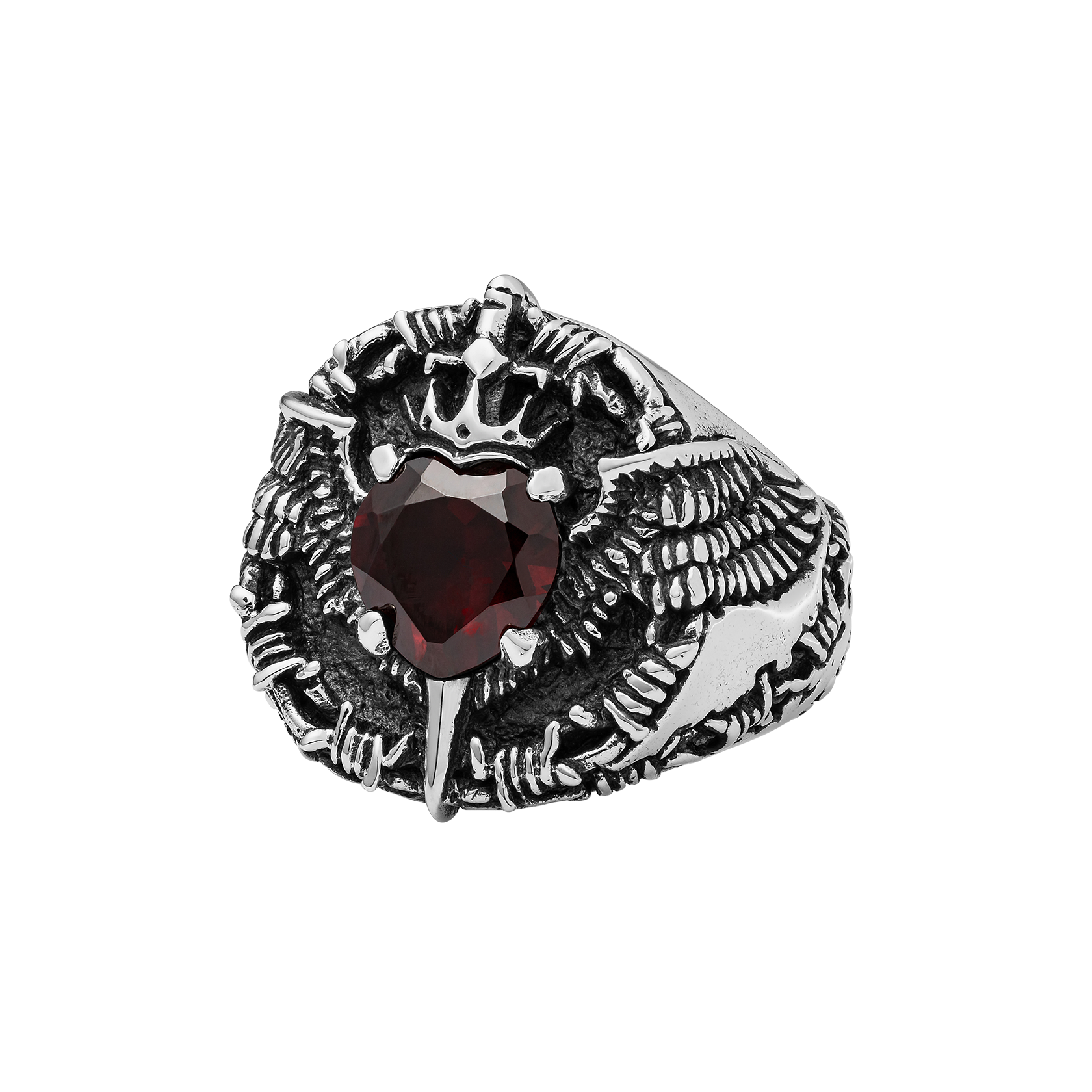 Designed in collaboration with Kelsy Karter & The Heroines, the Heroine ring is a tribute to fearless self-expression. Handcrafted in sterling silver, it showcases angel wings and a sword through a heart-shaped garnet—a symbol of strength, individuality, and unapologetic courage. This piece is for those who stand out, inspired by rock and the spirit of rebellion.