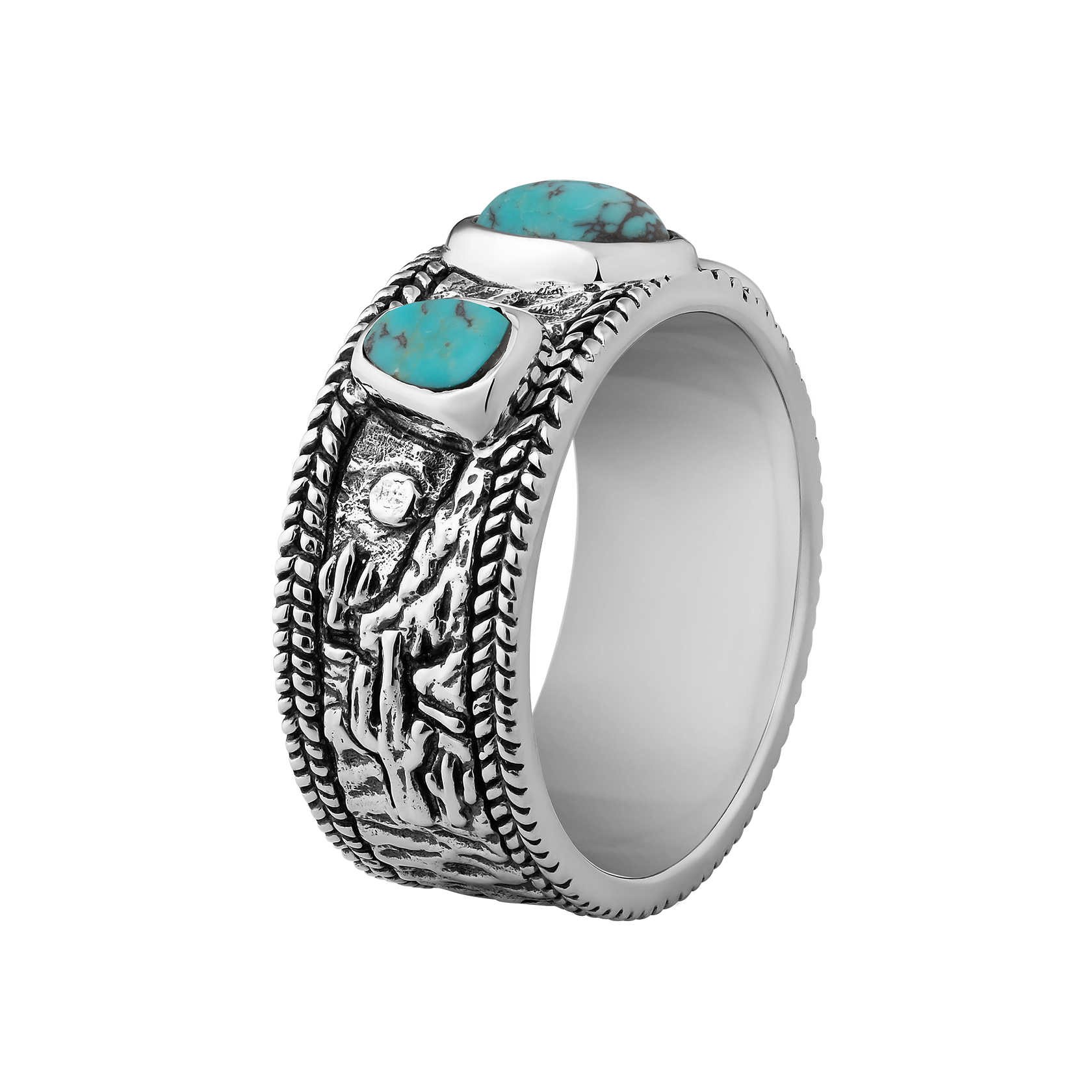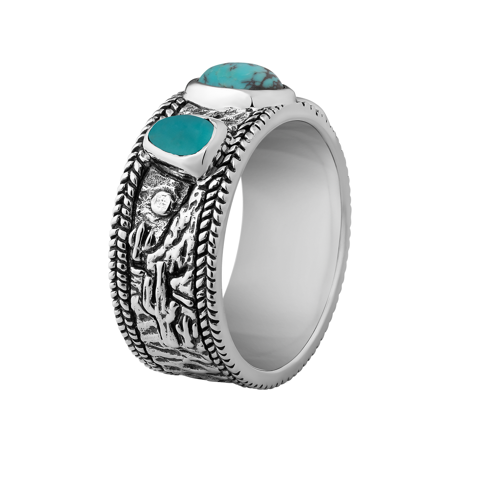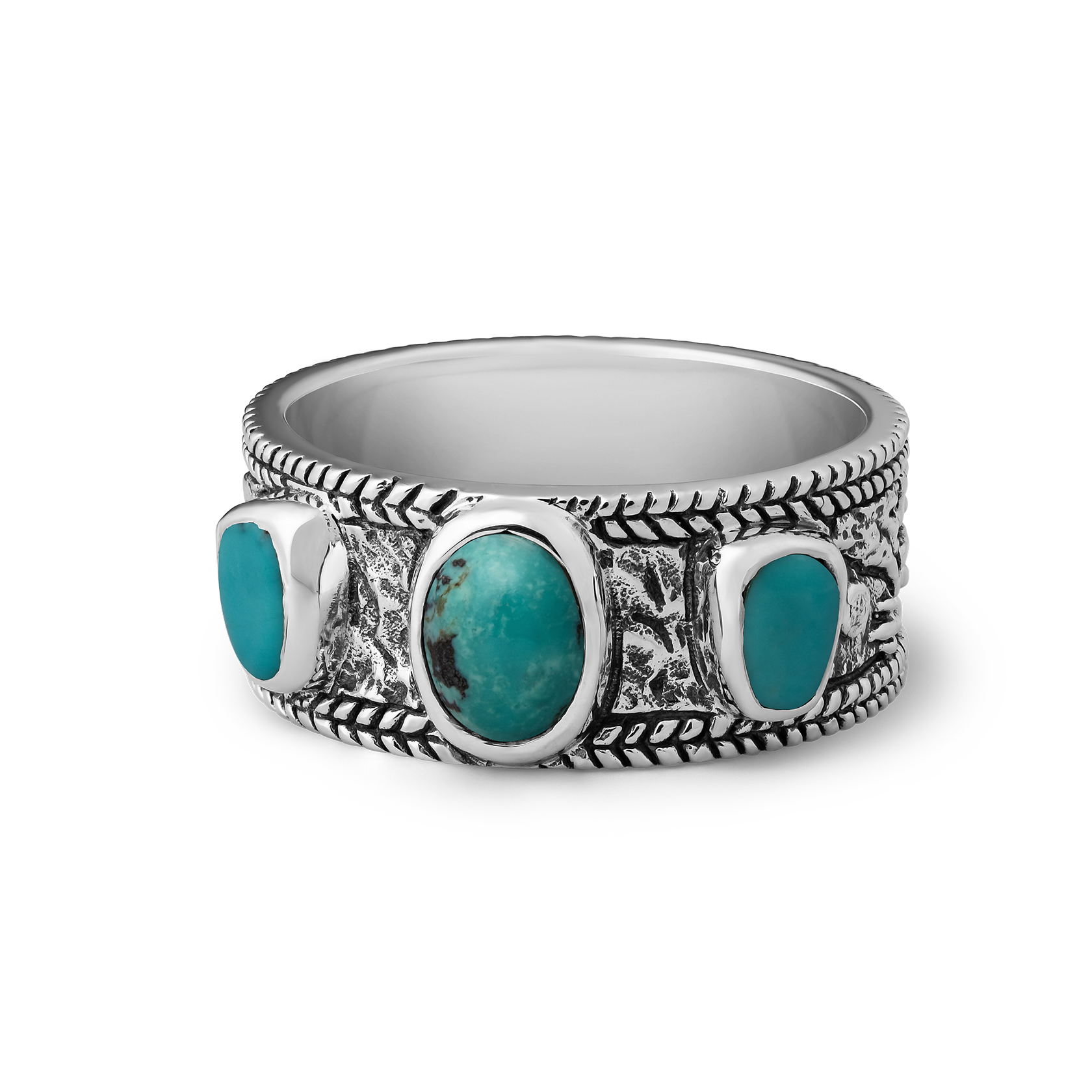Designed in collaboration with Peter McKinnon, the Horizon captures the expansive beauty of the western landscape. This sterling silver ring features three uniquely shaped turquoise stones, set against a backdrop of an intricately engraved rugged western panorama that wraps around the surface of the band.