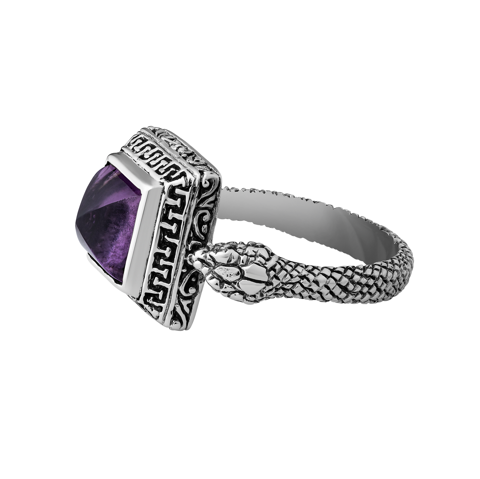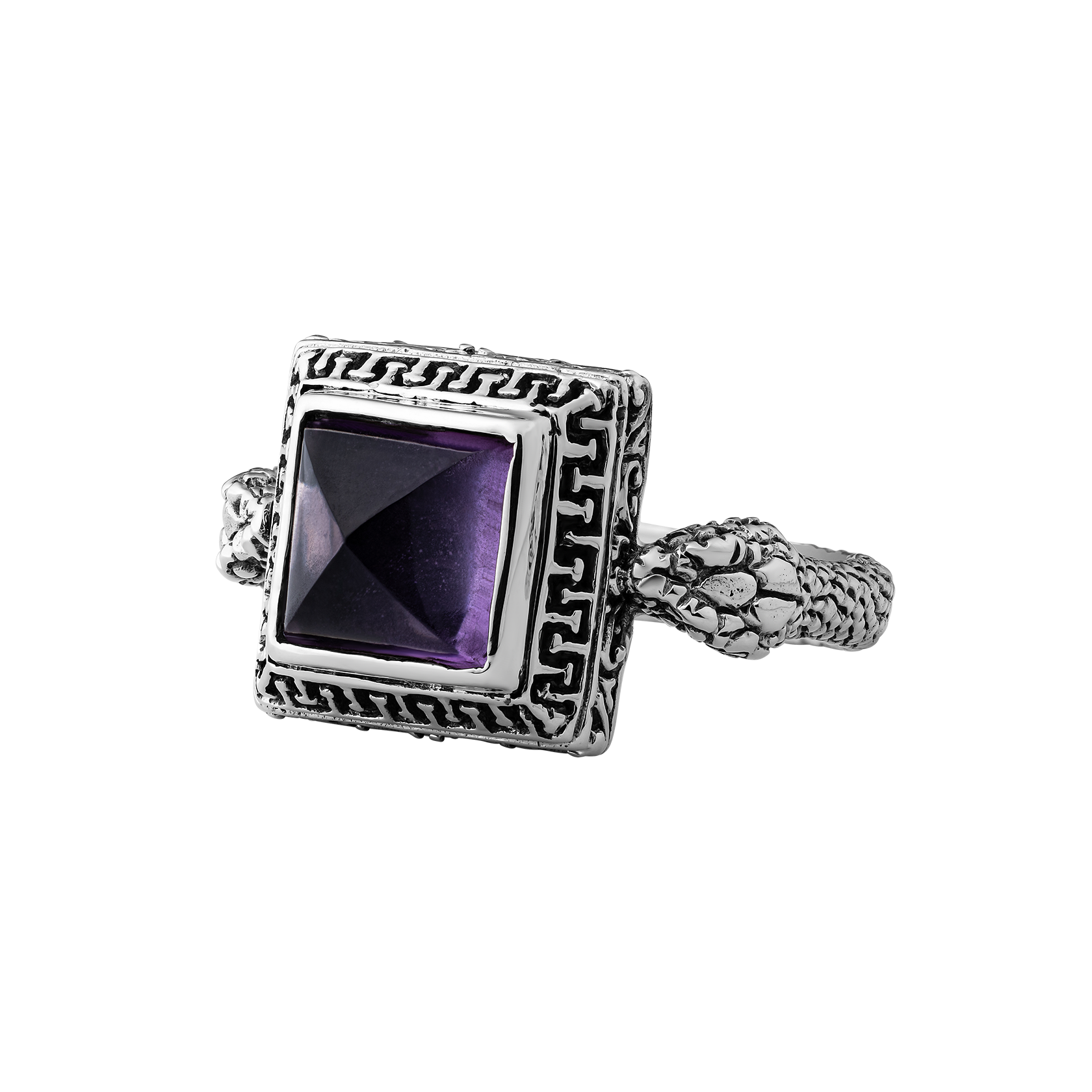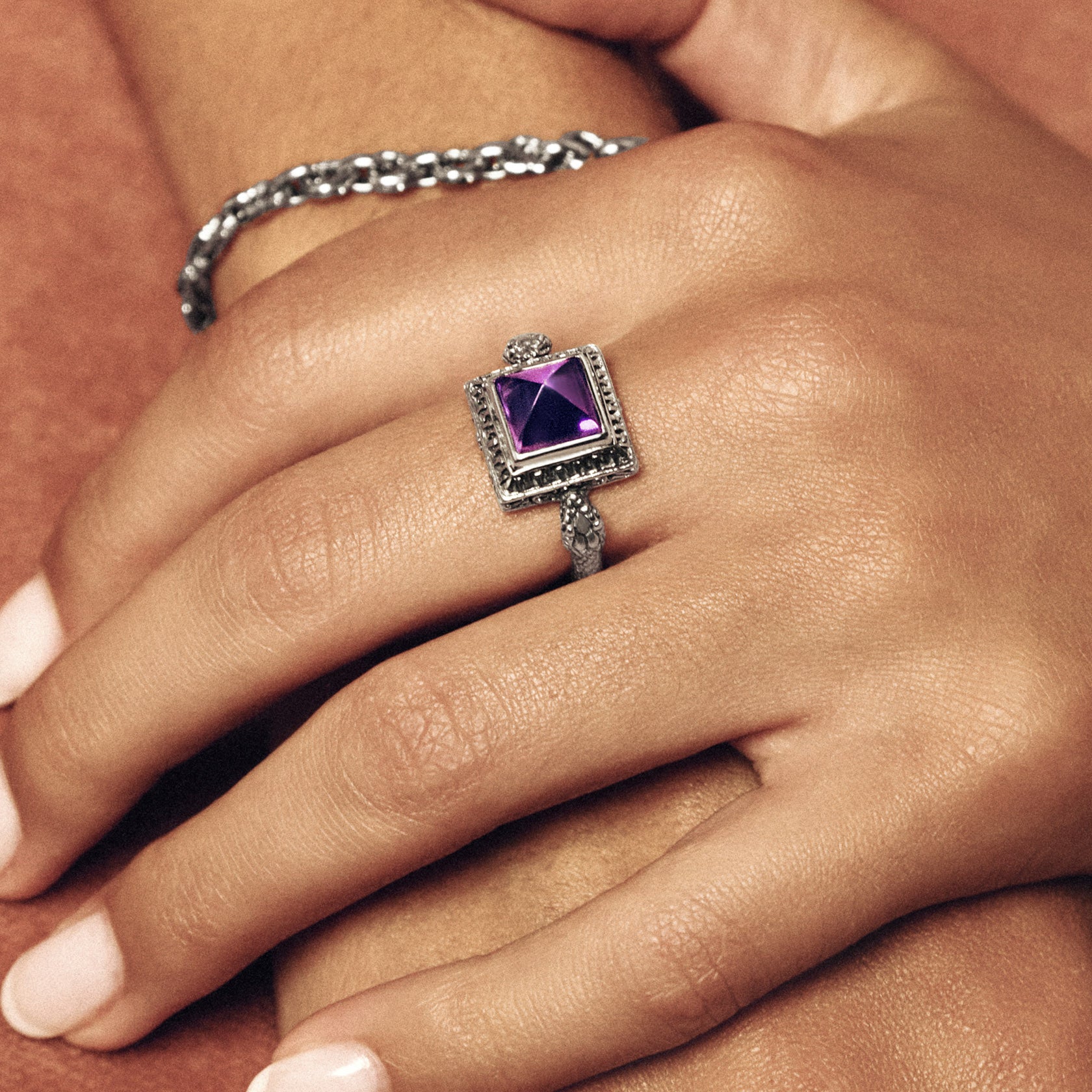 The Allure ring is crafted from sterling silver and features two snake heads on either side, symbolizing wisdom and transformation. The snakes hold a striking amethyst stone, known for its clarity and strength. A nod to the timeless elegance of the Greek goddesses, this piece is for those who carry their own unique power.
