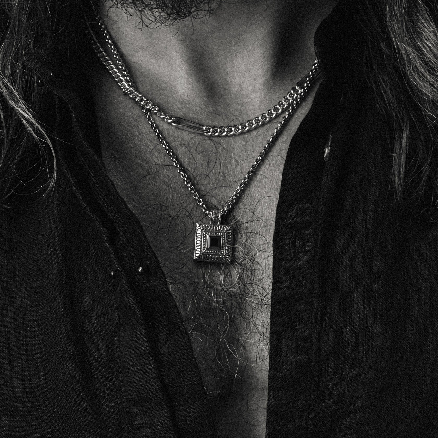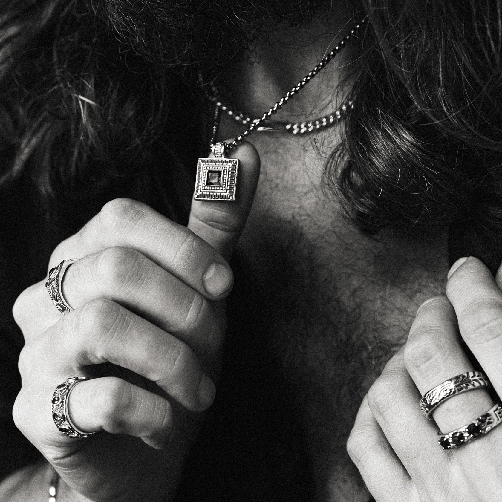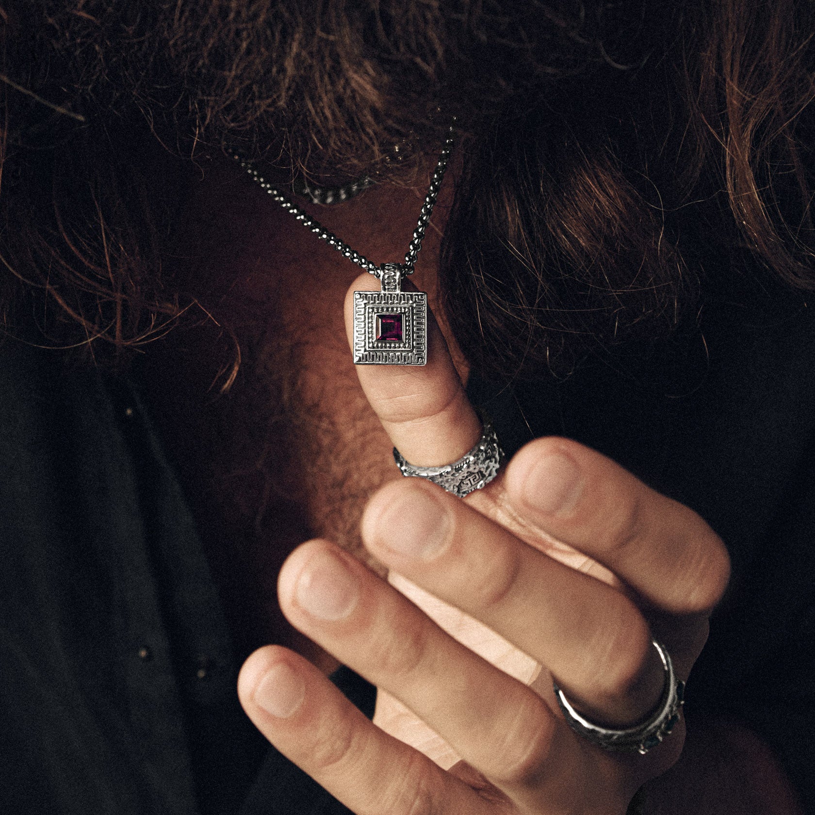 This pendant necklace features a hammered square with a red garnet at its center, bordered by the classic Greek key—a symbol of flowing human life. The garnet, known for its association with passion and protection, adds a vivid focal point. With ornate hand-carved details and a four-point star on the back, this piece merges historical symbolism with craftsmanship.