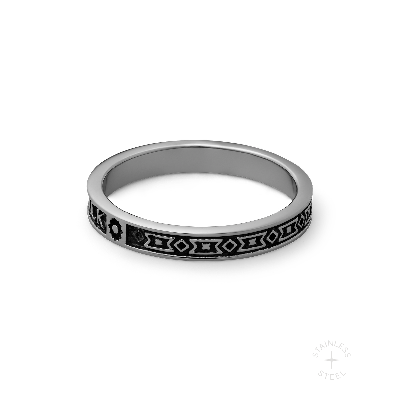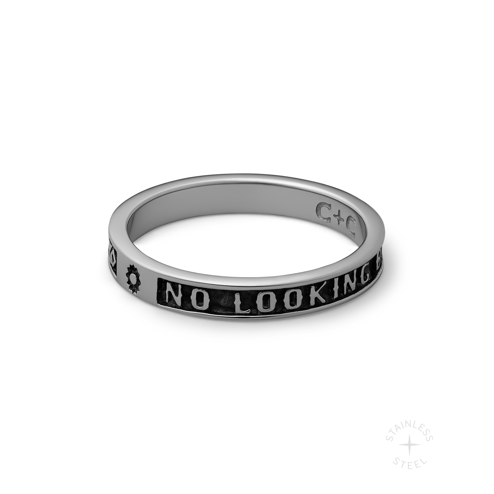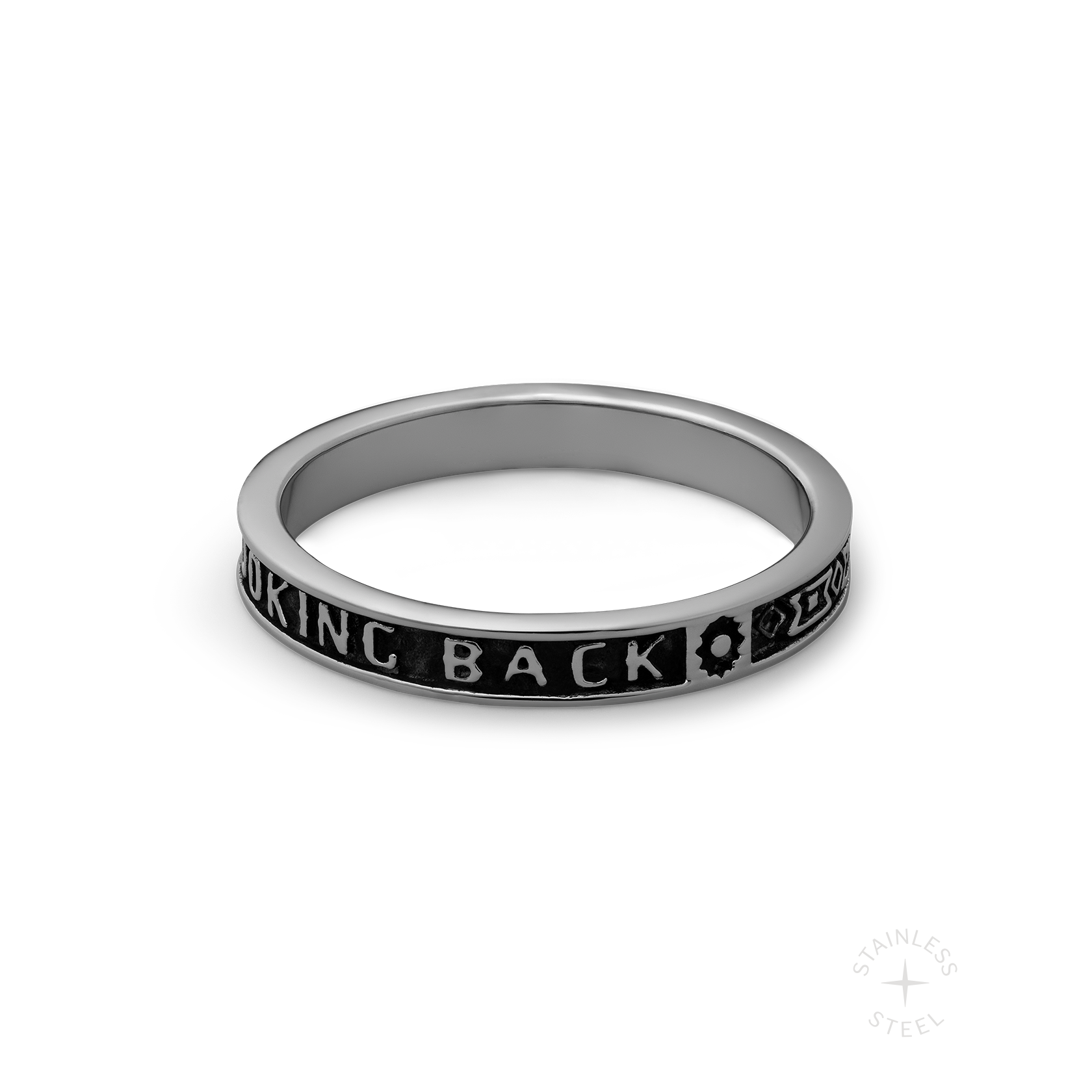 Stainless steel band ring engraved with "NO LOOKING BACK" on one side and repeating patterns on the other. Band measures 3.3mm wide.