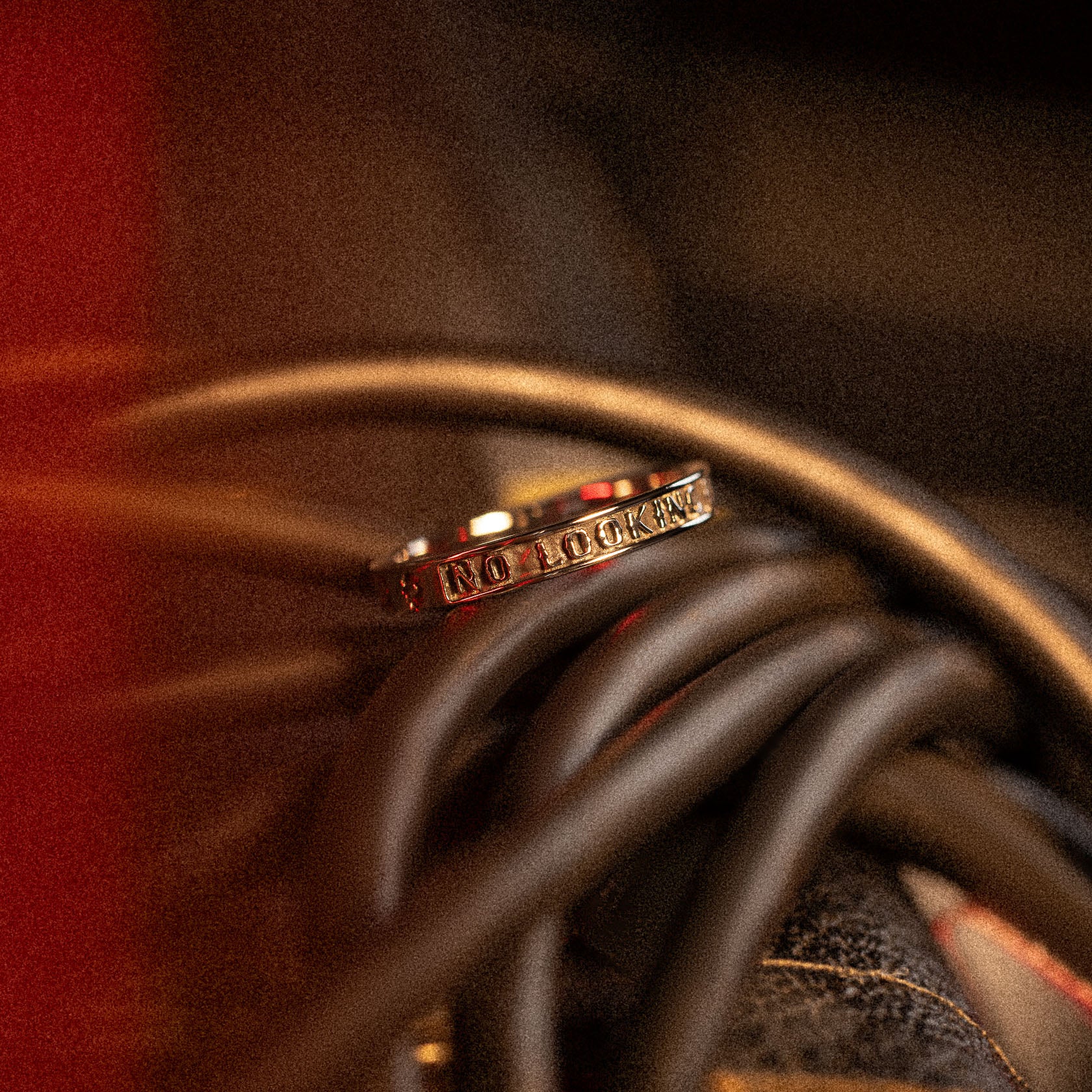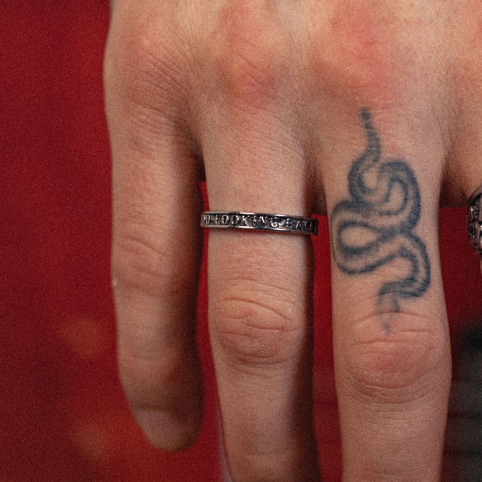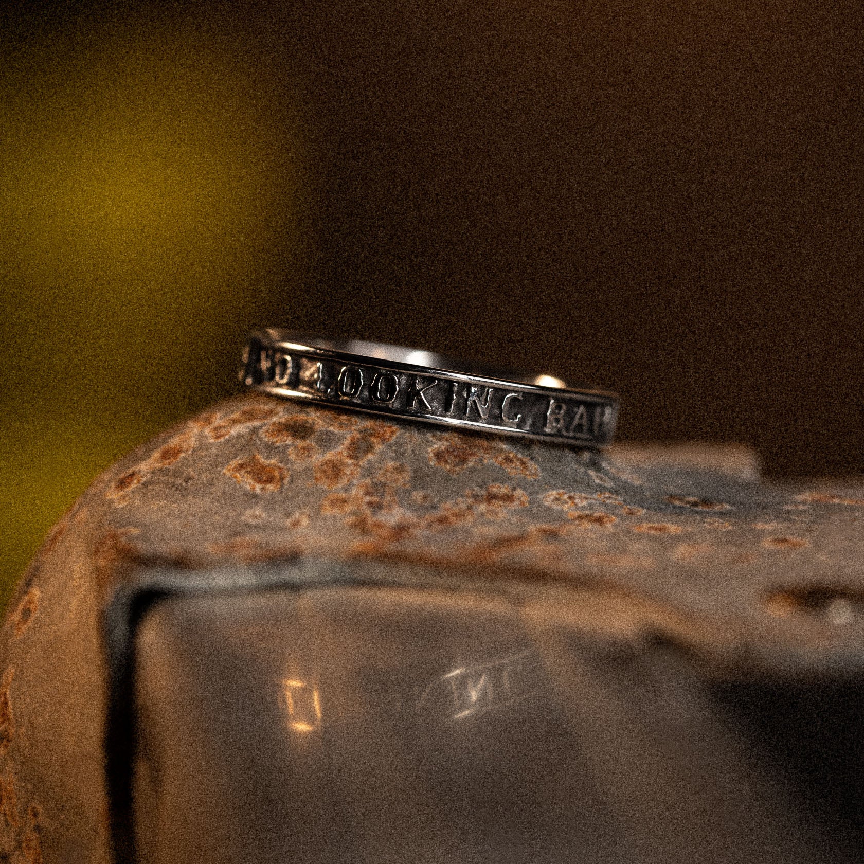 Stainless steel band ring engraved with "NO LOOKING BACK" on one side and repeating patterns on the other. Band measures 3.3mm wide.