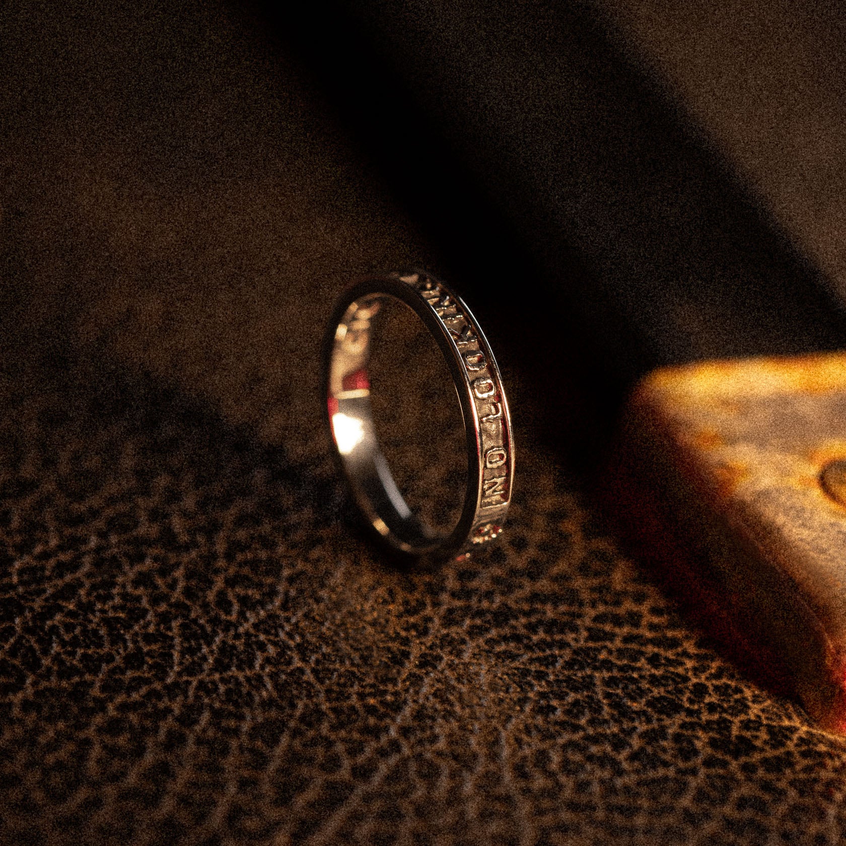 My husband and I don't have matching wedding bands, so I got these so we could wear matching rings when we travel. They are very well made. They are heavy, so they will last, but not uncomfortable to wear, or wear stacked. The design is perfect. The words can be worn showing or not. When you jump into life, there is no looking back.