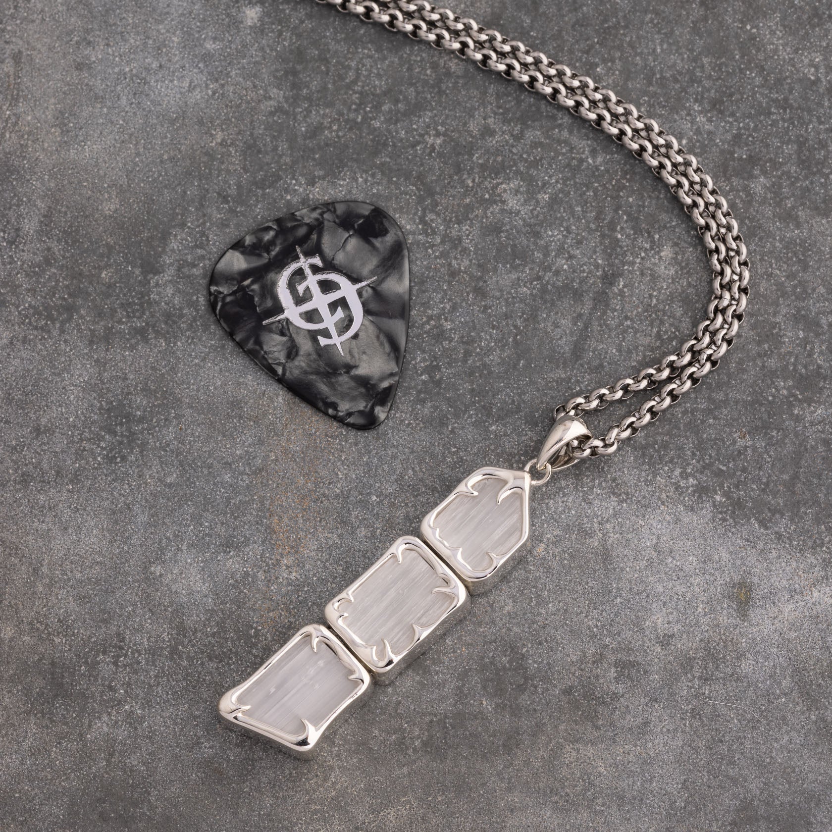 Handcrafted sterling silver pendant with three Selenite stones. Pendant is 45mm long and 8mm wide. Pendant comes on a 55cm long x 3mm thick stainless steel chain.
