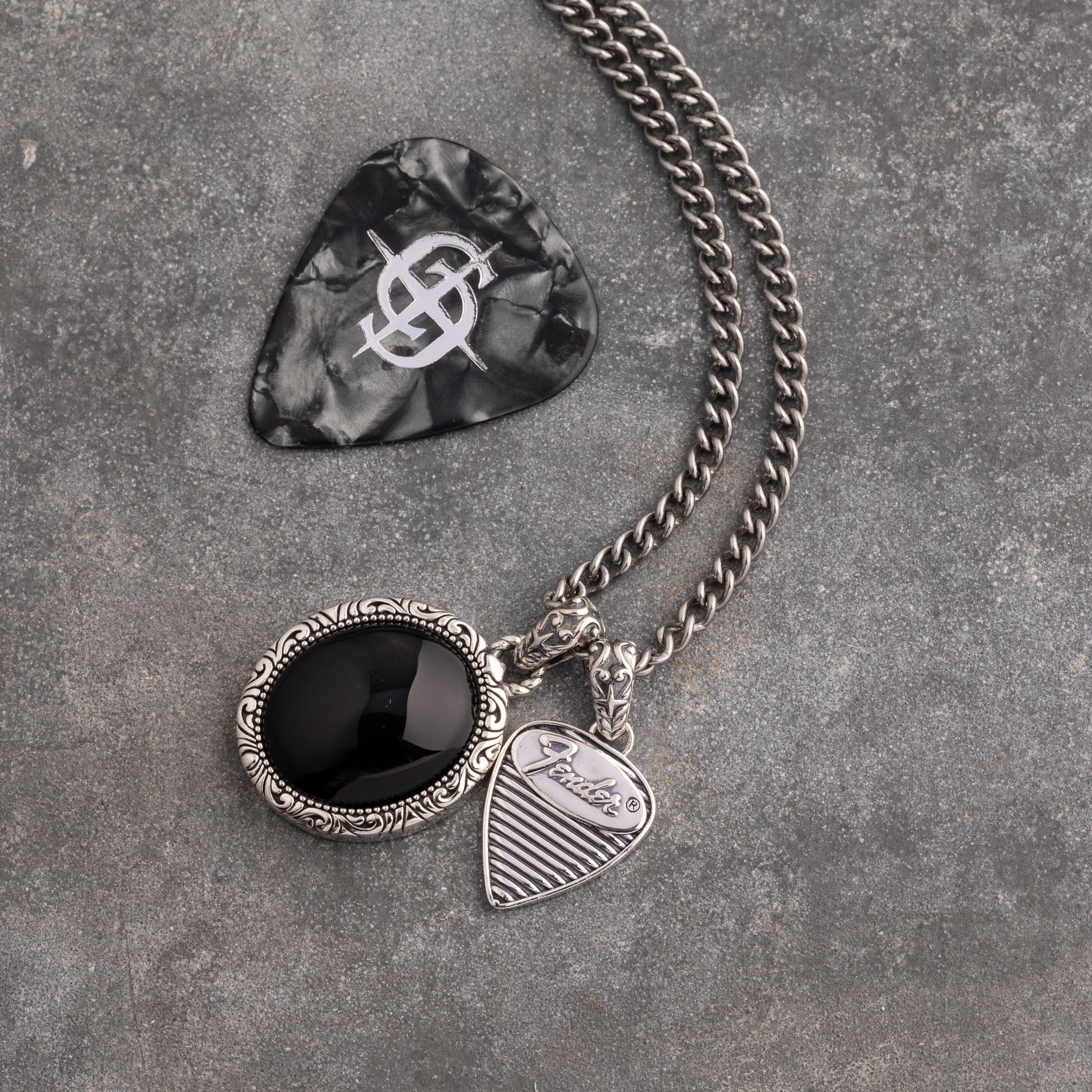 Some songs stay with you forever. Rhapsody captures that feeling with a polished black onyx centerpiece, framed by intricate detailing that echoes the craftsmanship of a well-loved instrument. A Fender-etched guitar pick charm completes the piece—because every great story deserves a soundtrack.