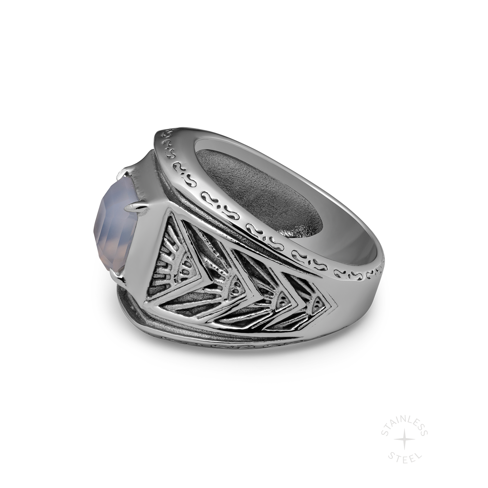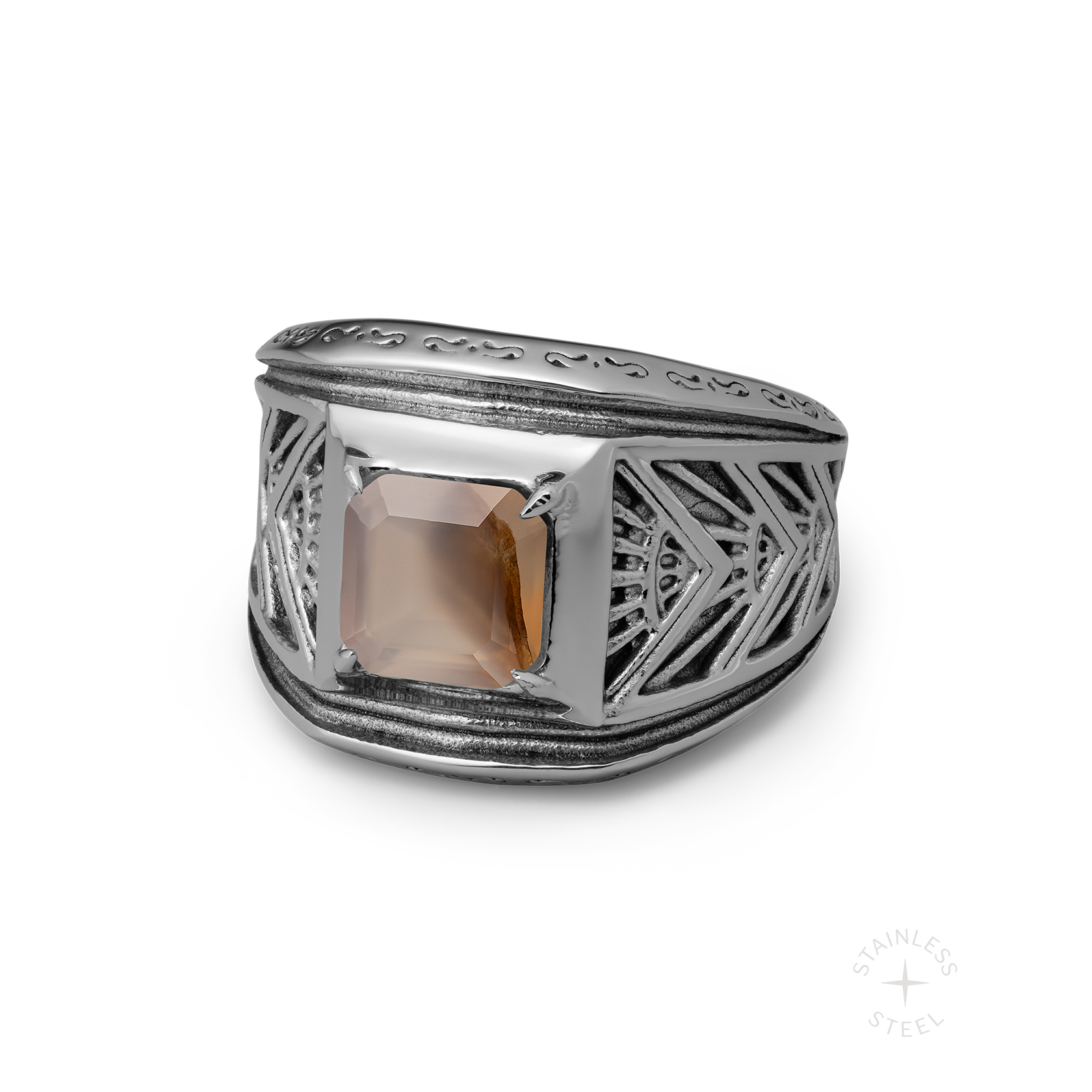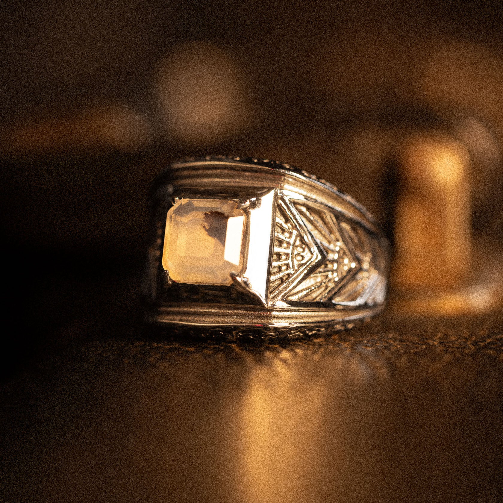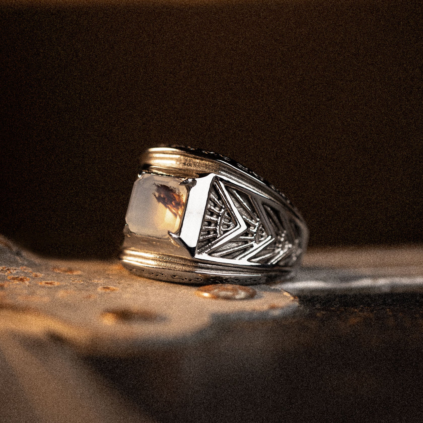 Allow yourself to get lost in the moment. Revel is cast in stainless steel with symmetrical Art Deco detailing and a Montana agate stone as a grounding force in the chaos, because balance is key to any good time.