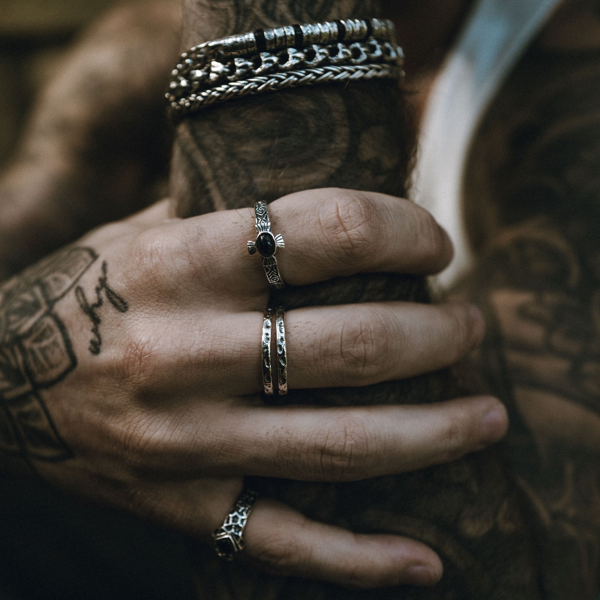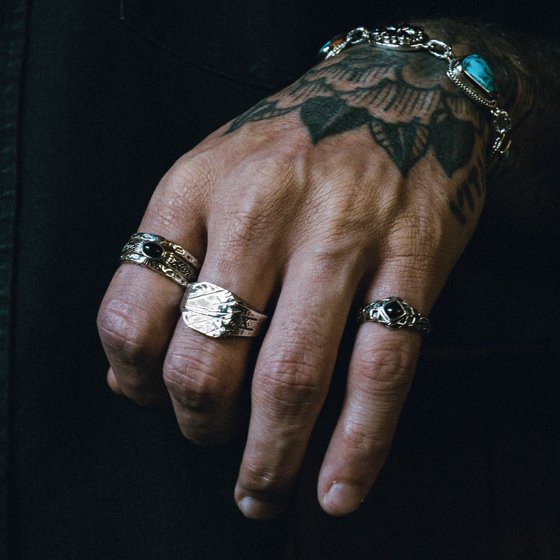 Worn silver with rough edges and a black onyx stone at its heart. Like a weathered saddle or a long ride through dust and grit — made for those who carry their past hard and true, no polish, just honest grit.