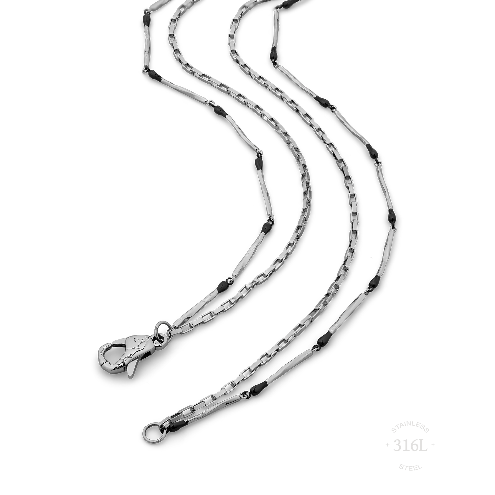Stainless steel. Shorter chain is 50cm long, longer chain is 58cm long. Both chains have a gauge of 2.5mm wide.