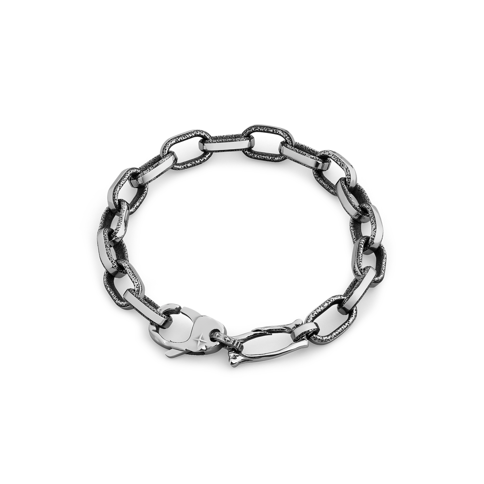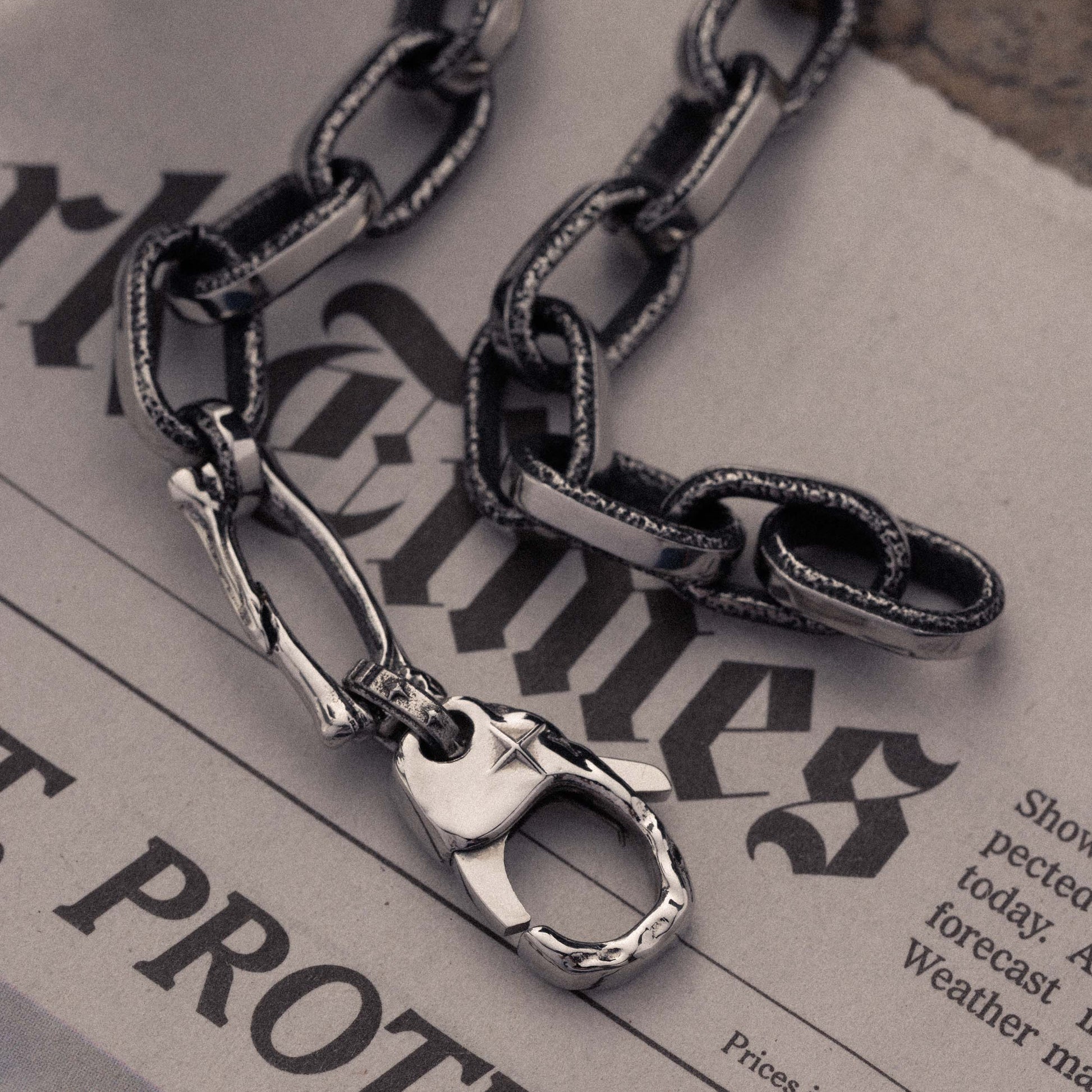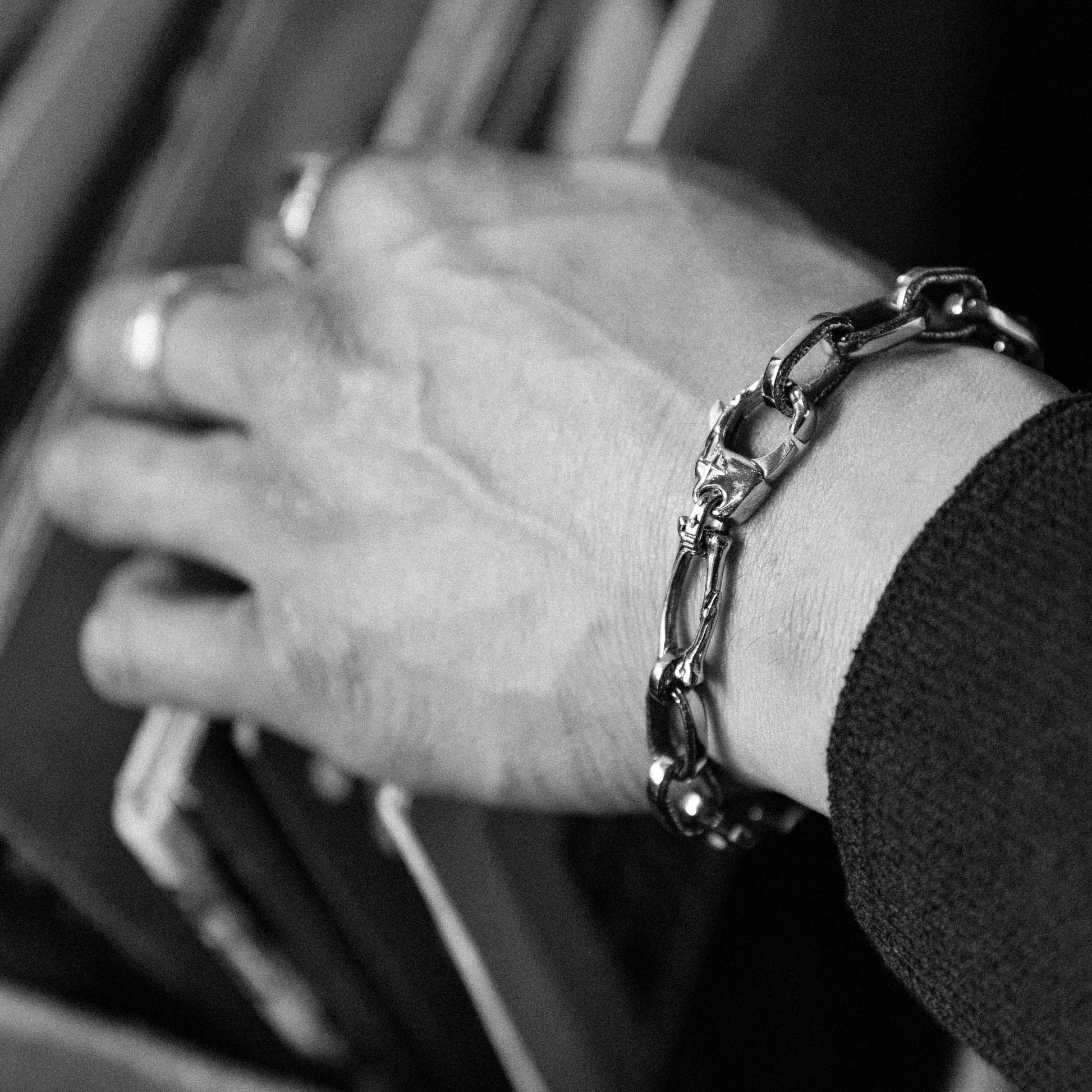 Broken bones heal. Steel doesn’t break. The polished outside and textured interior tell two sides of the same story — and the one wearing it probably could too. One of the links is shaped like a fractured radius bone: unexpected, a little brutal, and exactly the point. Part of the 316 steel collection. Solid where it counts.