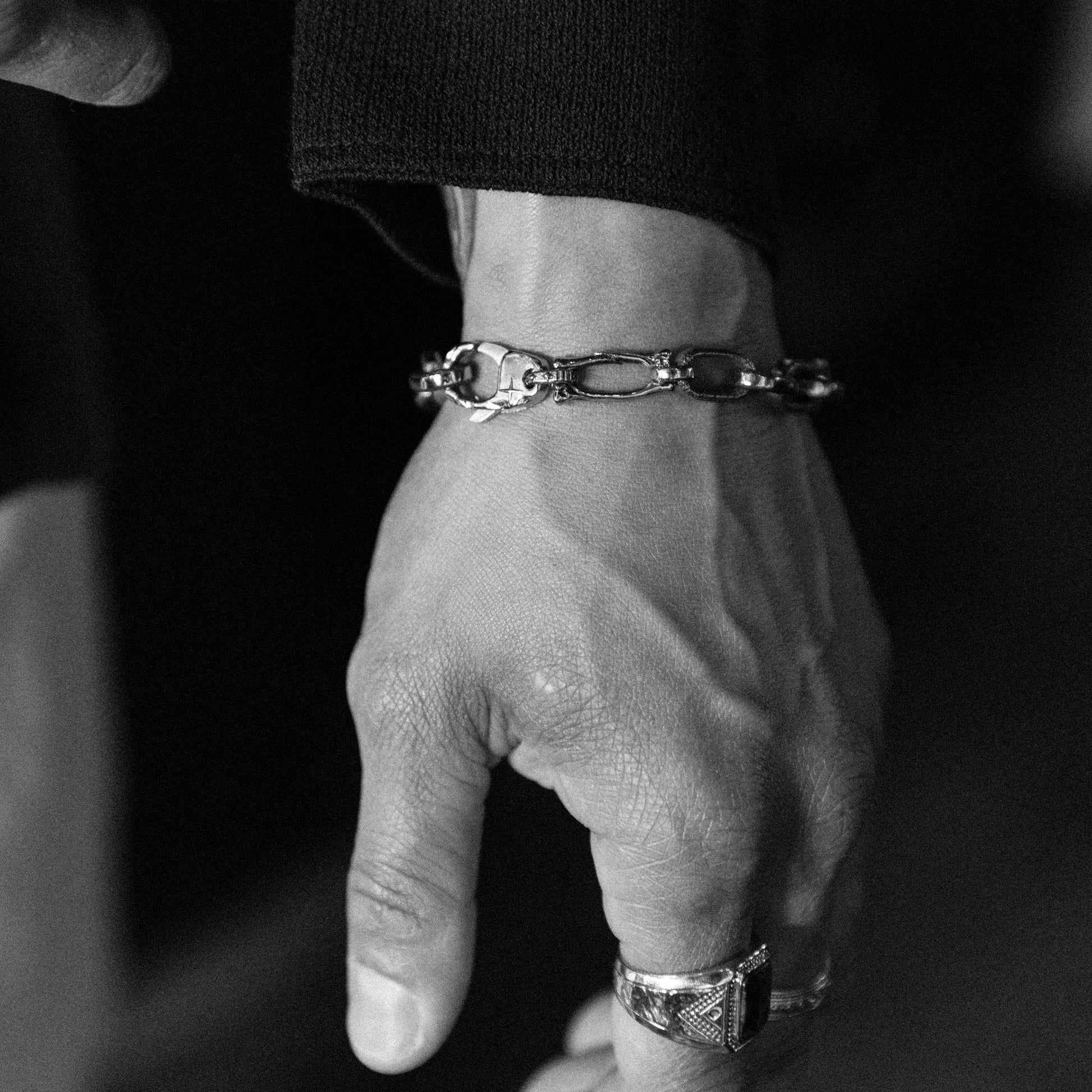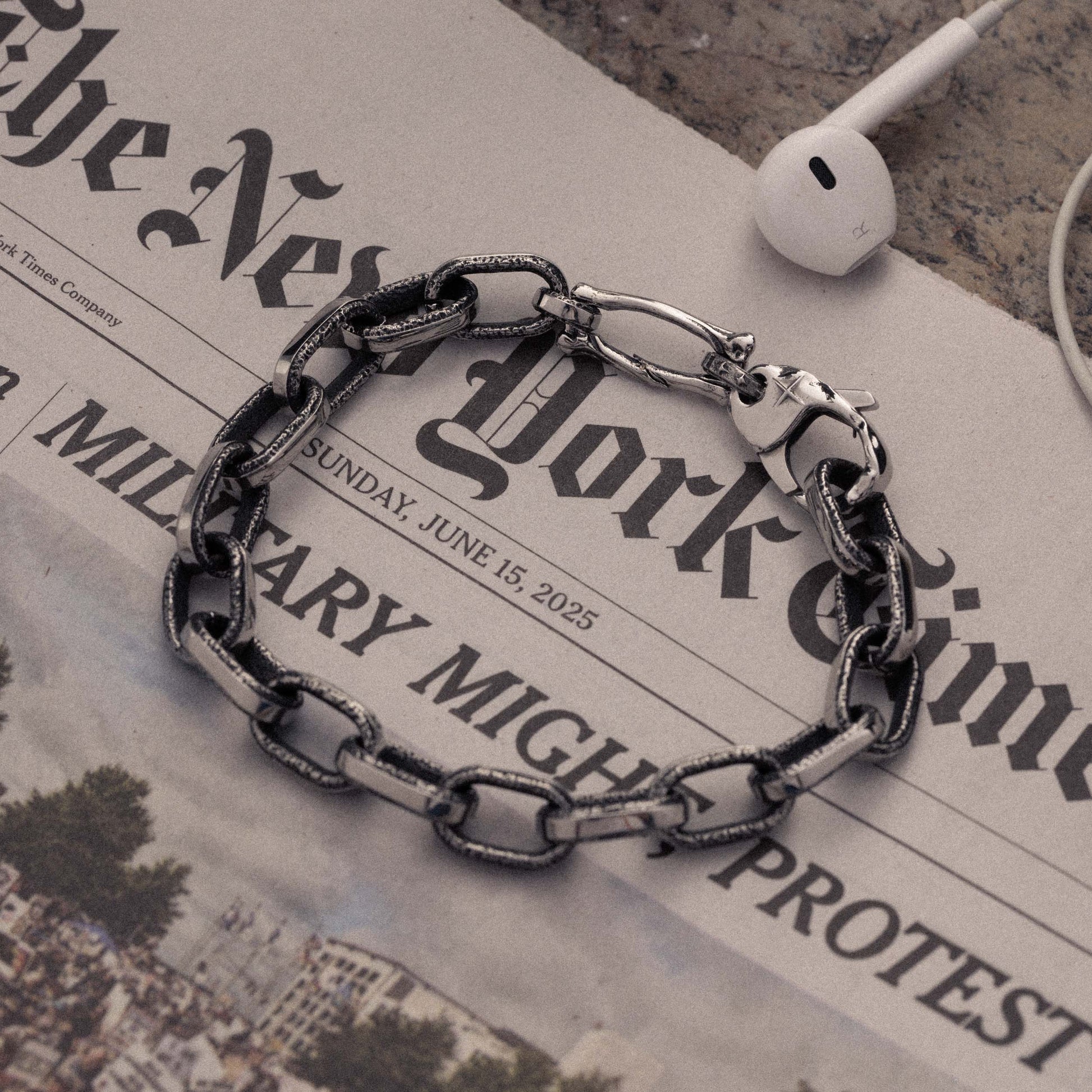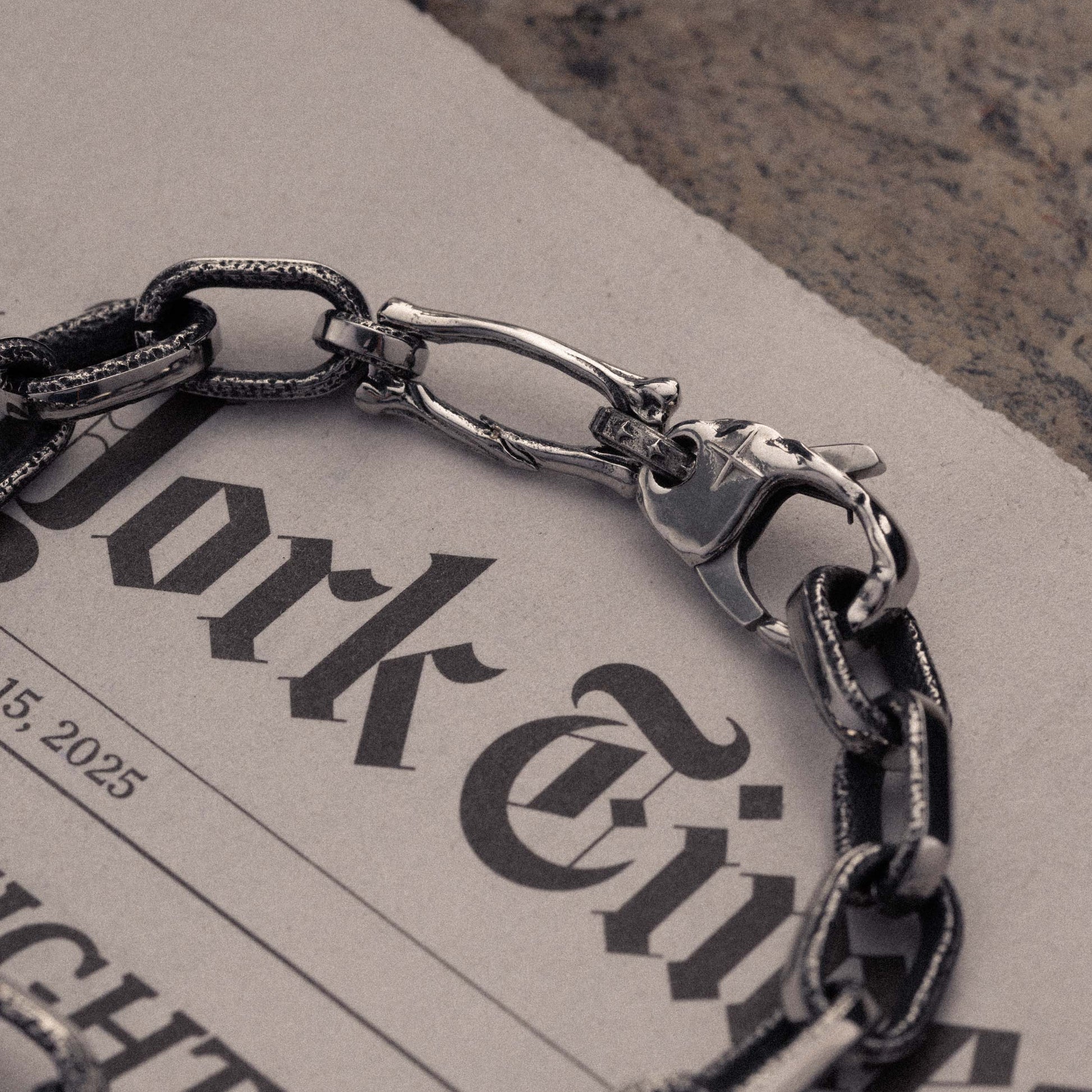 Broken bones heal. Steel doesn’t break. The polished outside and textured interior tell two sides of the same story — and the one wearing it probably could too. One of the links is shaped like a fractured radius bone: unexpected, a little brutal, and exactly the point. Part of the 316 steel collection. Solid where it counts.