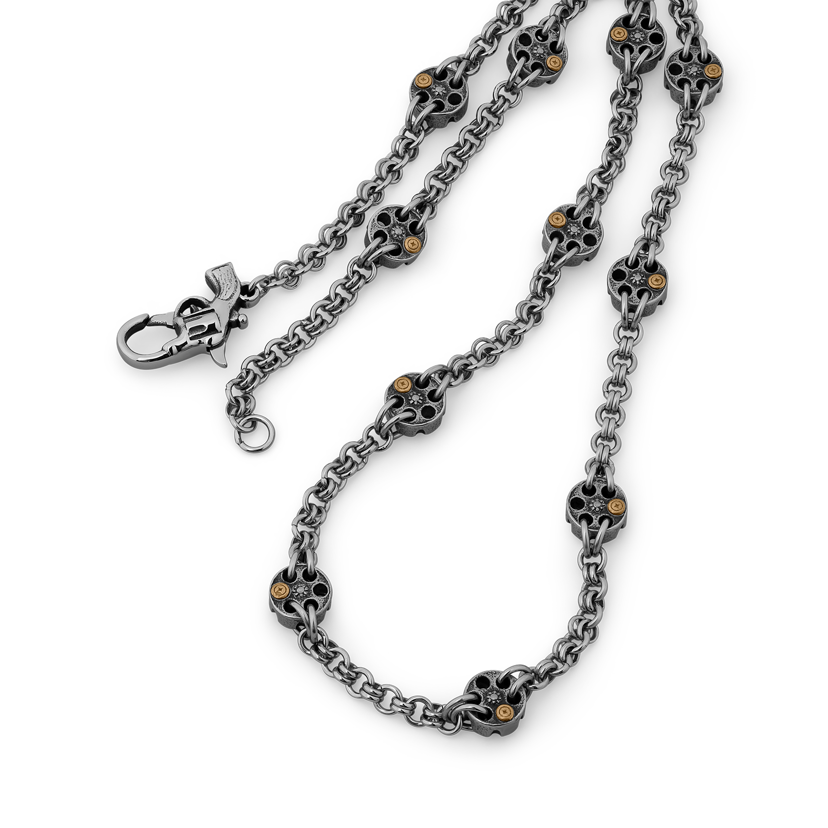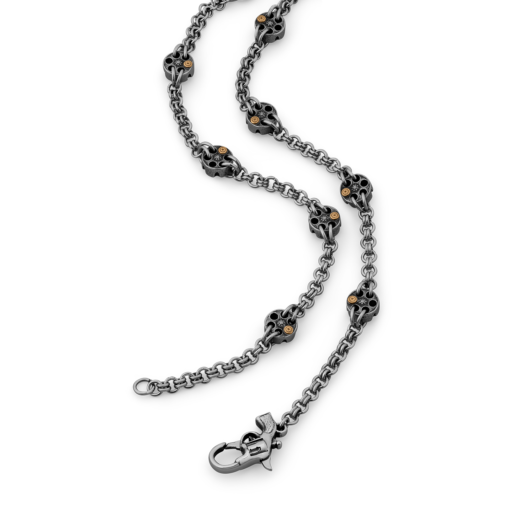 You’re not loud, but people tend to notice. Revolver is a chain made from linked revolver cartridges — each one set with a small brass bullet, because subtle doesn’t have to mean boring. It’s sharp, detailed, and built like you don’t mind getting a second look. Part of the 316 steel collection. No safety on this one.