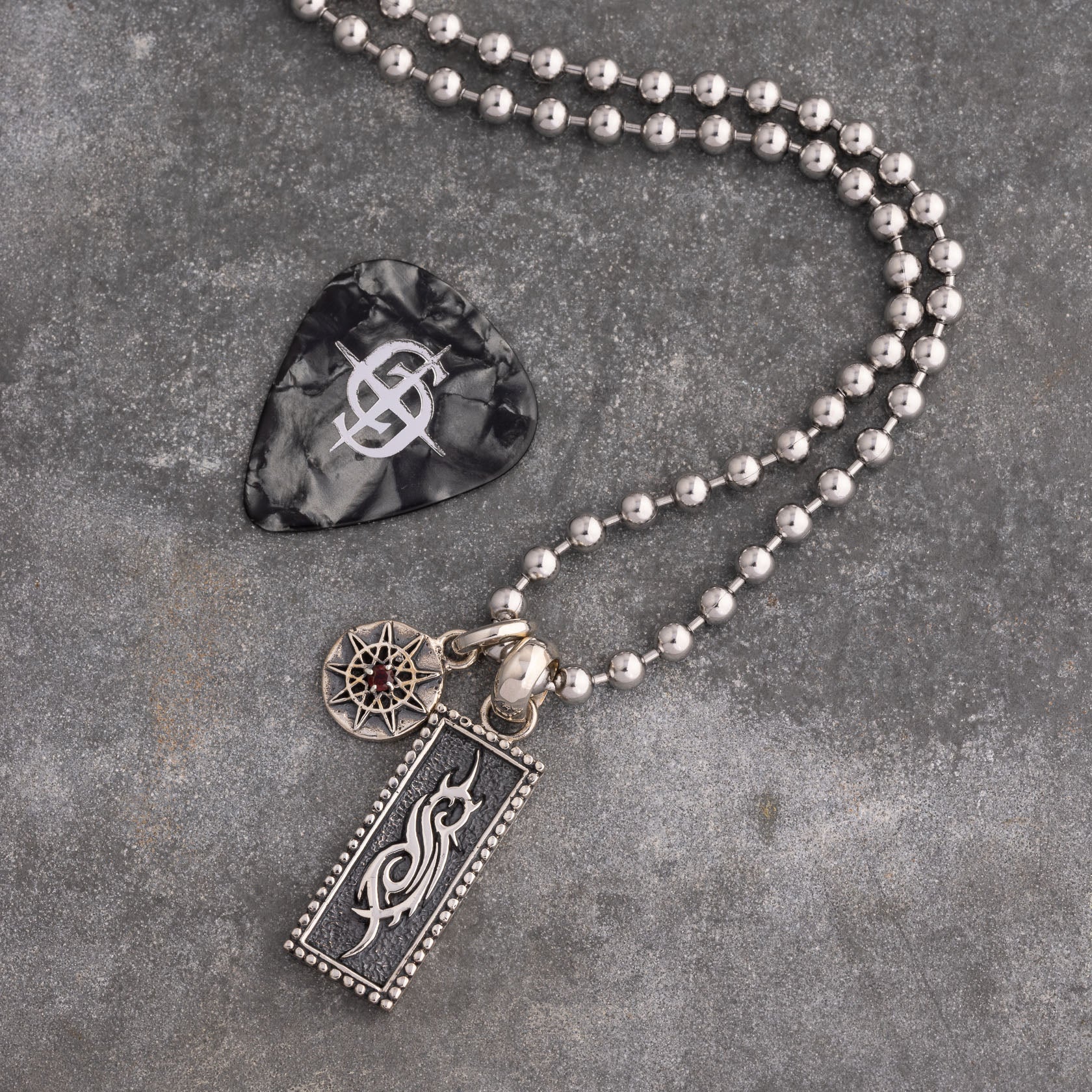 Built around the iconic tribal "S" and Slipknot's 9-pointed star. Finished with a blood-red stone at the centre.