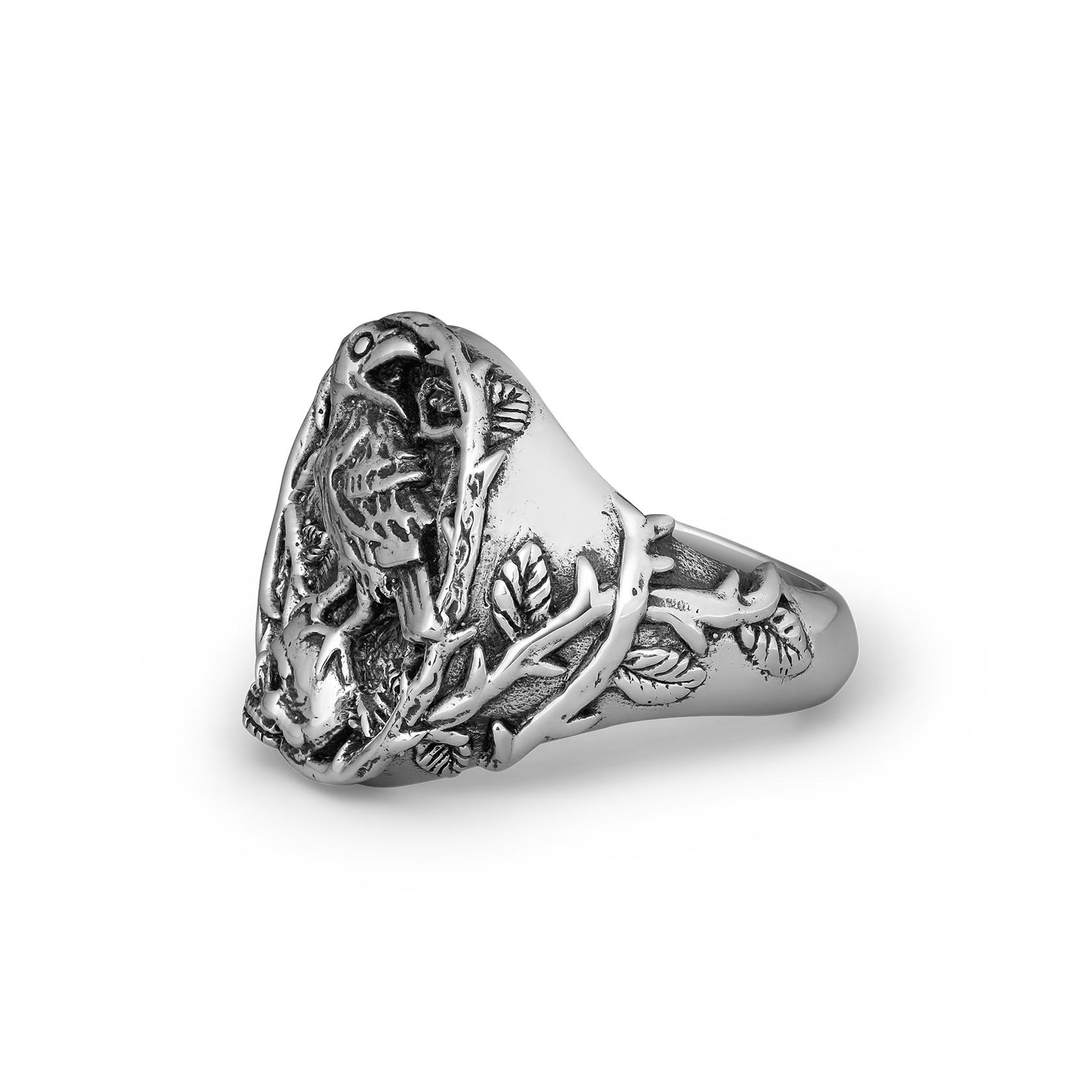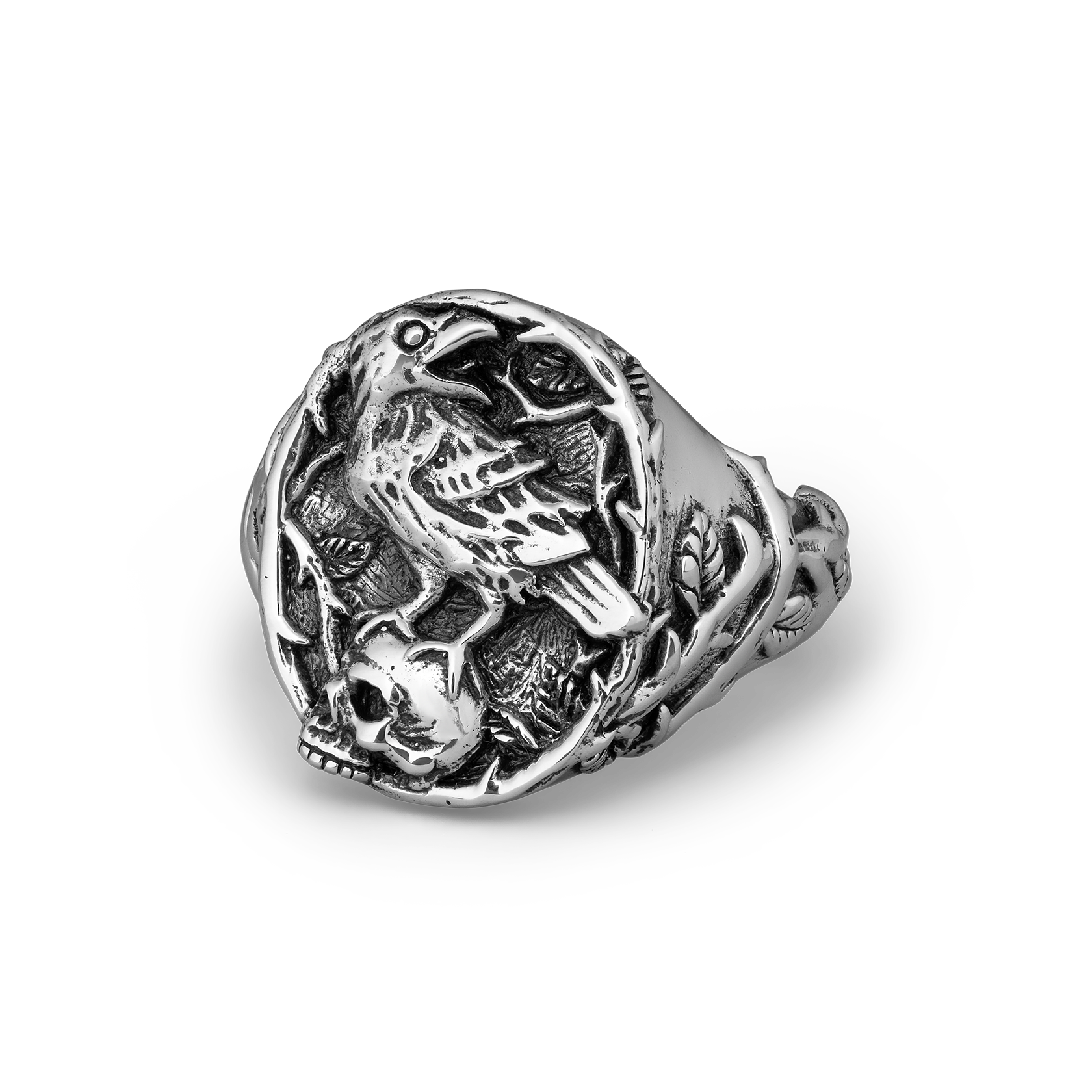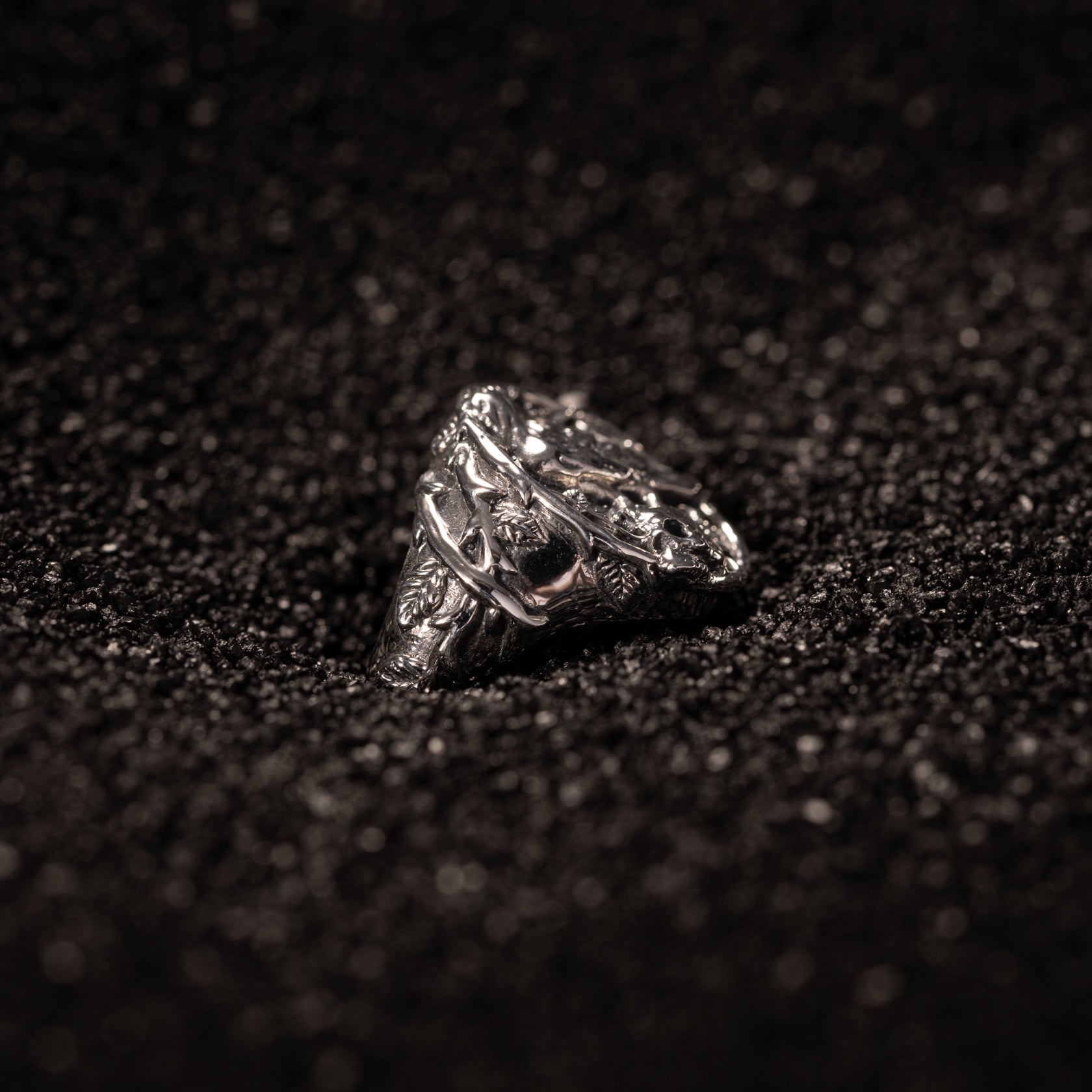 A raven sits in stillness - not flying, not fleeing. Just watching. Waiting. Like the part of us that never forgets. This ring was built for that kind of quiet. Inspired by Poe’s fixation with memory, loss, and everything we try to bury but can’t, its band twists with ivy and thorns, carved in heavy silver like something pulled from the earth. It’s grief made tangible — the kind that lingers in your chest long after the noise is gone.