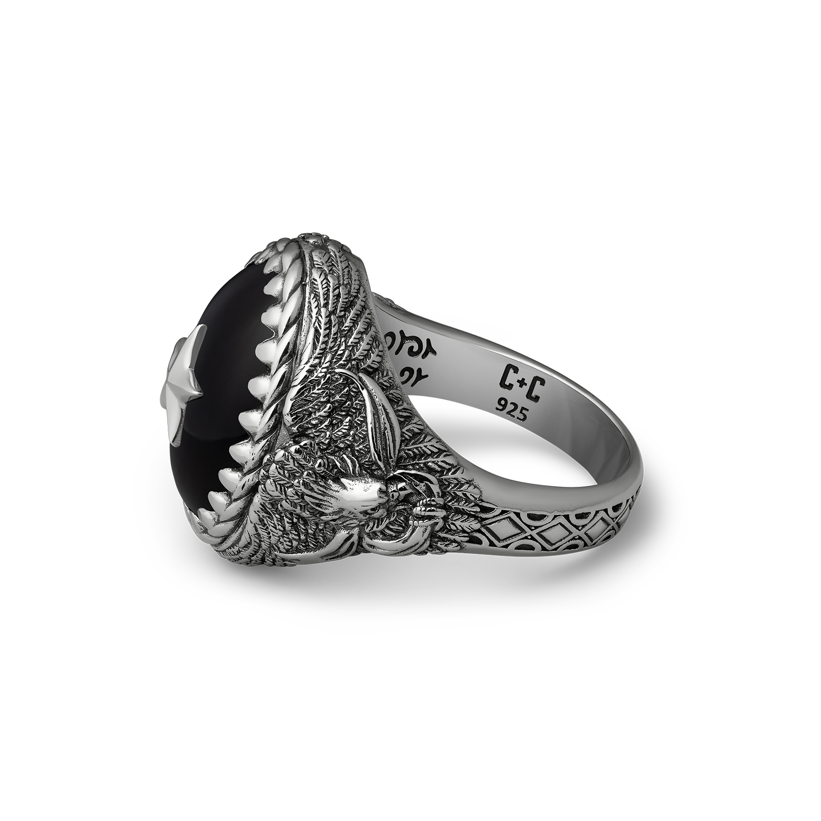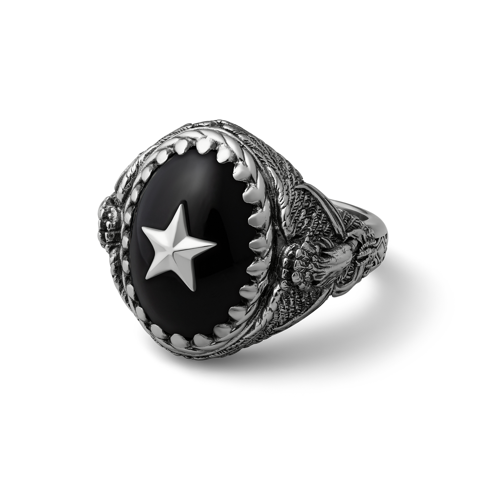 Handcrafted sterling silver ring with a Black Onyx stone. Twin eagles and feathers are carved around the bend, with a silver star anchored in the center of the stone.