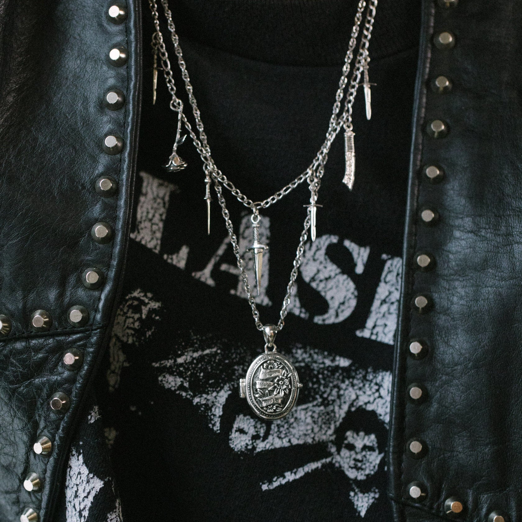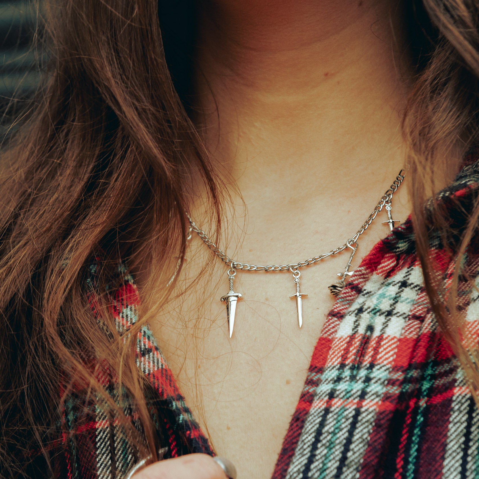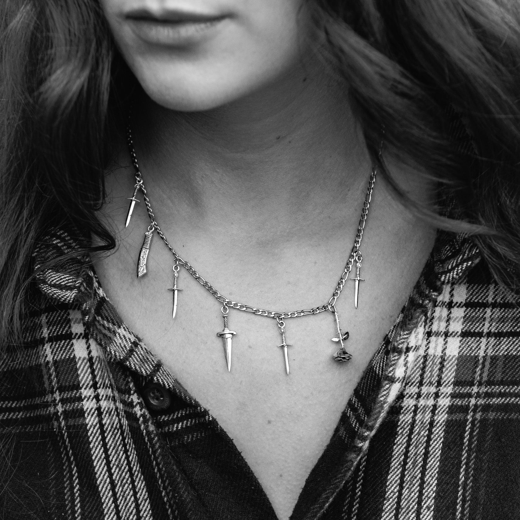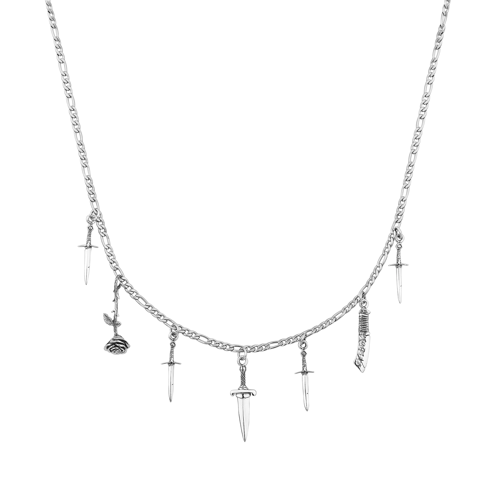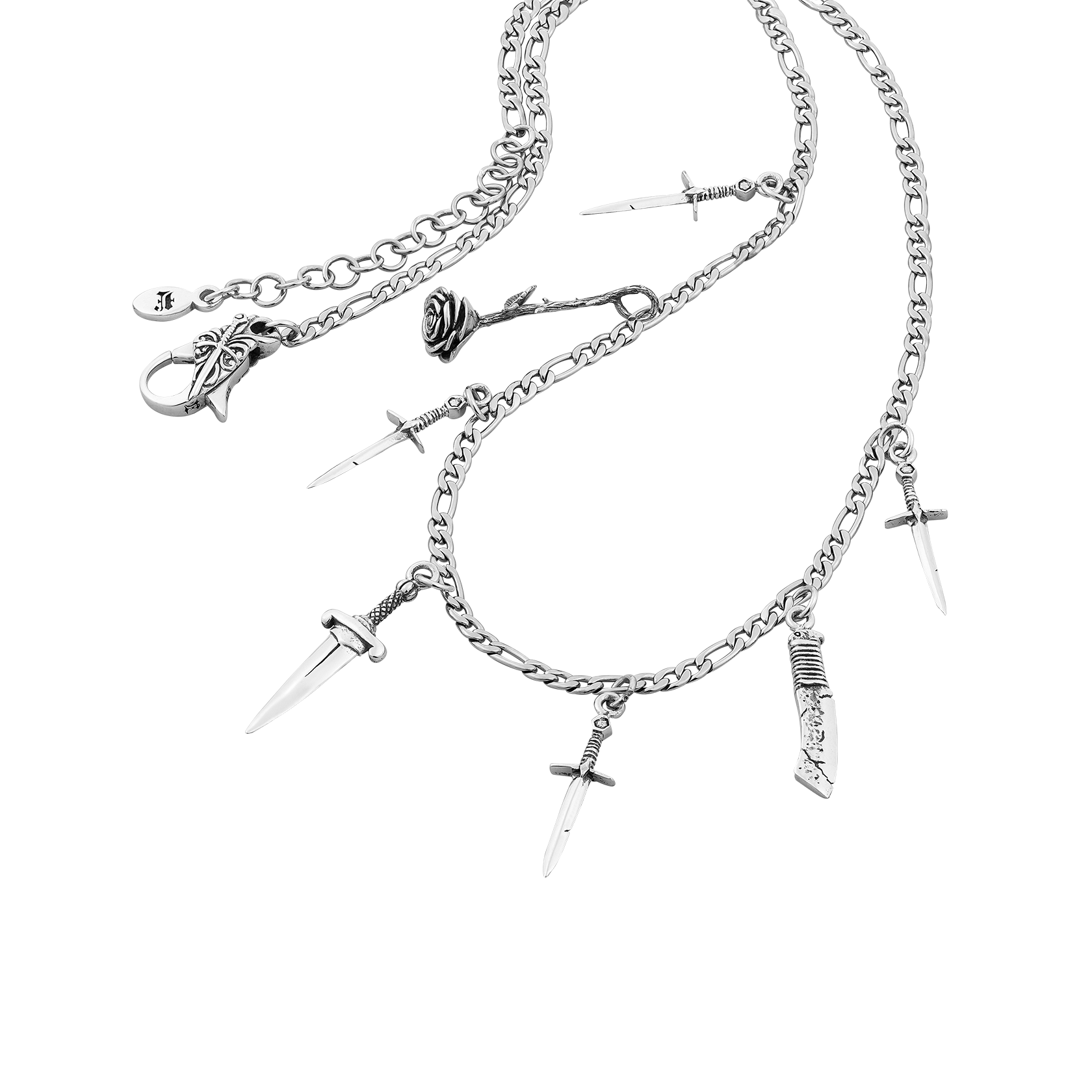 The Chopping Block chain is crafted for those who know the price of trust. Adorned with miniature blades, each link speaks to the fine line between ally and adversary. This piece is a quiet warning: stay sharp, and always watch your back.