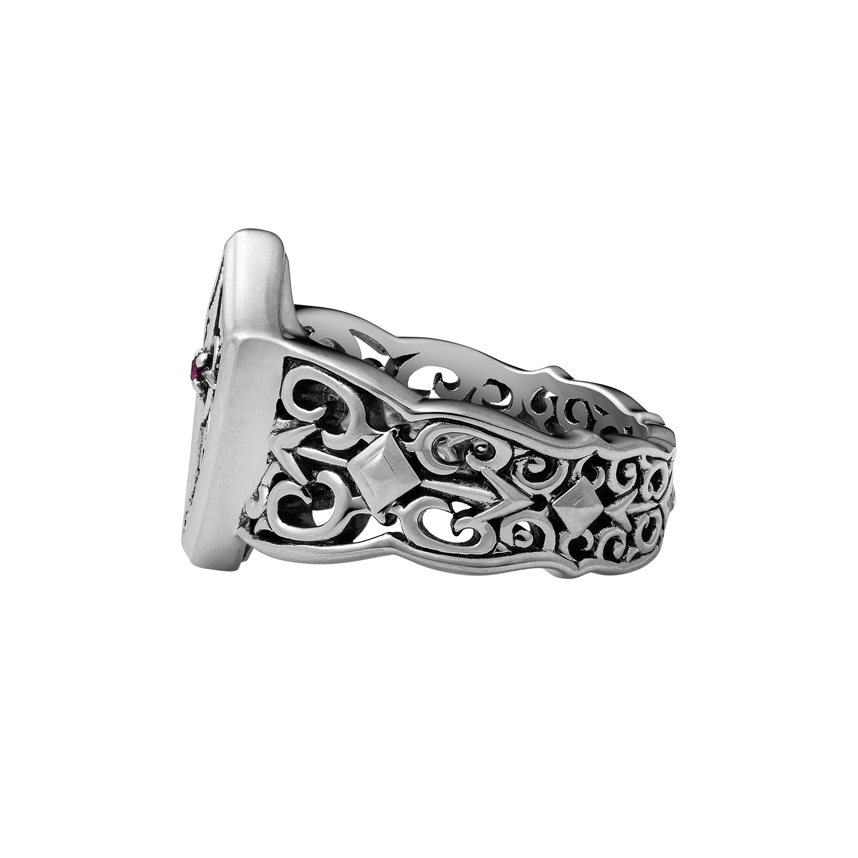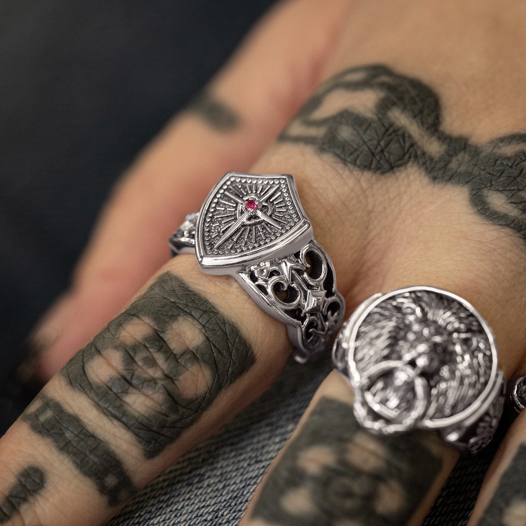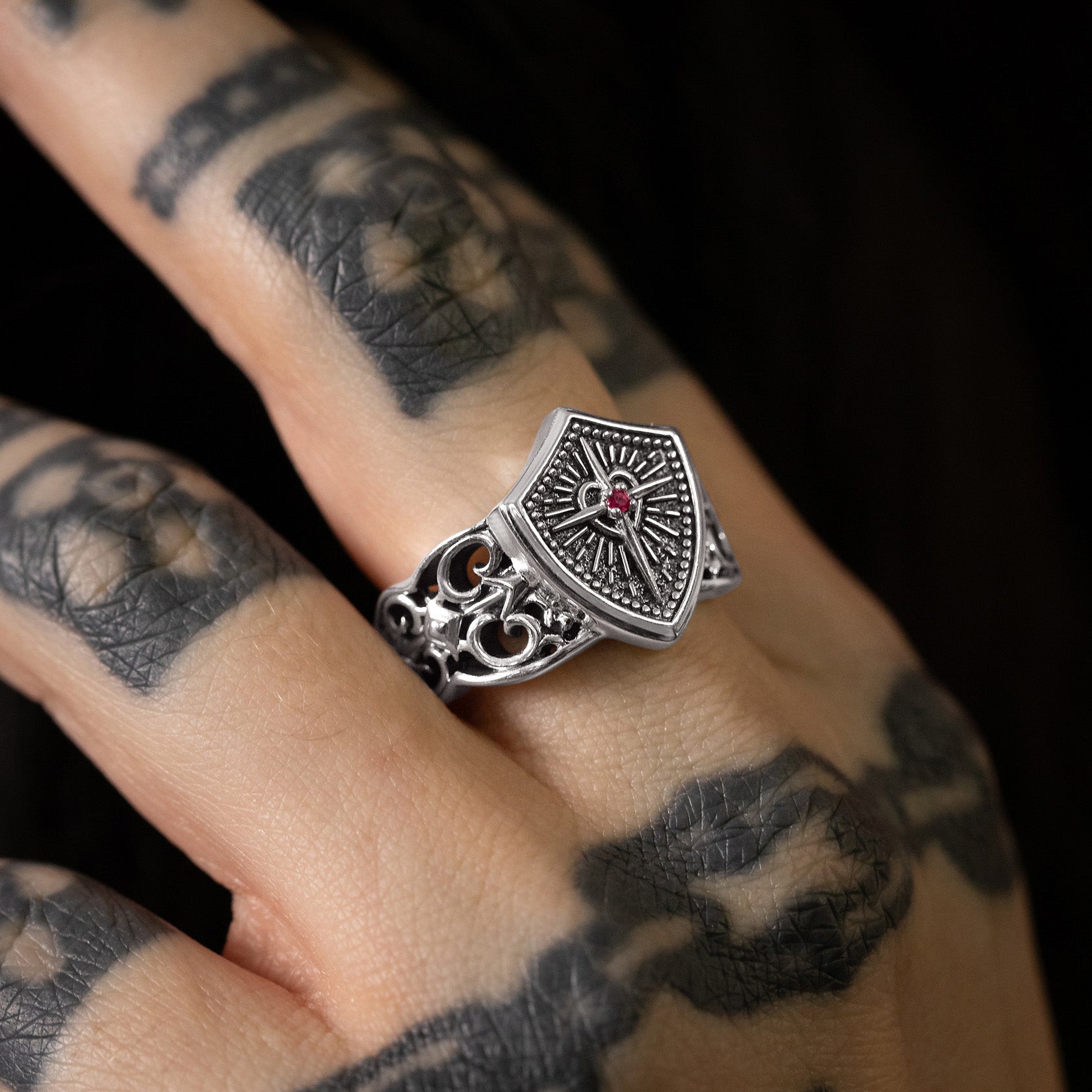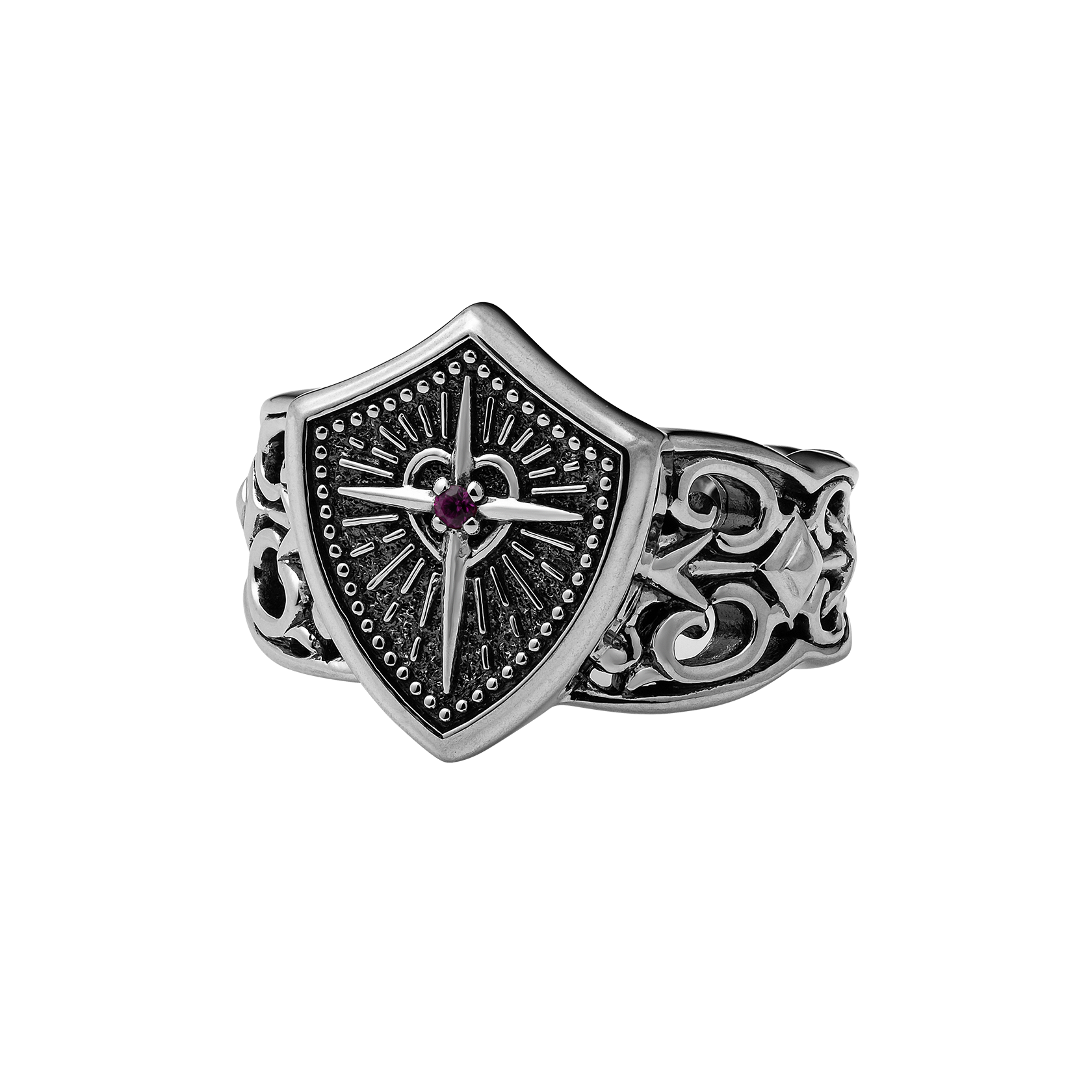 This Medieval shield ring features a ruby center serving as your reminder to lead with bravery and always follow your heart.