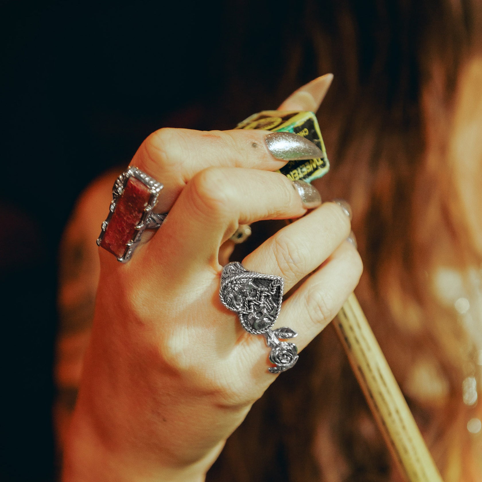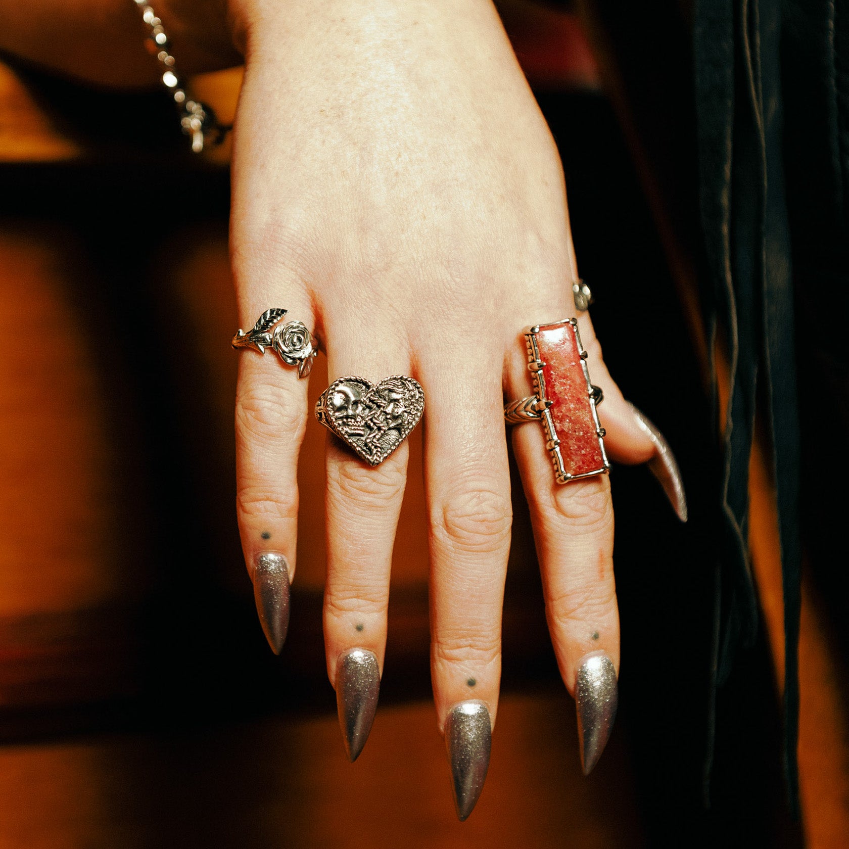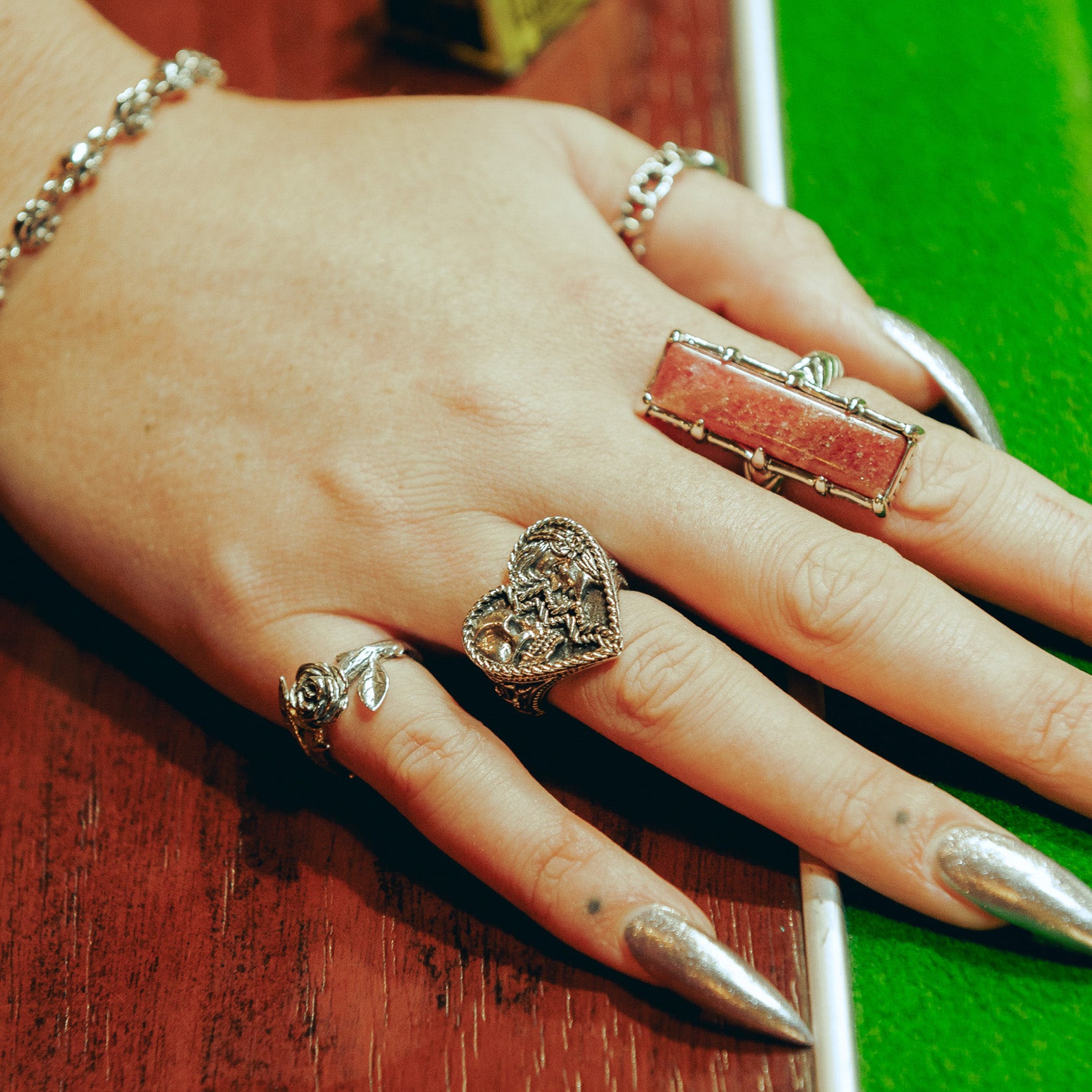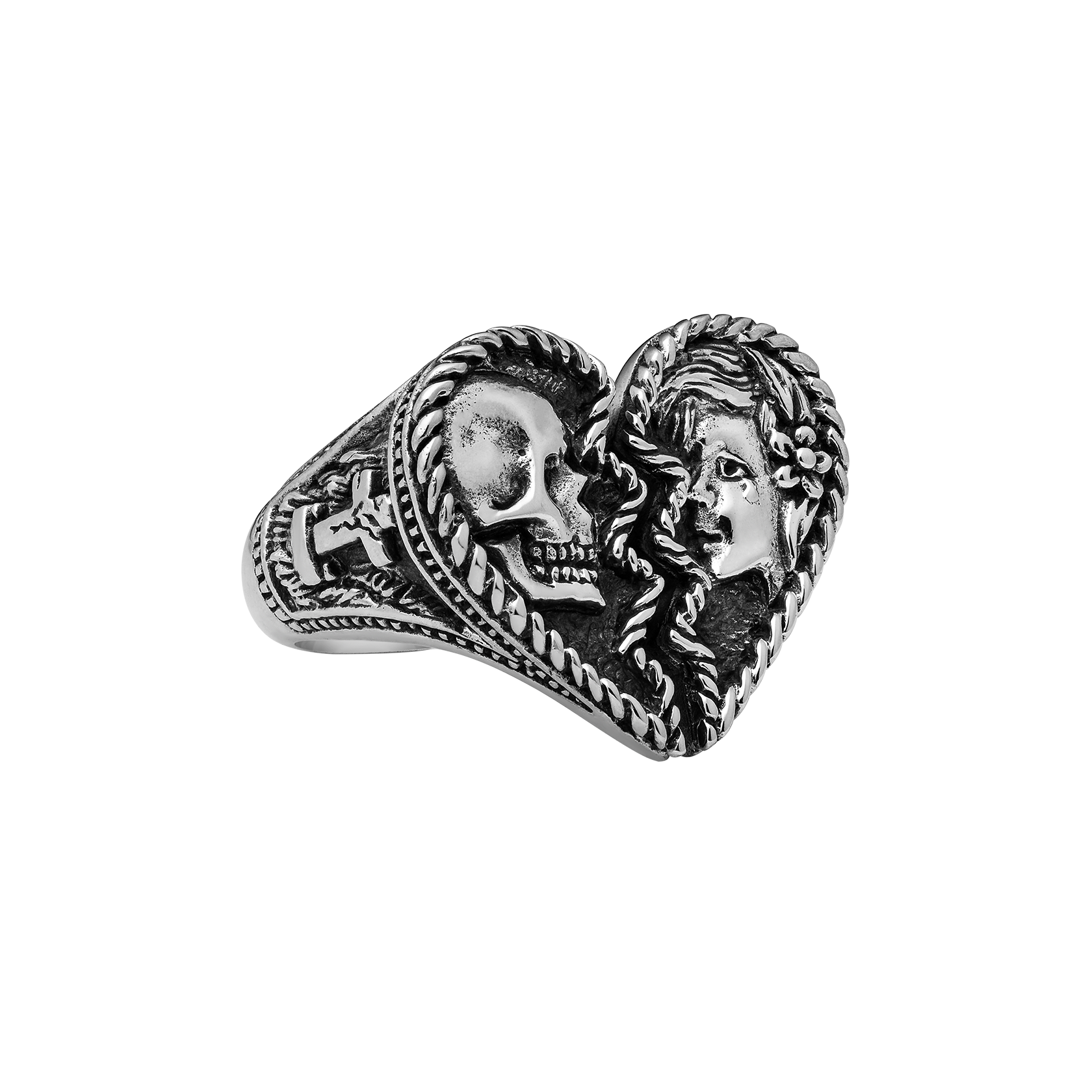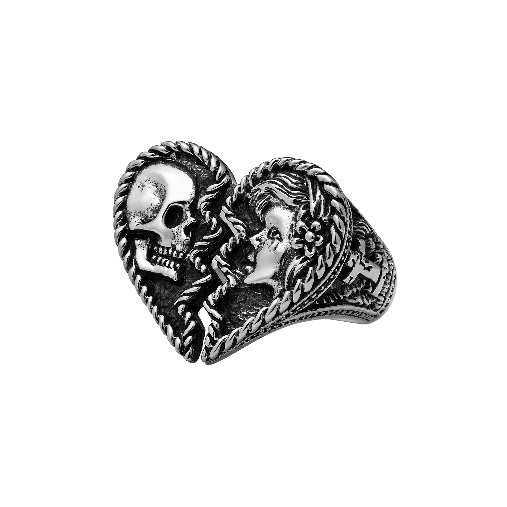 This broken heart ring parts its two characters down the center, filled only with the agony of a love lost.