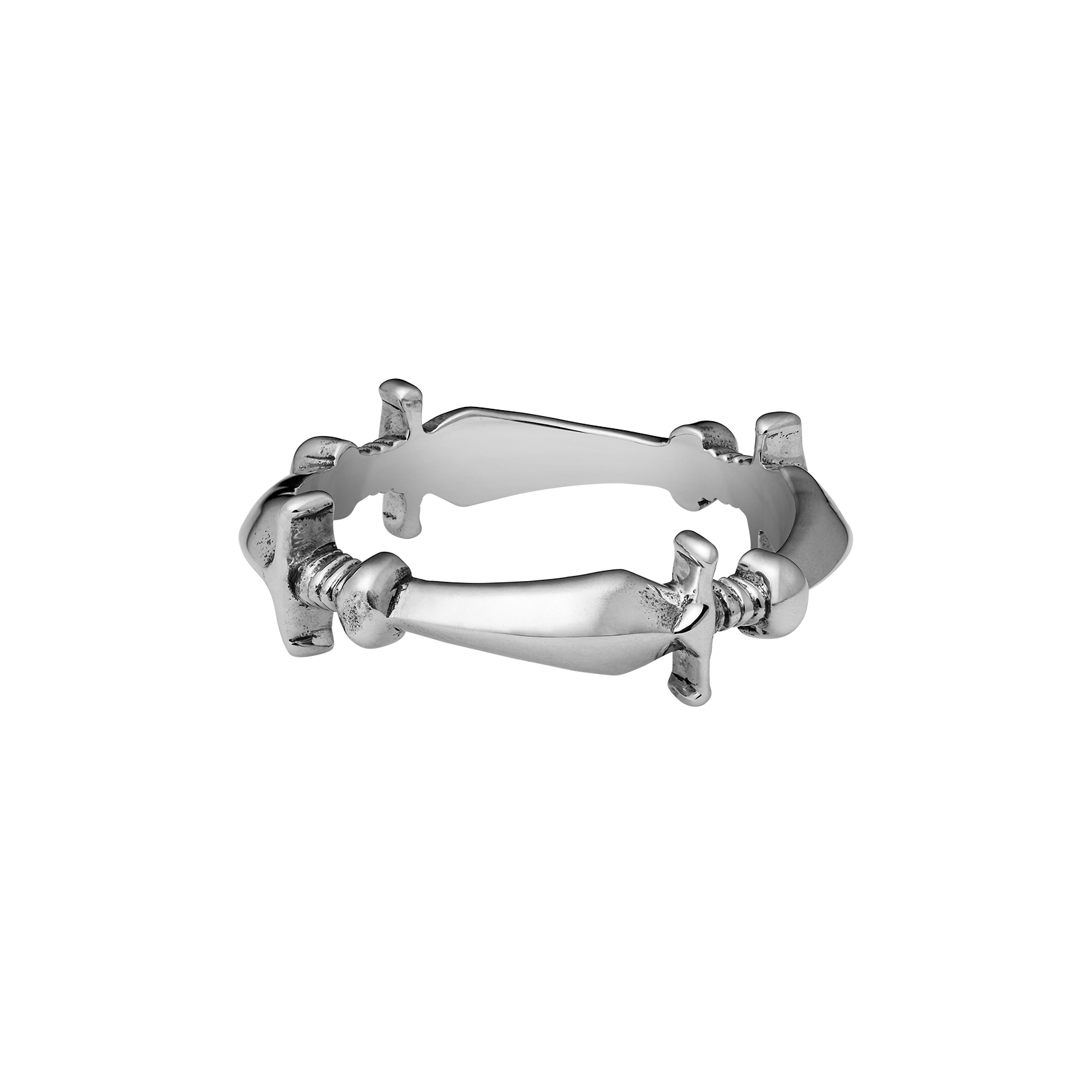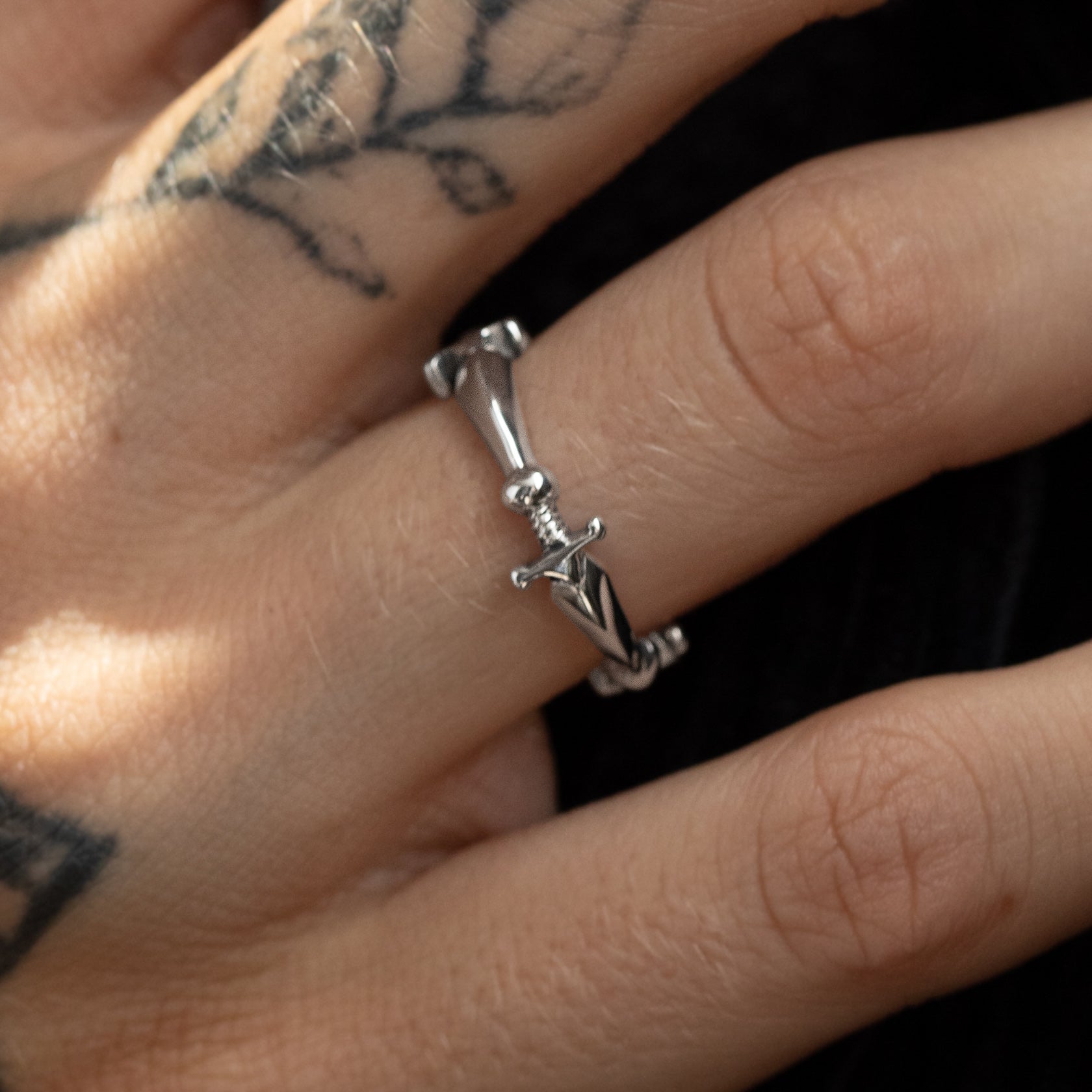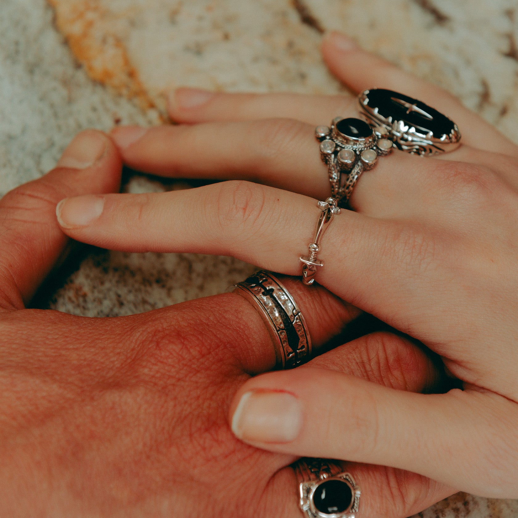 Crafted with a series of linked daggers, the Til Death ring (Hers) is a symbol of love’s fierce and unbreakable bond. When paired with its counterpart, it represents a promise carved in silver—a reminder that true connections remain sharp, even as they endure.
